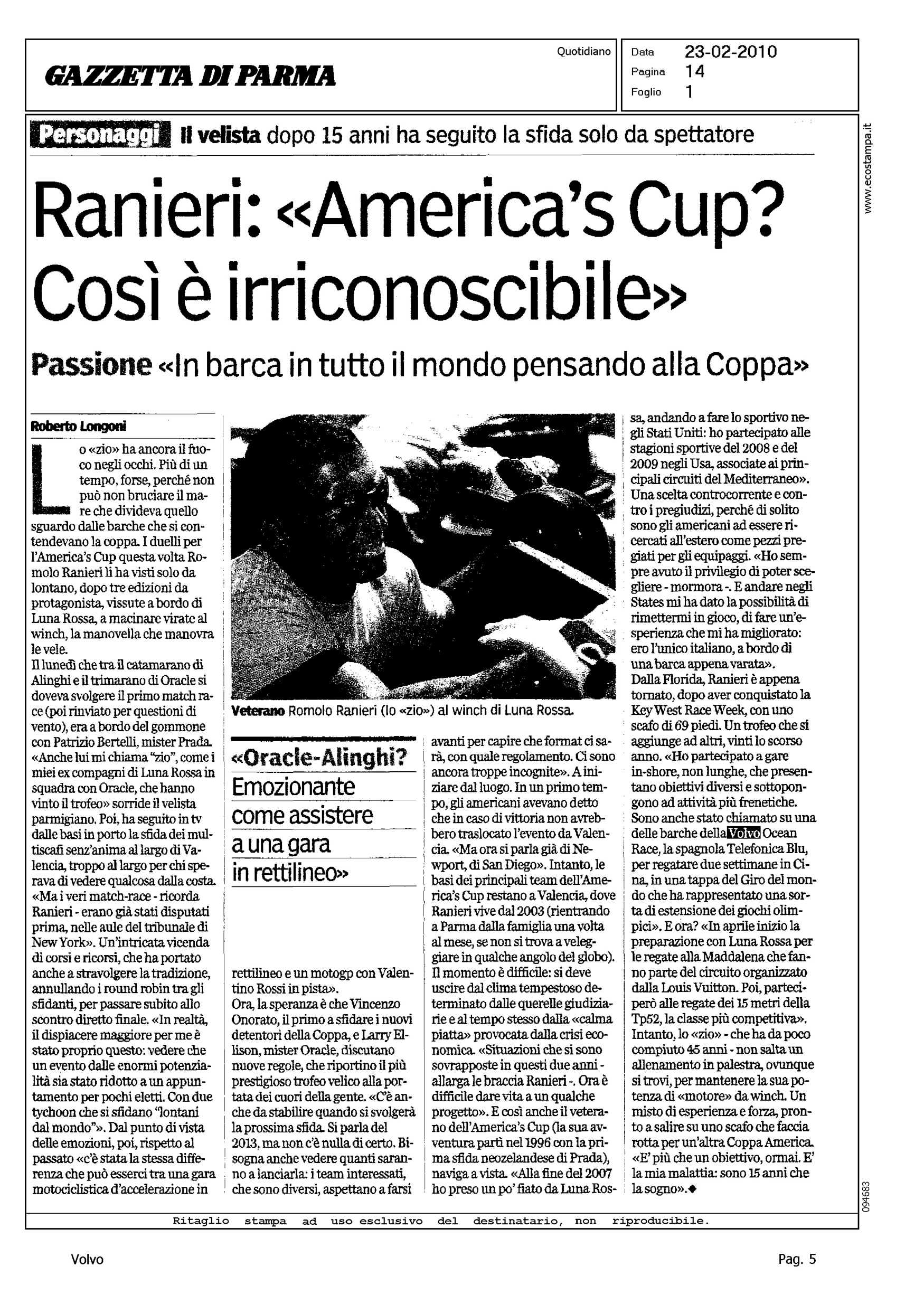 Author: LONGONI, ROBERTOLine: Corporate Model: Corporate Subject: Volvo Ocean Race Title: RANIERI: "AMERICA'S CUP? COSI' E' IRRICONOSCIBILEHighlight: CITAZIONE