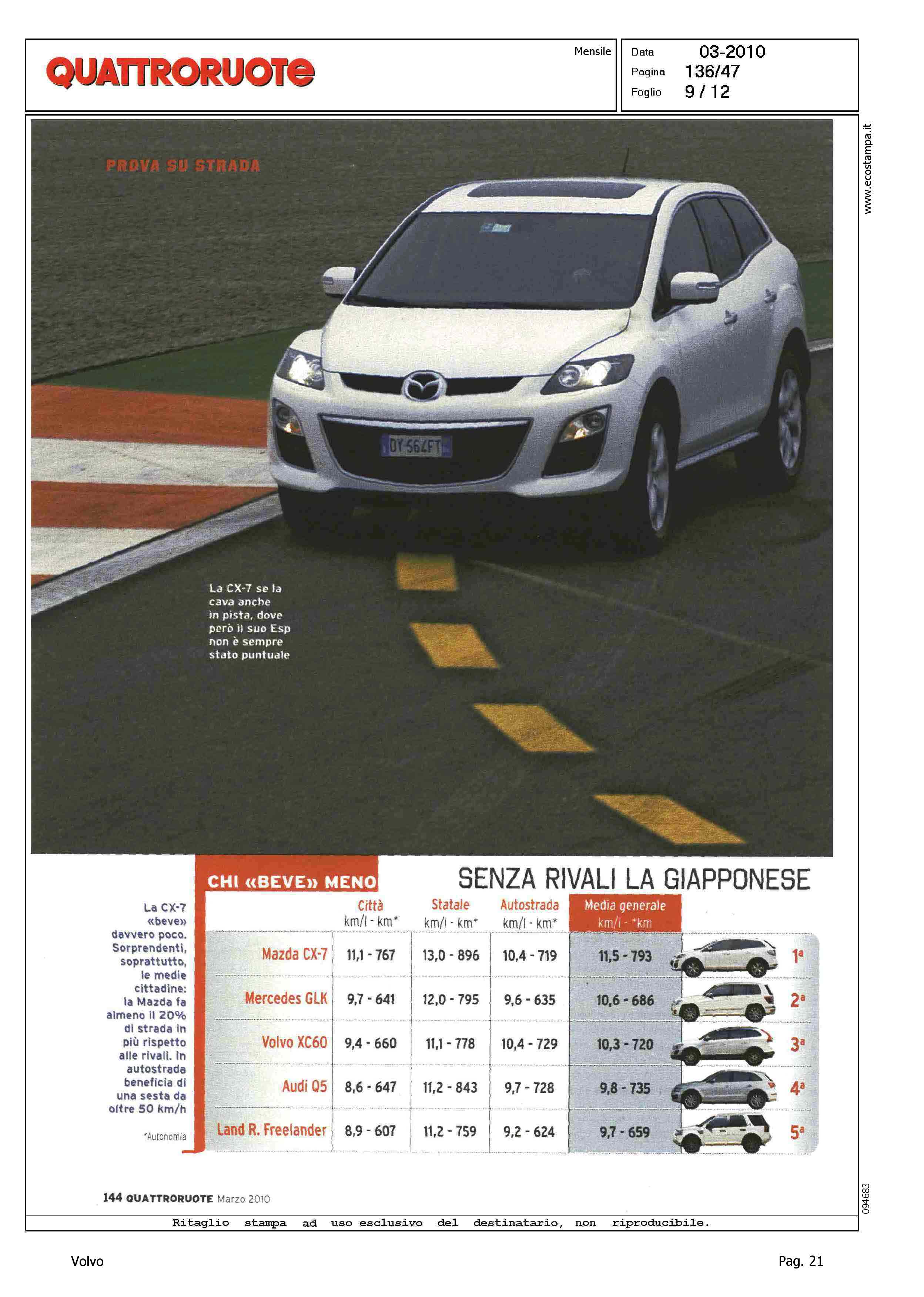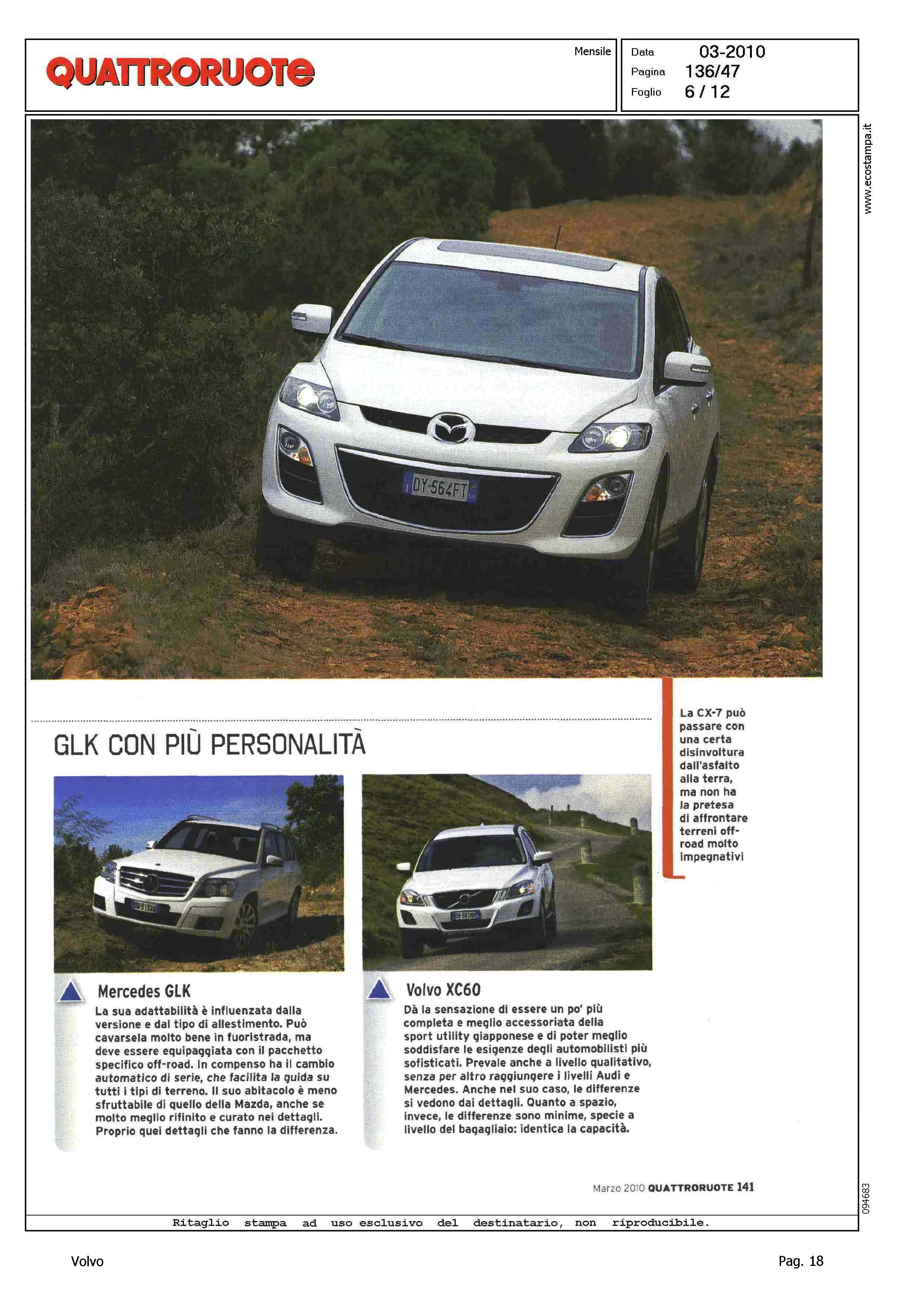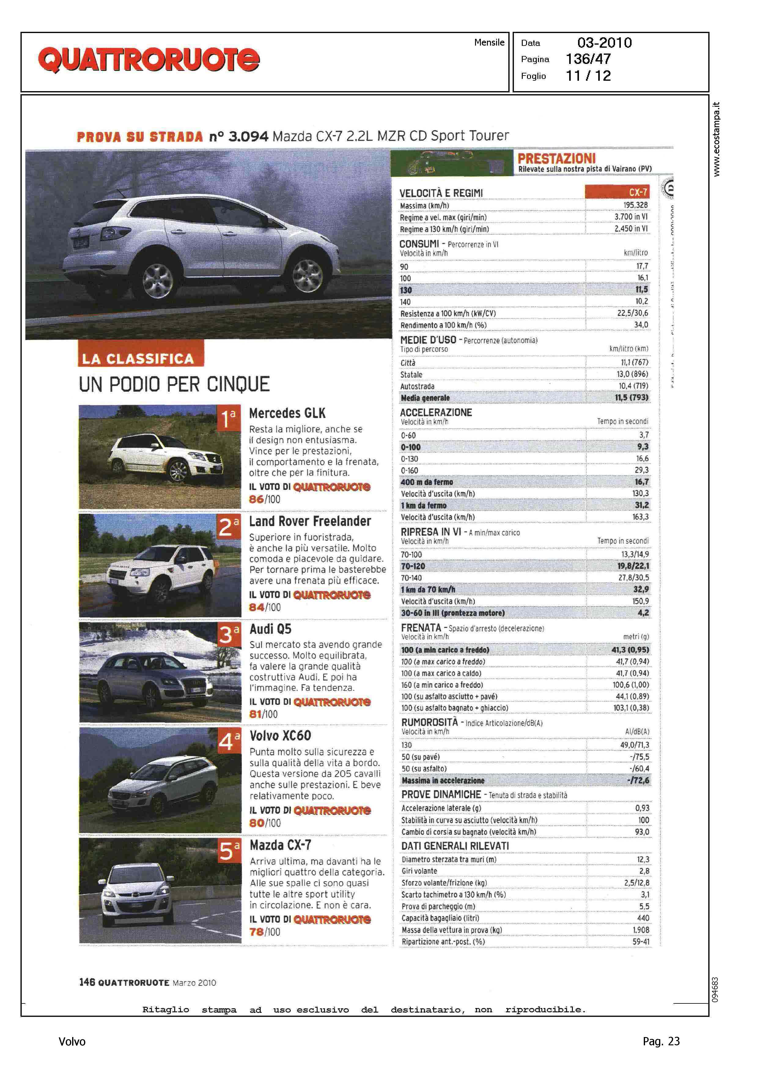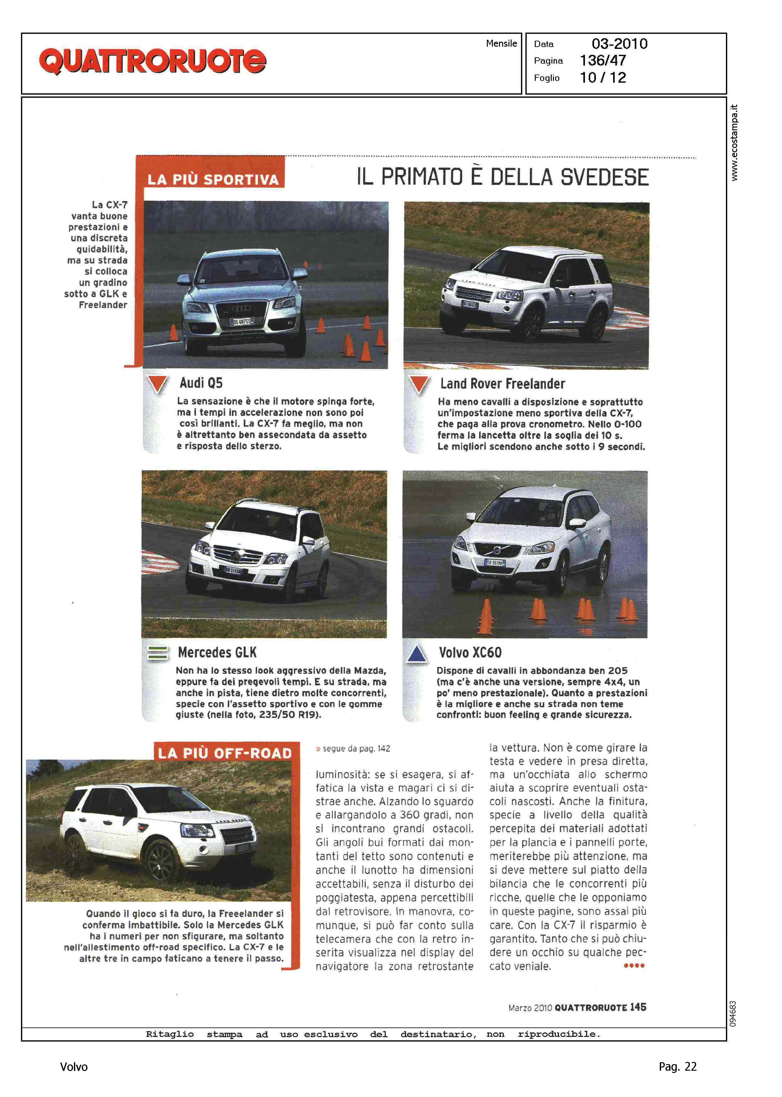 Highlight: TEST DRIVE CX-7 - LE COMPETITOR: AUDI Q5 - LAND ROVER FREELANDER - MERCEDES GLK - VOLVO XC60 - XC60 D5 205CV: PIU' COMPLETA ED ACCESSORIATA - TARGET AUTOMOBILISTI 'SOFISTICATI' - PREVALE A LIVELLOO QUALITATITO SENZA RAGGIUNGERE AUDI E MERCEDES - DIFFERENZE NEI DETTAGLI - SPAZIO: DIFFERENZE MINIME - PIU' SILENZIOSA DELLA CX-7 MA PIU' RIGIDA - RUMOROSITA' IN ACCELERAZIONE - DATI COSTRUTTORE - POTENZA (205CV) IN ABBONDANZA - 4X4 MENO PRESTAZIONALE - PRESTAZIONI, E' LA MIGLIORE - ANCHE SU STRADA NON TEME CONFRONTI - FEELING E GRANDE SICUREZZA - PUNTA SU SICUREZZA E QUALITA' A BORDO - CONSUMI CONTENUTI - VOTO QUATTRORUOTE, 80/100