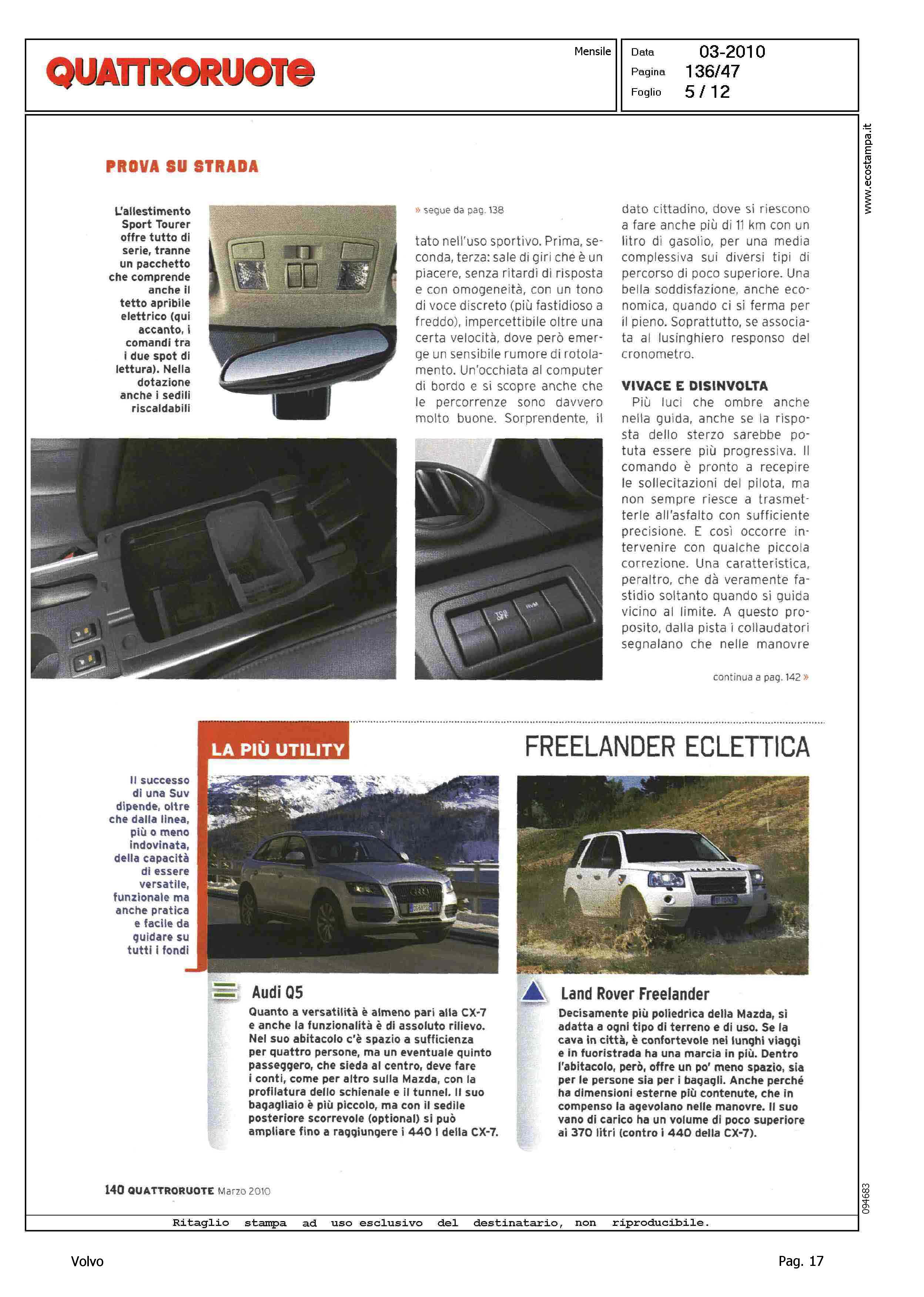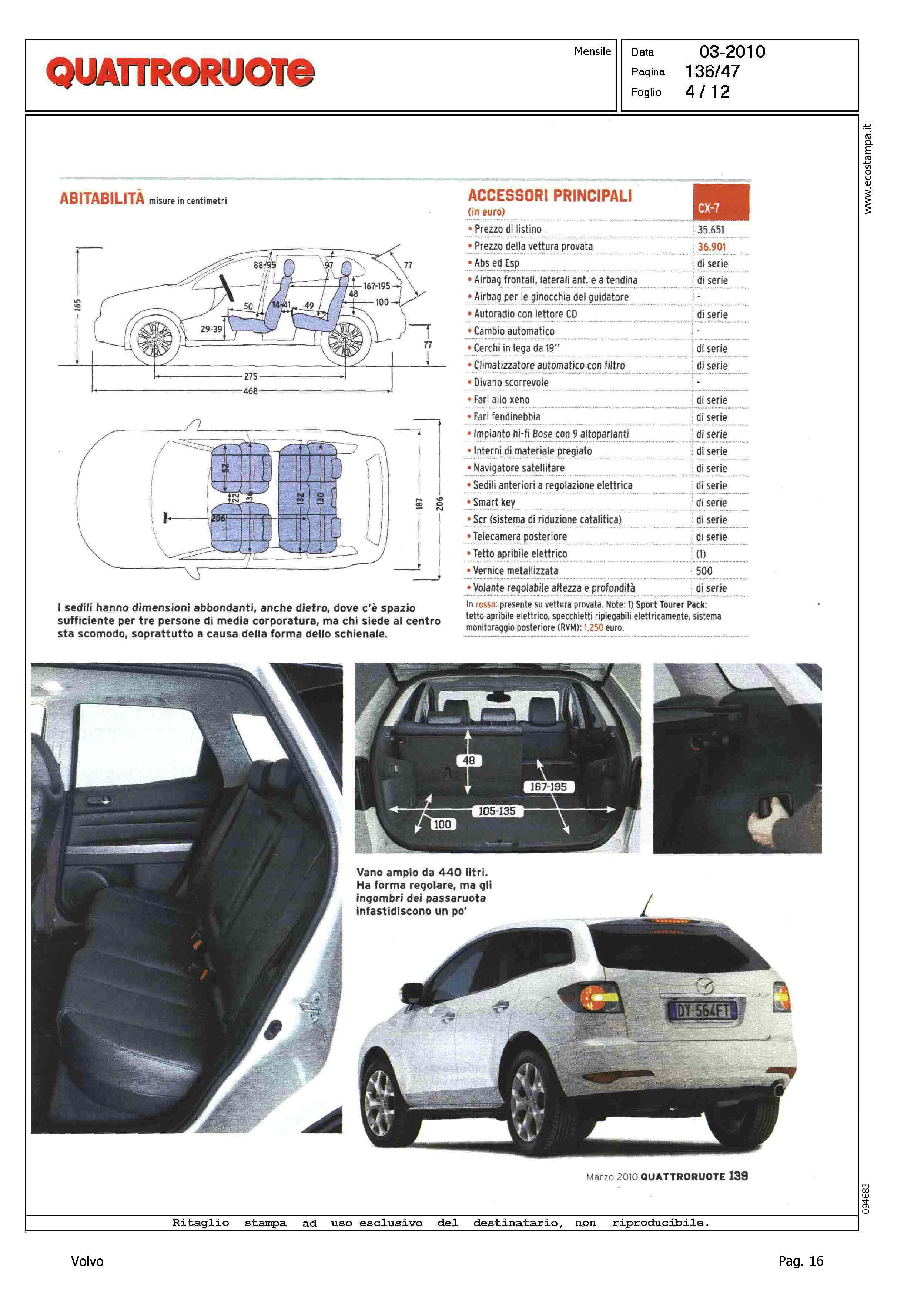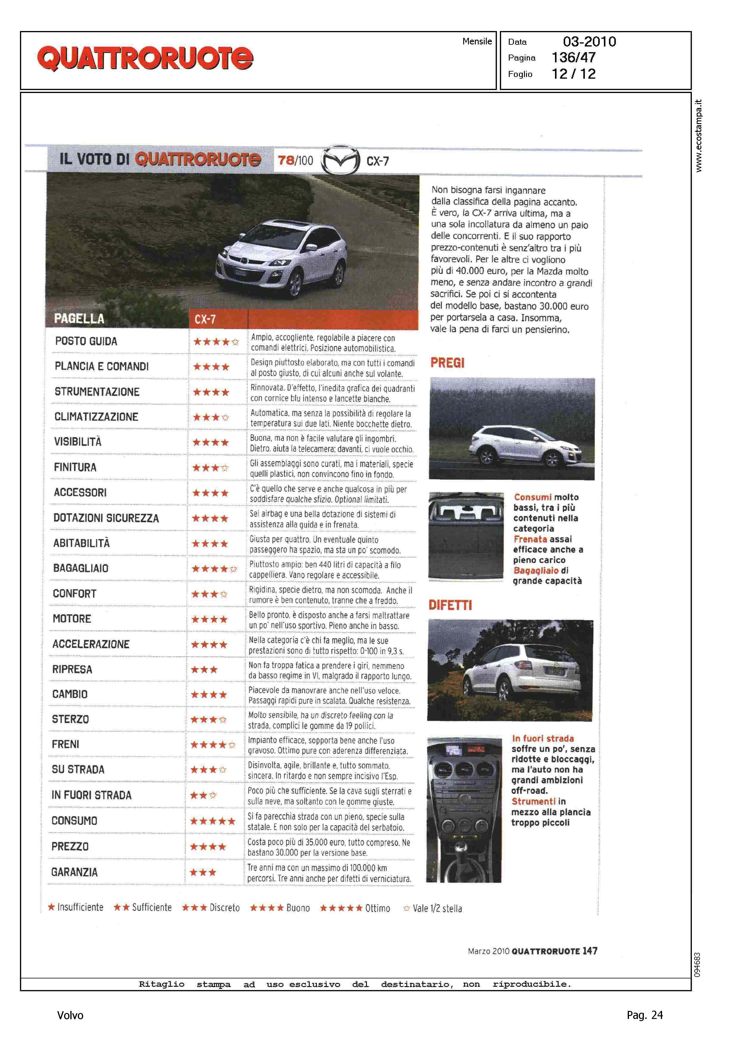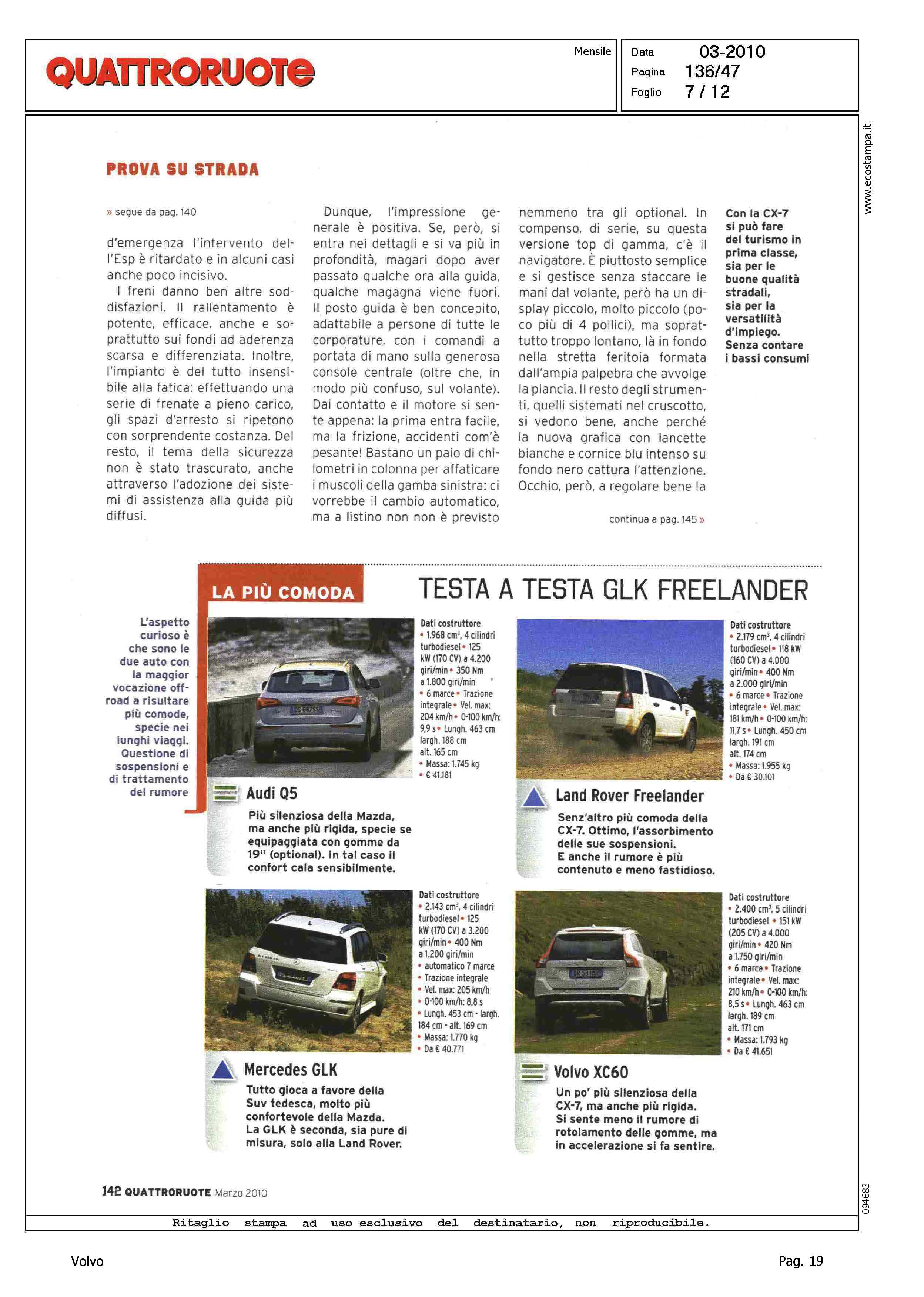 Highlight: TEST DRIVE CX-7 - LE COMPETITOR: AUDI Q5 - LAND ROVER FREELANDER - MERCEDES GLK - VOLVO XC60 - XC60 D5 205CV: PIU' COMPLETA ED ACCESSORIATA - TARGET AUTOMOBILISTI 'SOFISTICATI' - PREVALE A LIVELLOO QUALITATITO SENZA RAGGIUNGERE AUDI E MERCEDES - DIFFERENZE NEI DETTAGLI - SPAZIO: DIFFERENZE MINIME - PIU' SILENZIOSA DELLA CX-7 MA PIU' RIGIDA - RUMOROSITA' IN ACCELERAZIONE - DATI COSTRUTTORE - POTENZA (205CV) IN ABBONDANZA - 4X4 MENO PRESTAZIONALE - PRESTAZIONI, E' LA MIGLIORE - ANCHE SU STRADA NON TEME CONFRONTI - FEELING E GRANDE SICUREZZA - PUNTA SU SICUREZZA E QUALITA' A BORDO - CONSUMI CONTENUTI - VOTO QUATTRORUOTE, 80/100