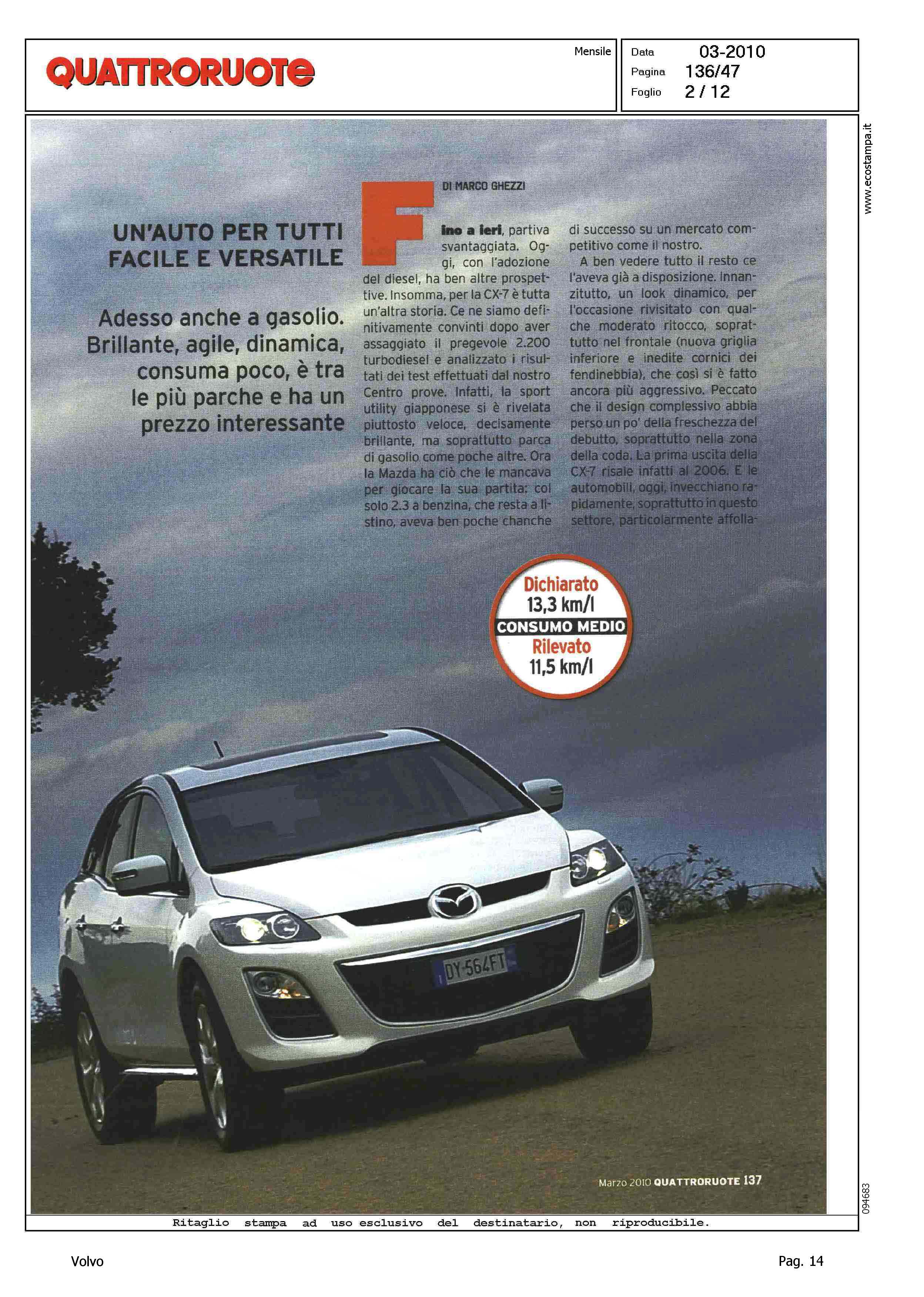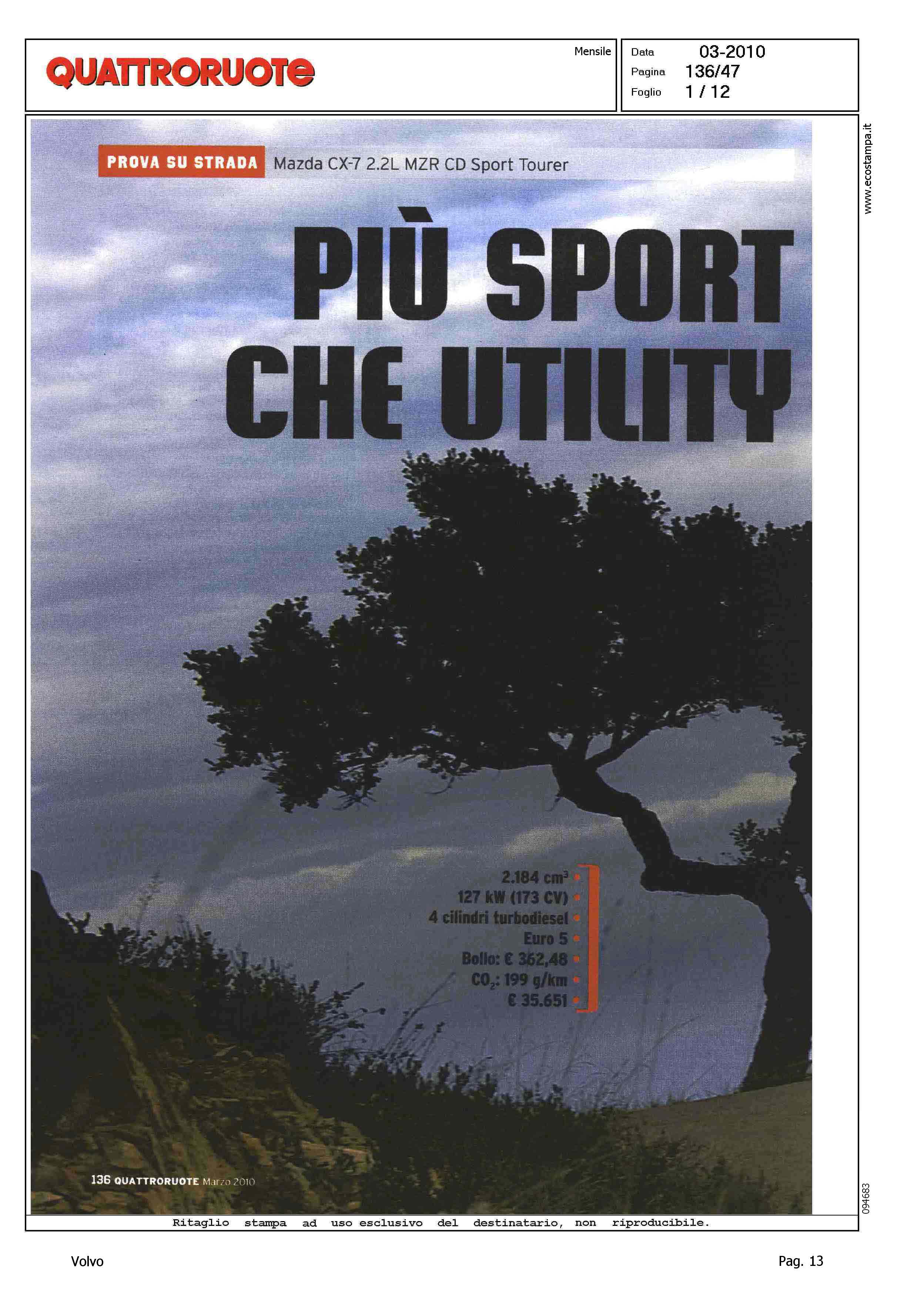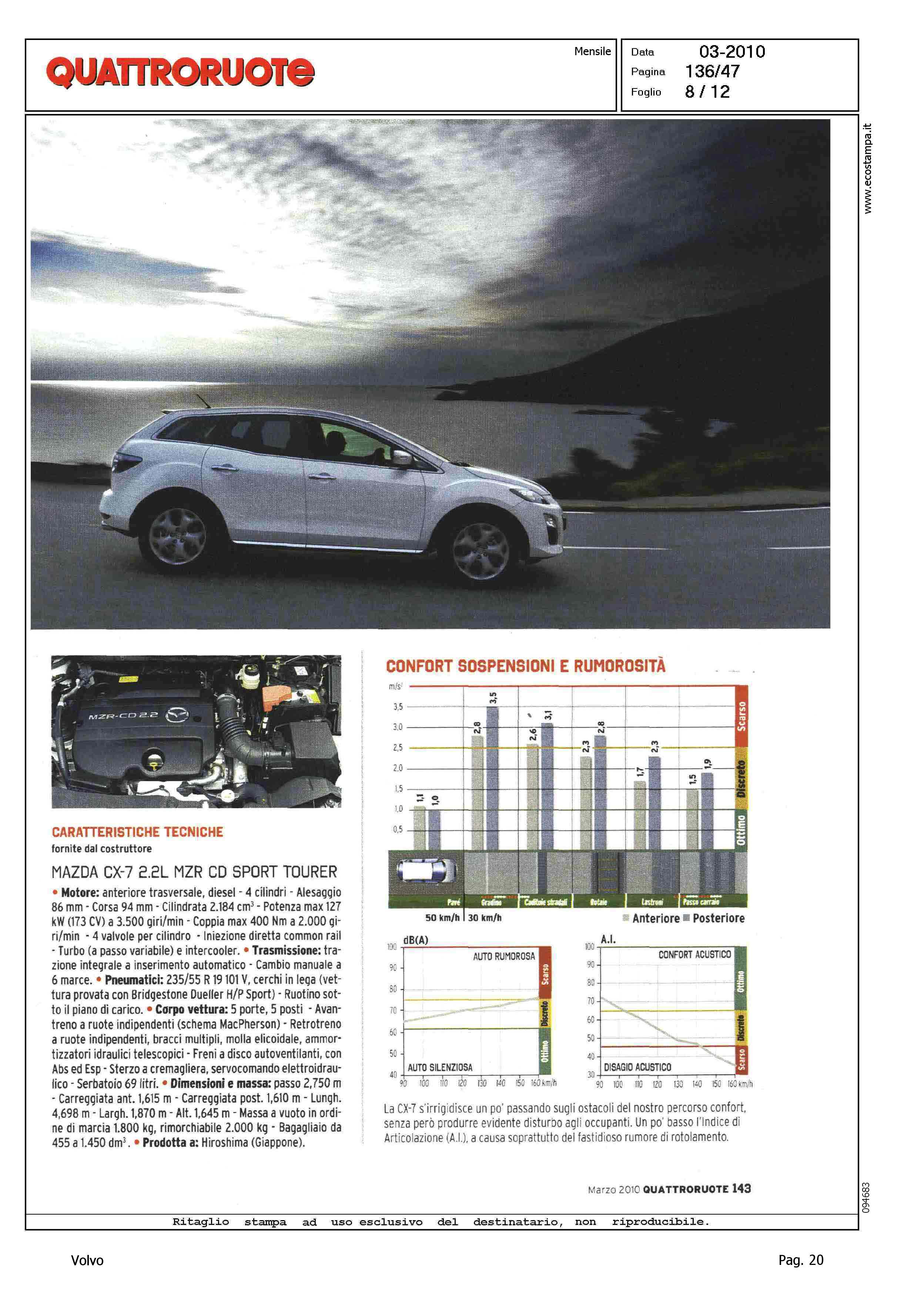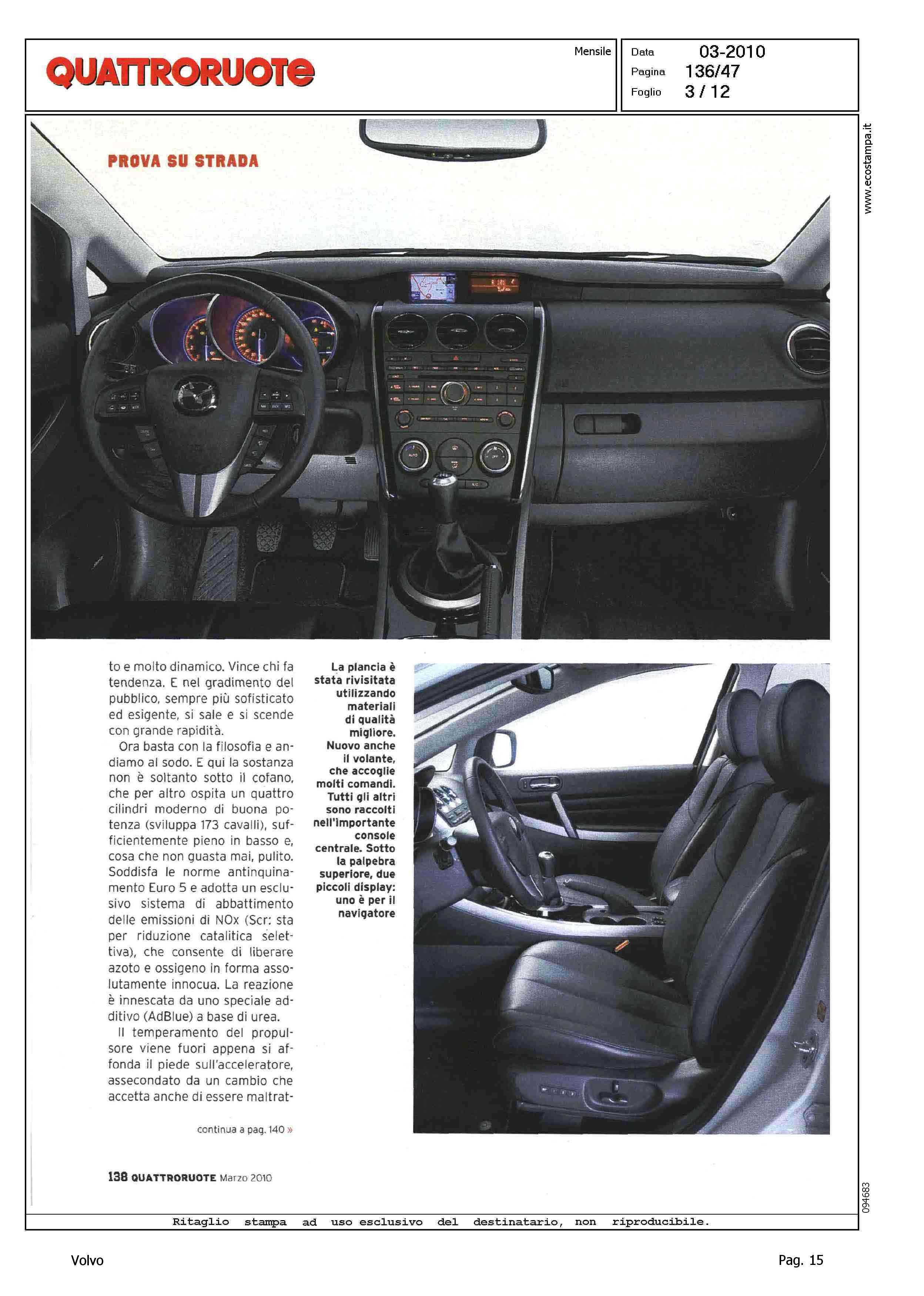 Highlight: TEST DRIVE CX-7 - LE COMPETITOR: AUDI Q5 - LAND ROVER FREELANDER - MERCEDES GLK - VOLVO XC60 - XC60 D5 205CV: PIU' COMPLETA ED ACCESSORIATA - TARGET AUTOMOBILISTI 'SOFISTICATI' - PREVALE A LIVELLOO QUALITATITO SENZA RAGGIUNGERE AUDI E MERCEDES - DIFFERENZE NEI DETTAGLI - SPAZIO: DIFFERENZE MINIME - PIU' SILENZIOSA DELLA CX-7 MA PIU' RIGIDA - RUMOROSITA' IN ACCELERAZIONE - DATI COSTRUTTORE - POTENZA (205CV) IN ABBONDANZA - 4X4 MENO PRESTAZIONALE - PRESTAZIONI, E' LA MIGLIORE - ANCHE SU STRADA NON TEME CONFRONTI - FEELING E GRANDE SICUREZZA - PUNTA SU SICUREZZA E QUALITA' A BORDO - CONSUMI CONTENUTI - VOTO QUATTRORUOTE, 80/100