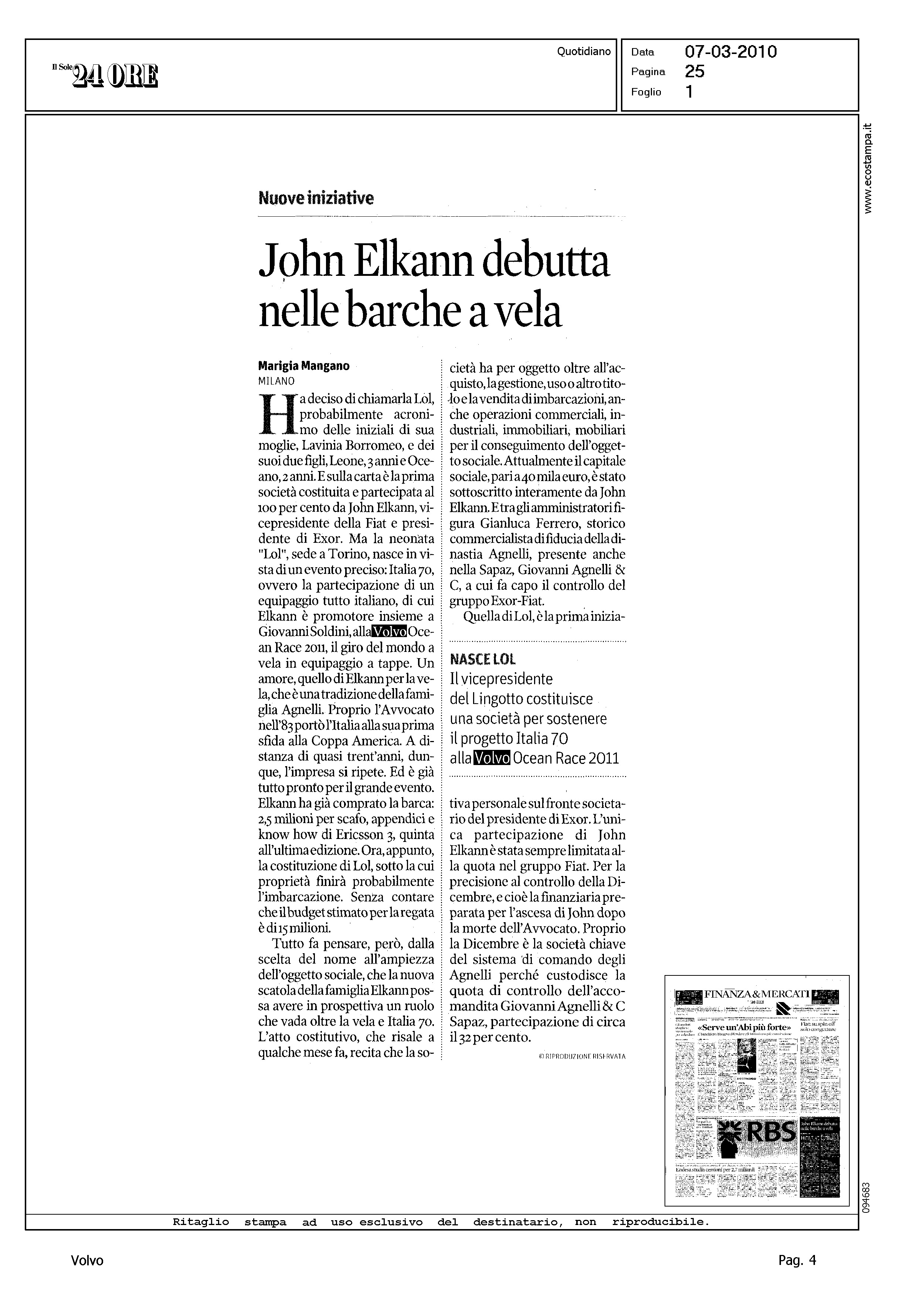 Author: MANGANO, MARIGIALine: Corporate Model: Corporate Subject: Volvo Ocean Race Title: JOHN ELKAN DEBUTTA NELLE BARCHE A VELAHighlight: PARTECIPAZIONE ITALIANA VOR 2011