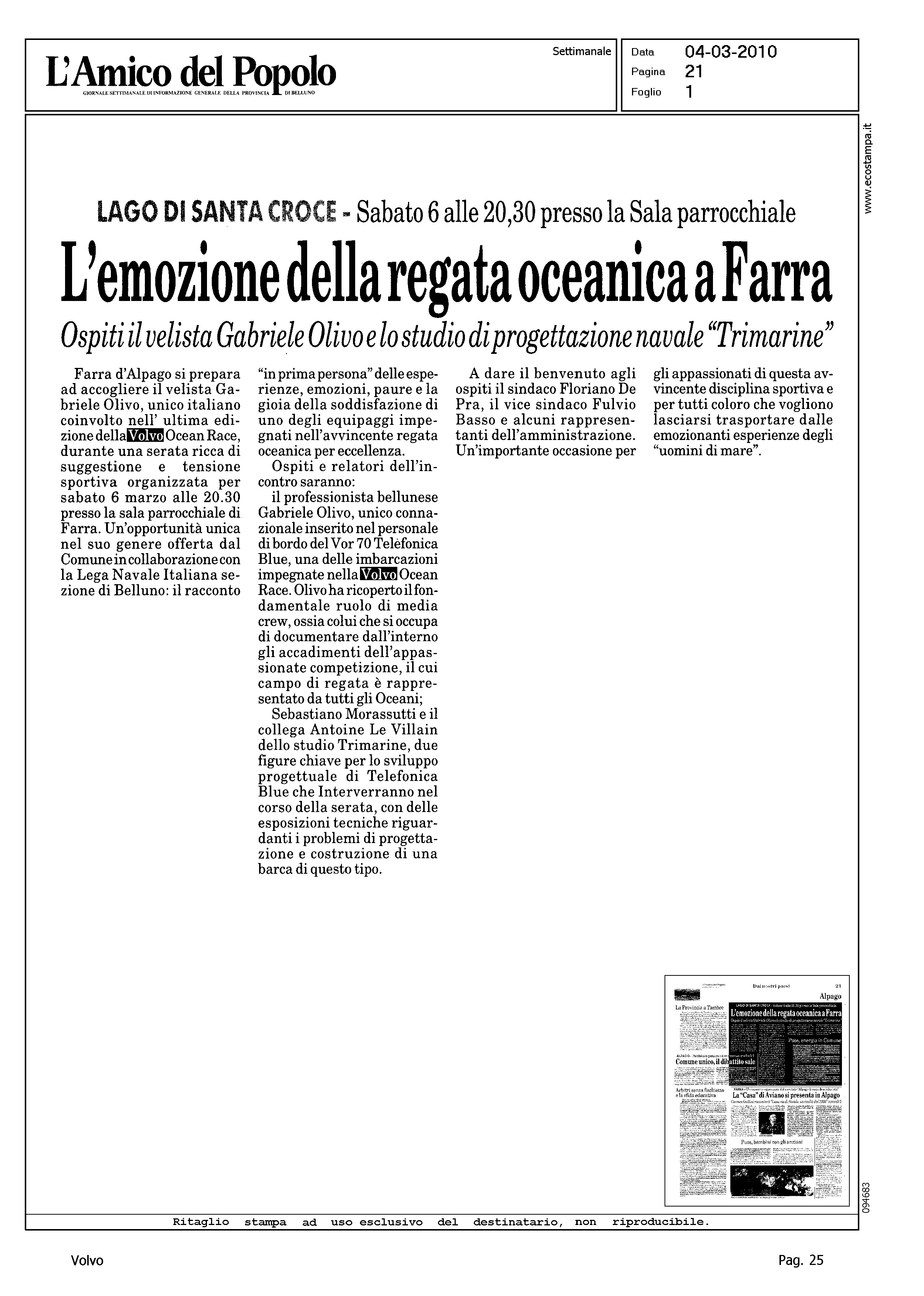 Author: Line: Corporate Model: Corporate Subject: Volvo Ocean Race Title: L'EMOZIONE DELLA REGATA OCEANICA A FARRAHighlight: FARRA D'ALPAGO - OLIVO - TELEFONICA BLUE