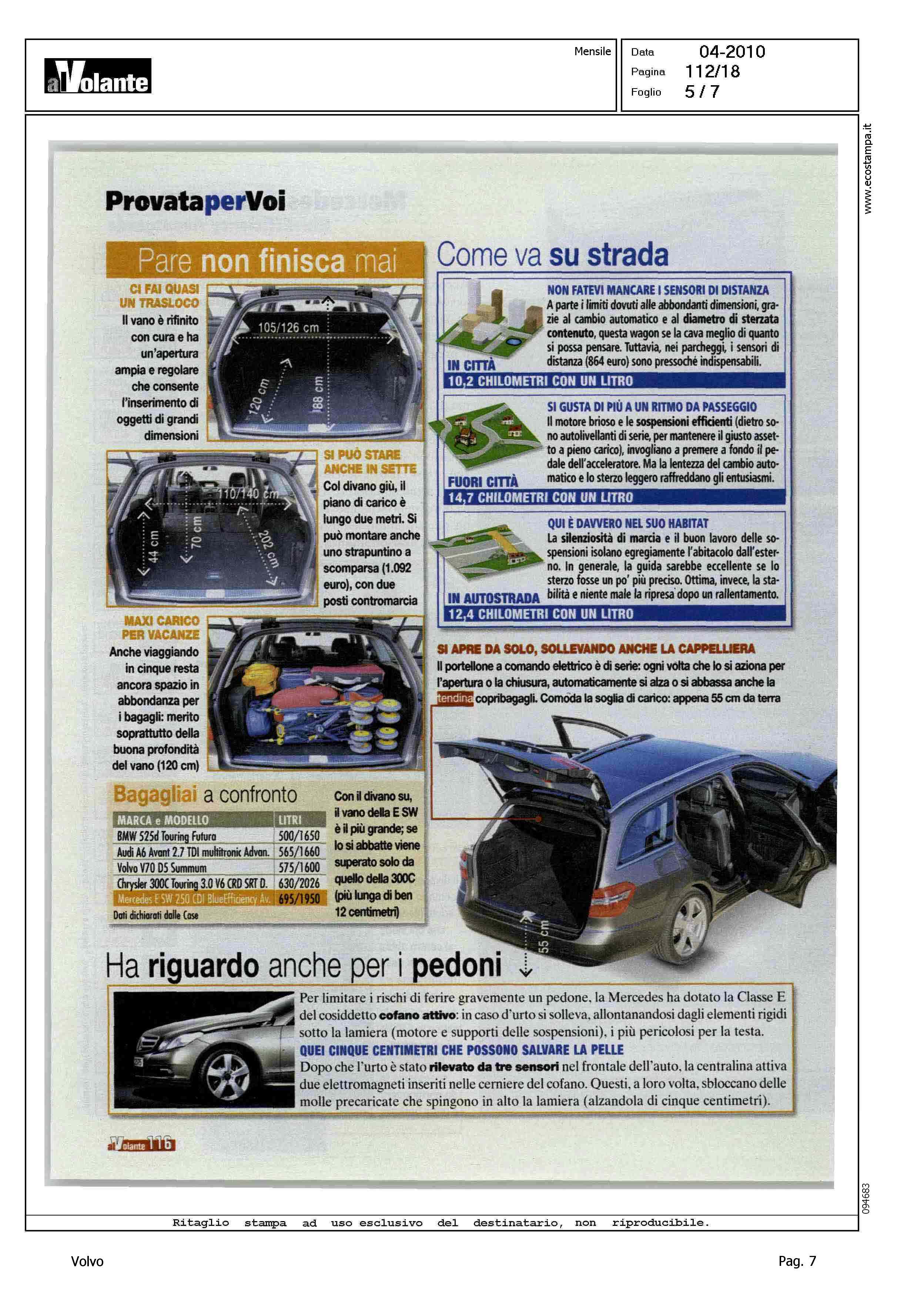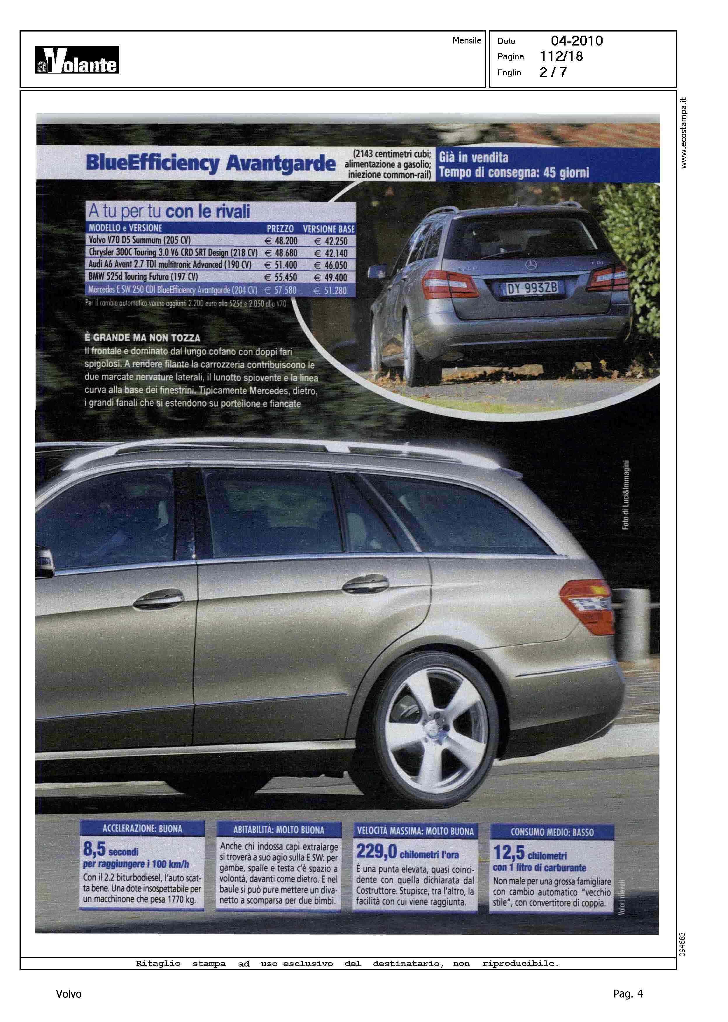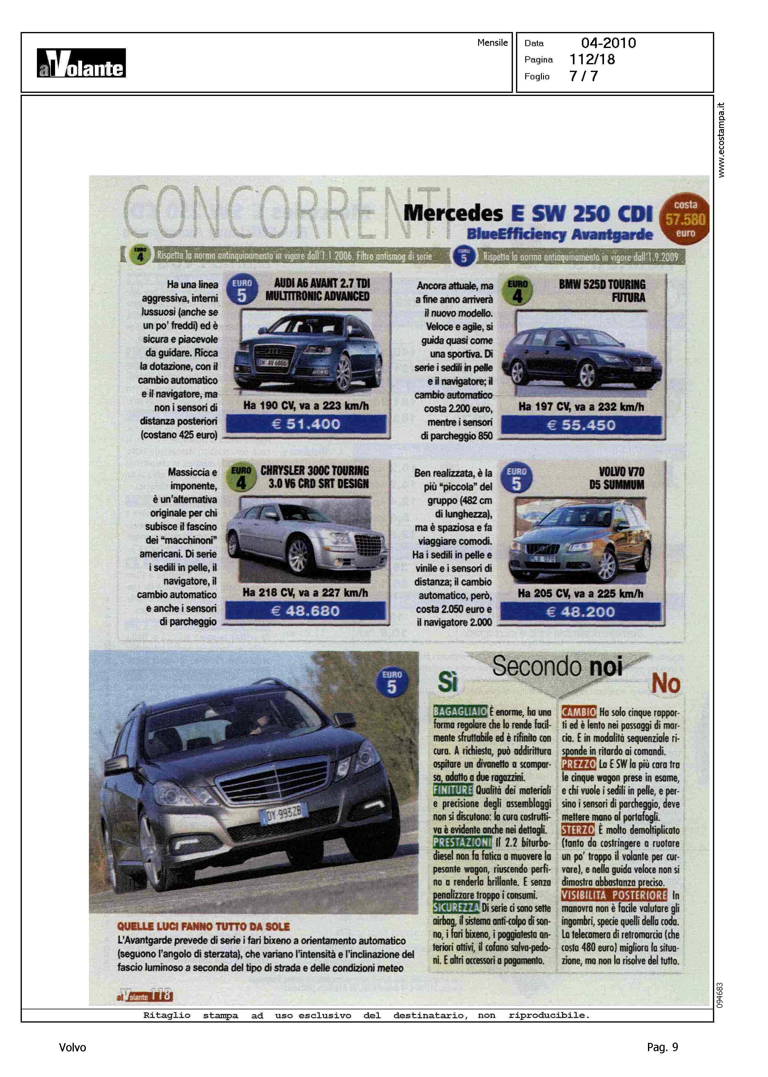 Highlight: MB CLASSE E SW 250 CDI BLUEFFICIENCY AVANTGARDE, COMPETITOR: V70 D5 SUMMUM, AUDI A6 AVANT 2.7 TDI MULTITRONIC ADVANCED, BMW 525D TOURING FUTURA, CHRYSLER 300C TOURING 3.0 V6 CRD SRT DESIGN - V70: PIU' PICCOLA - ABITACOLO SPAZIOSO, COMFORT VIAGGIO - ACCESSORI - COSTI EXTRA PER C.AUTOMATICO E NAVIGATORE - PREZZO - PRESTAZIONI