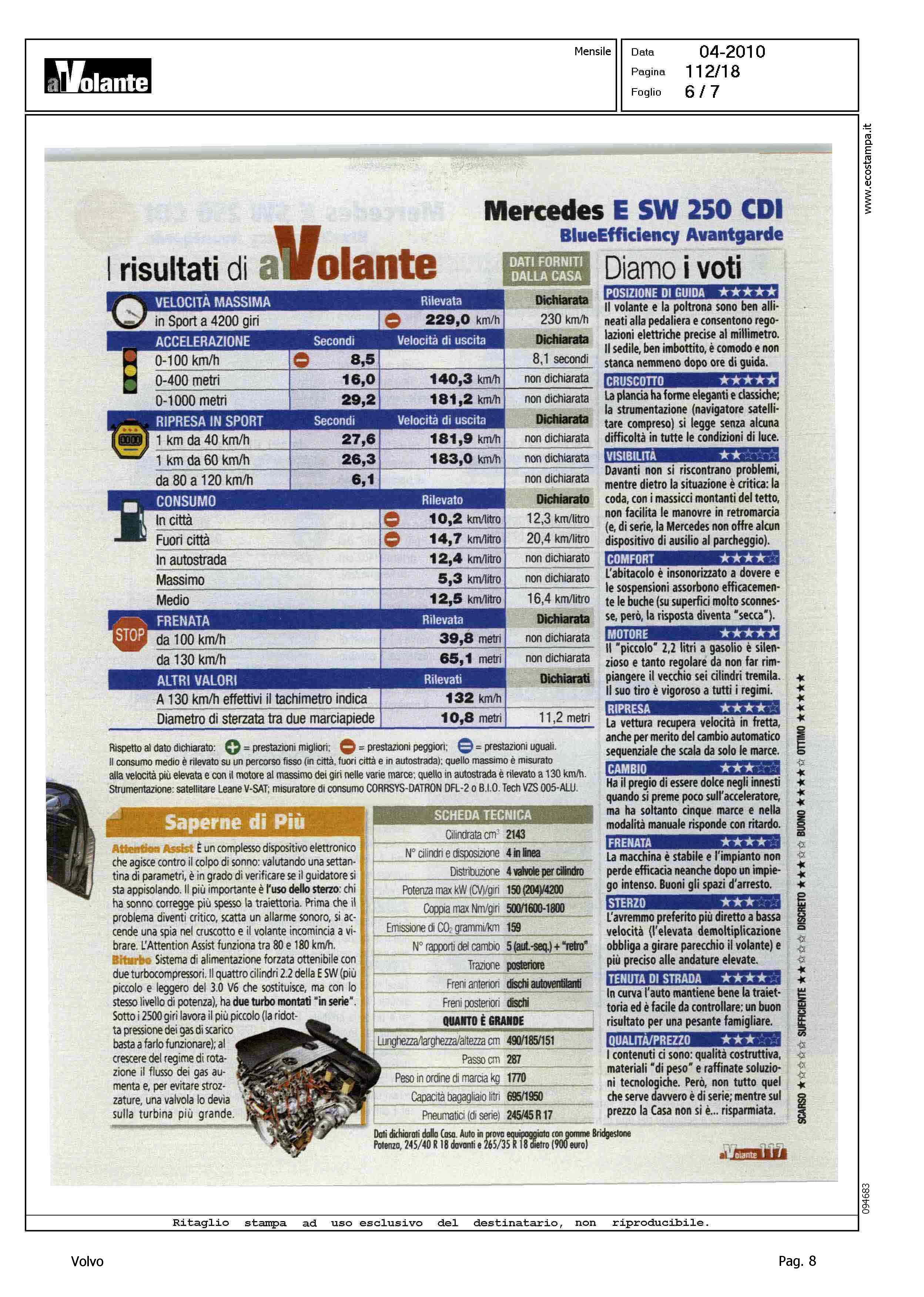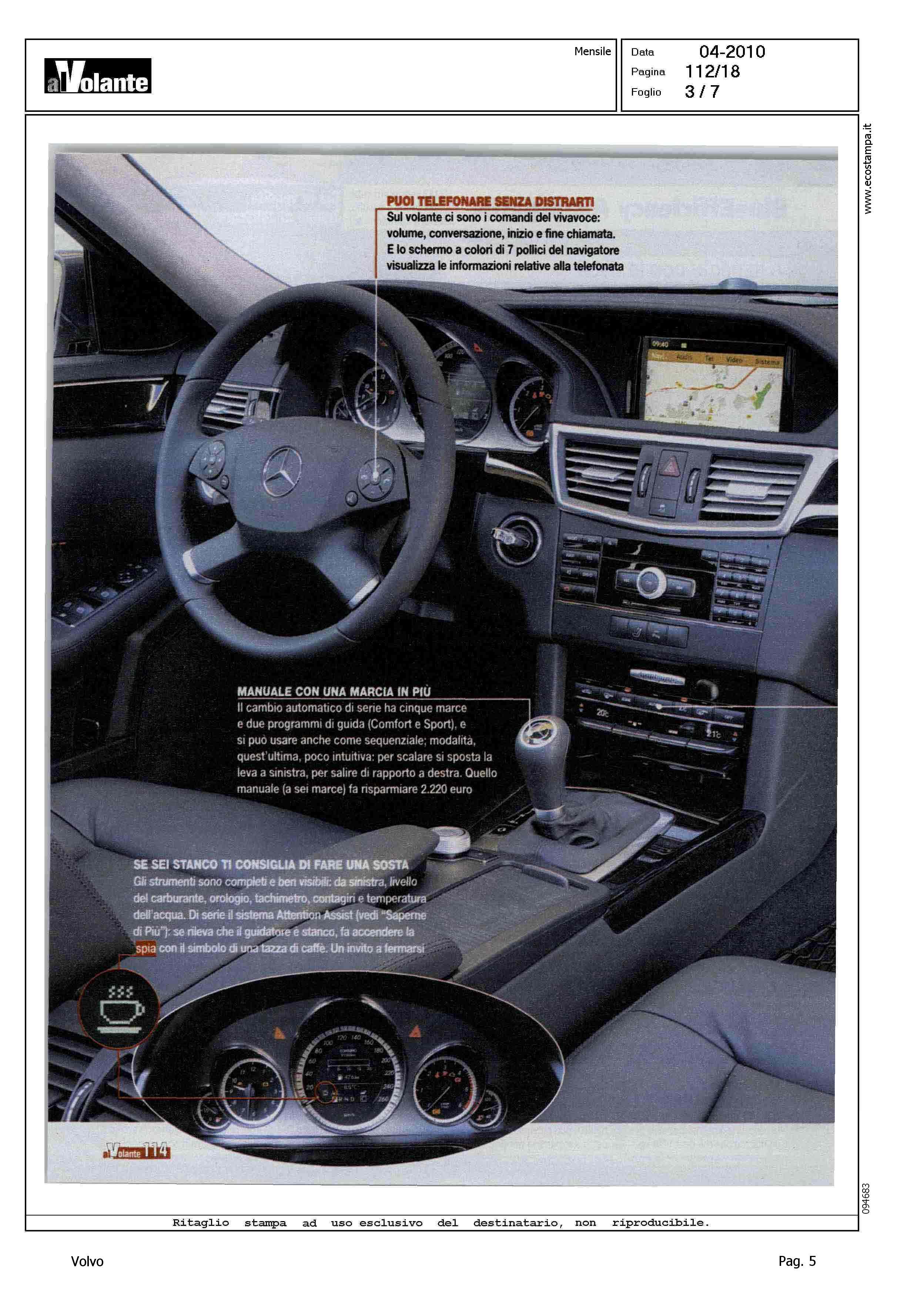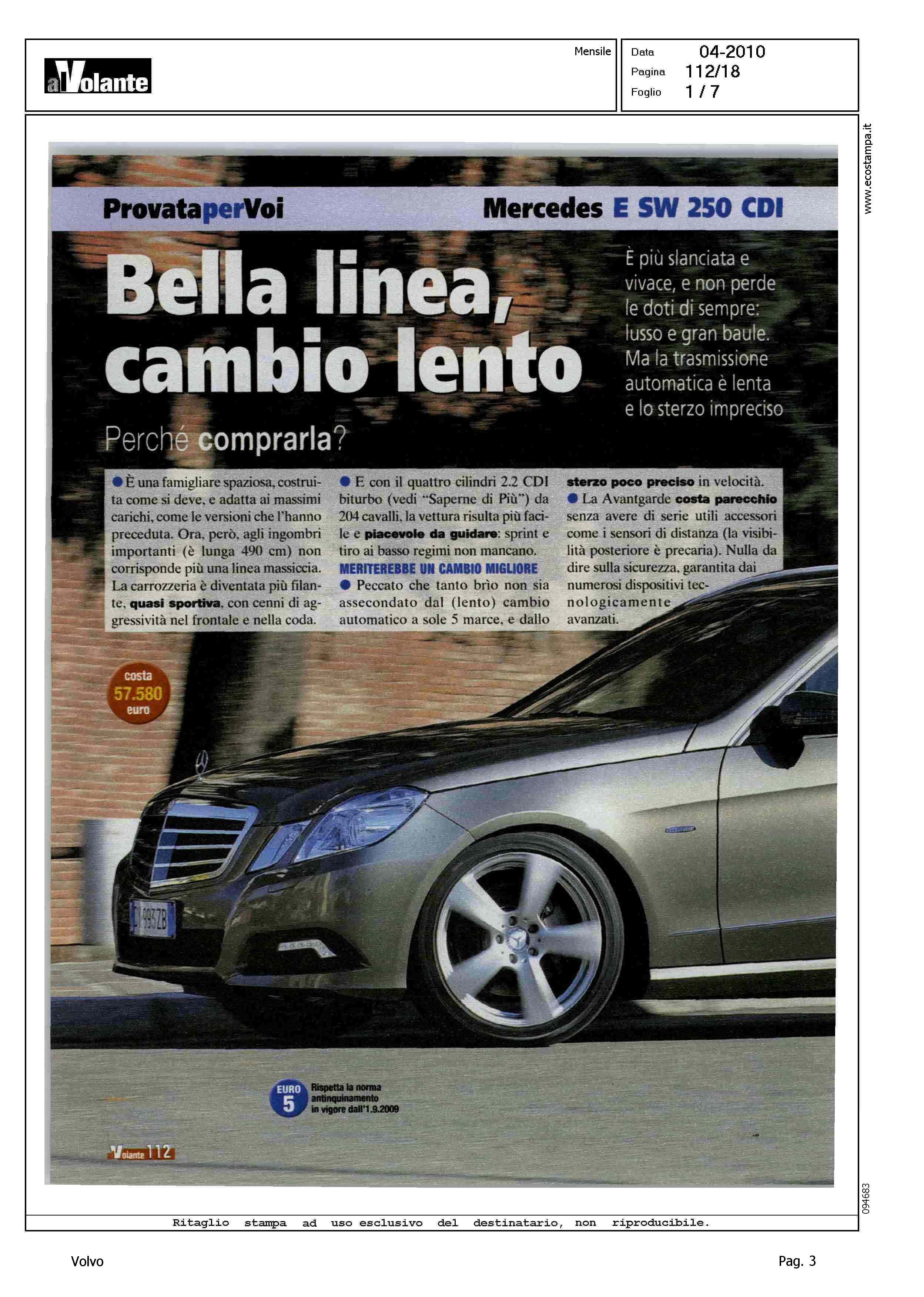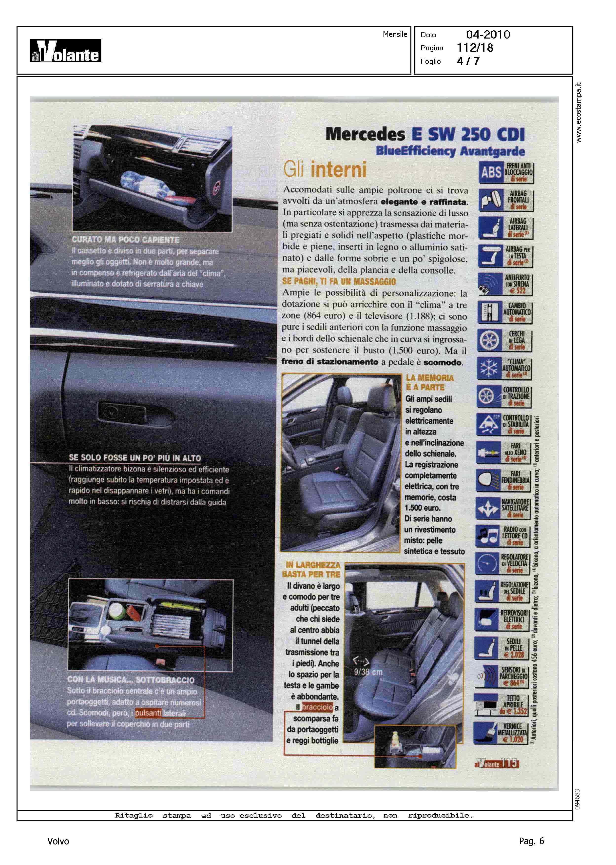 Highlight: MB CLASSE E SW 250 CDI BLUEFFICIENCY AVANTGARDE, COMPETITOR: V70 D5 SUMMUM, AUDI A6 AVANT 2.7 TDI MULTITRONIC ADVANCED, BMW 525D TOURING FUTURA, CHRYSLER 300C TOURING 3.0 V6 CRD SRT DESIGN - V70: PIU' PICCOLA - ABITACOLO SPAZIOSO, COMFORT VIAGGIO - ACCESSORI - COSTI EXTRA PER C.AUTOMATICO E NAVIGATORE - PREZZO - PRESTAZIONI