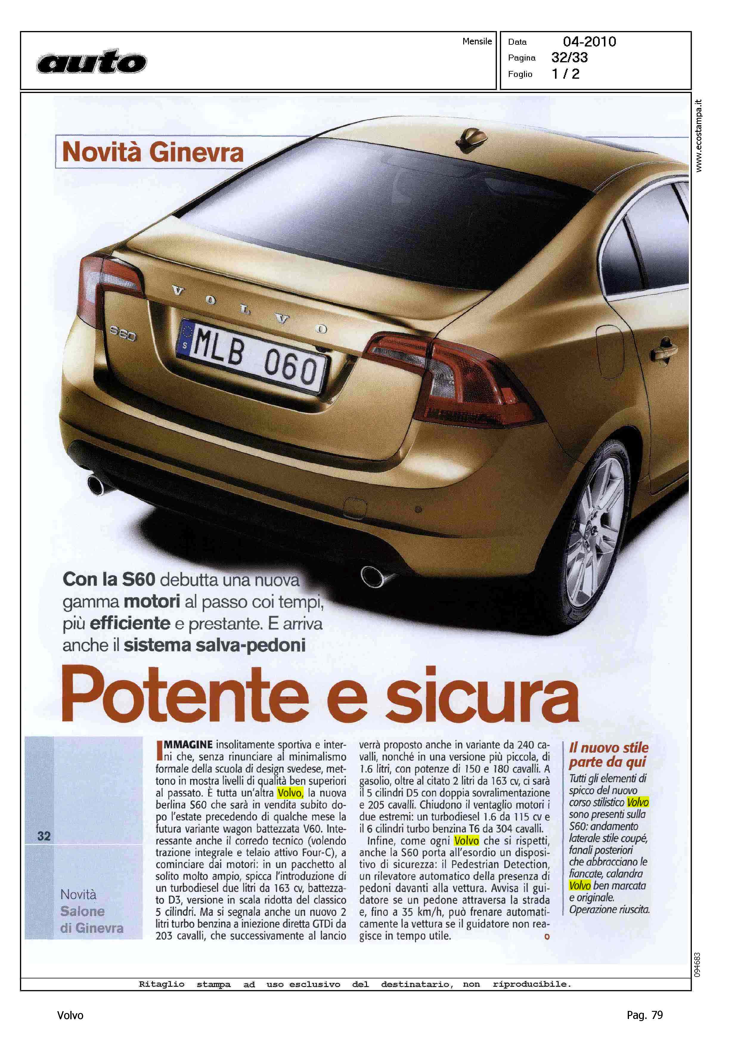 Author: Line: S60 Model: Linea S60 Show Subject: - Title: POTENTE E SICURAHighlight: VALORE VOLVO - PROFILO DI MISSIONE - IN VENDITA DOPO L'ESTATE - NUOVA FAMIGLIA DI MOTORI - SICUREZZA - PEDESTRIAN DETECTION