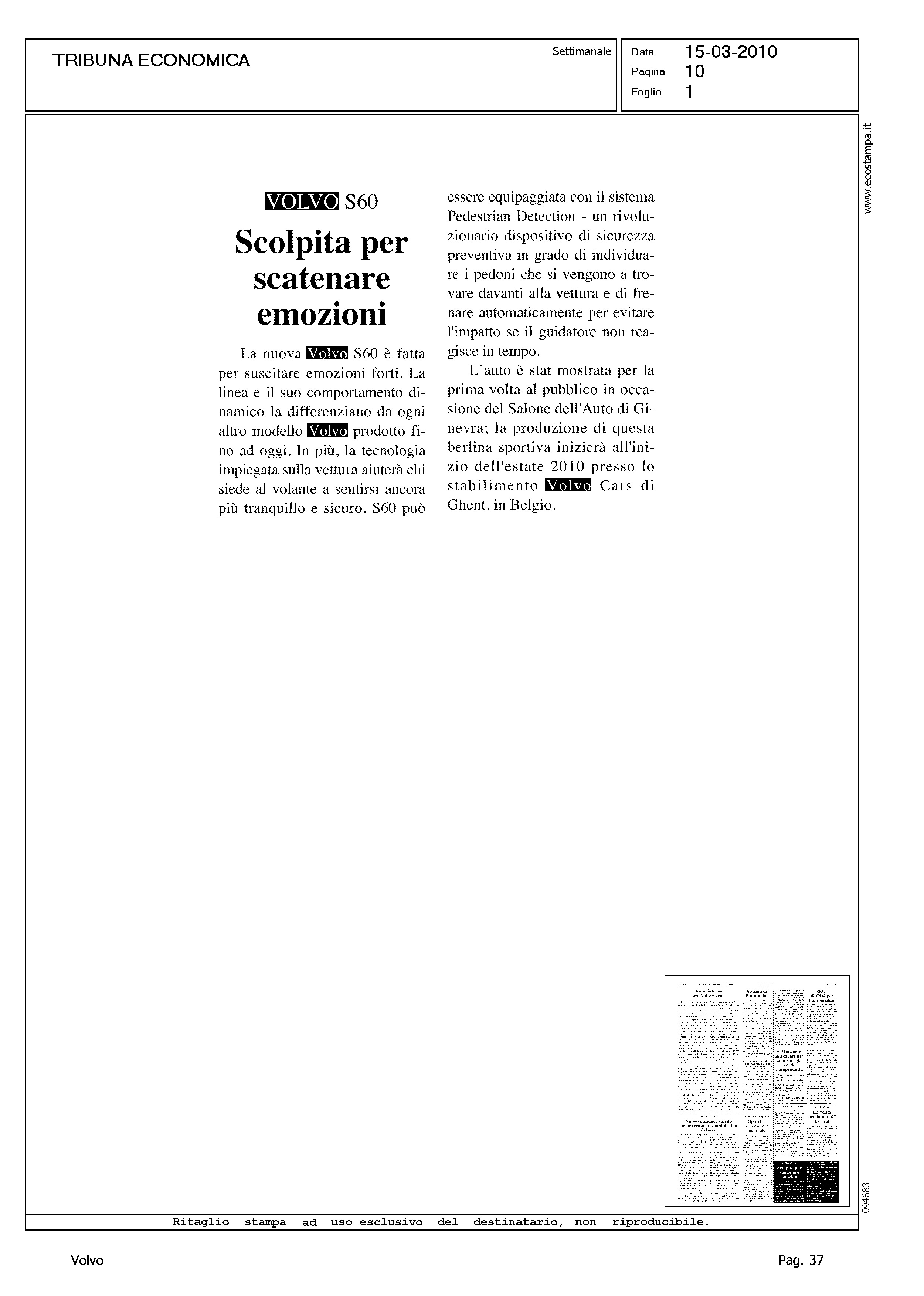 Author: Line: S60 Model: Linea S60 Show Subject: - Title: VOLVO S60 - SCOLPITA PER SCATENARE EMOZIONIHighlight: VALORE VOLVO - SICUREZZA - PEDESTRIAN DETECTION - GINEVRA - DATA COMMERCIALIZZAZIONE
