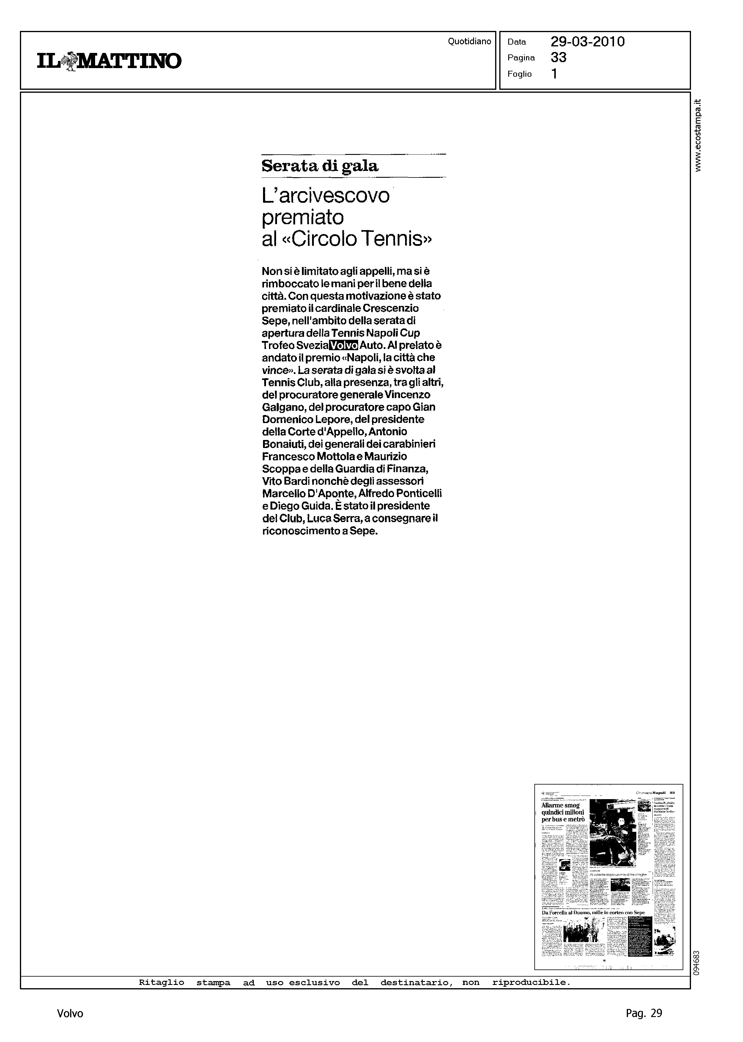 Author: Line: Corporate Model: Corporate Subject: - Title: SERATA DI GALA - L'ARCIVESCOVO PREMIATO AL 'CIRCOLO TENNIS'Highlight: INTERVENTO DEL VESCOVO DI NAPOLI AL TENNIS NAPOLI CLUB