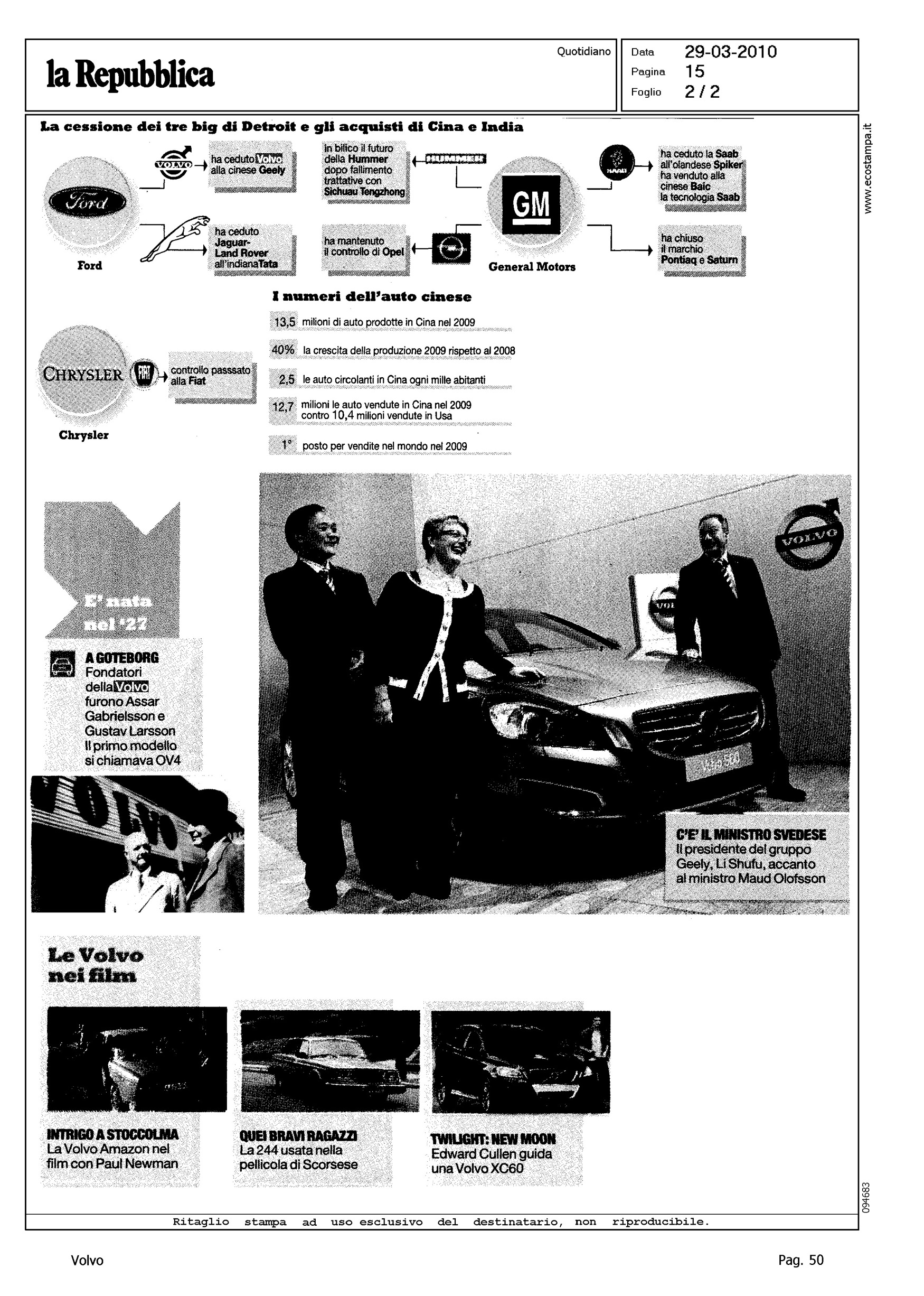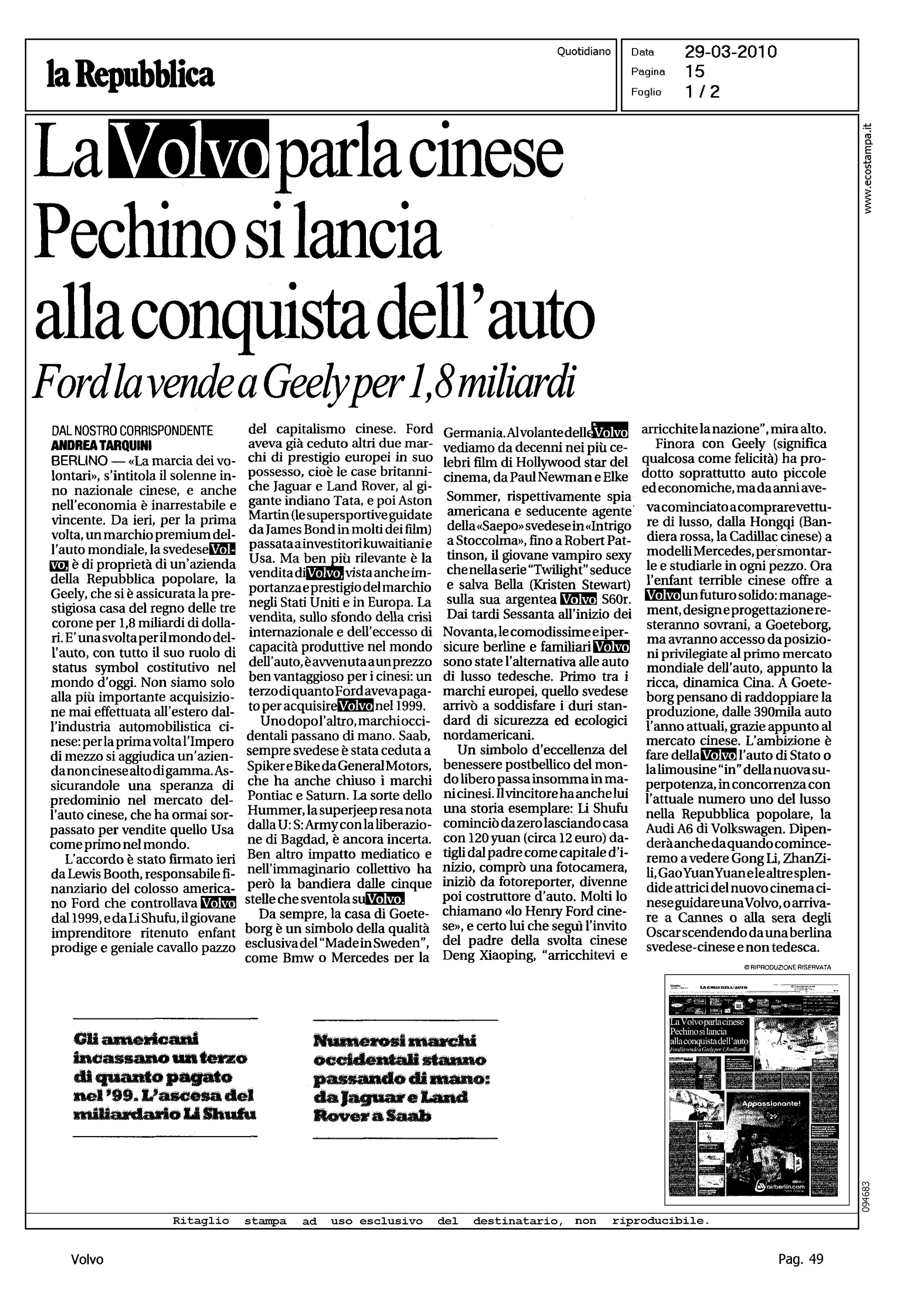 Author: TARQUINI, ANDREALine: Corporate Model: Corporate Subject: - Title: LA VOLVO PARLA CINESE - PECHINO SI LANCIA ALLA CONQUISTA DELL'AUTOHighlight: ANNUNCIO VENDITA VOLVO A GEELY