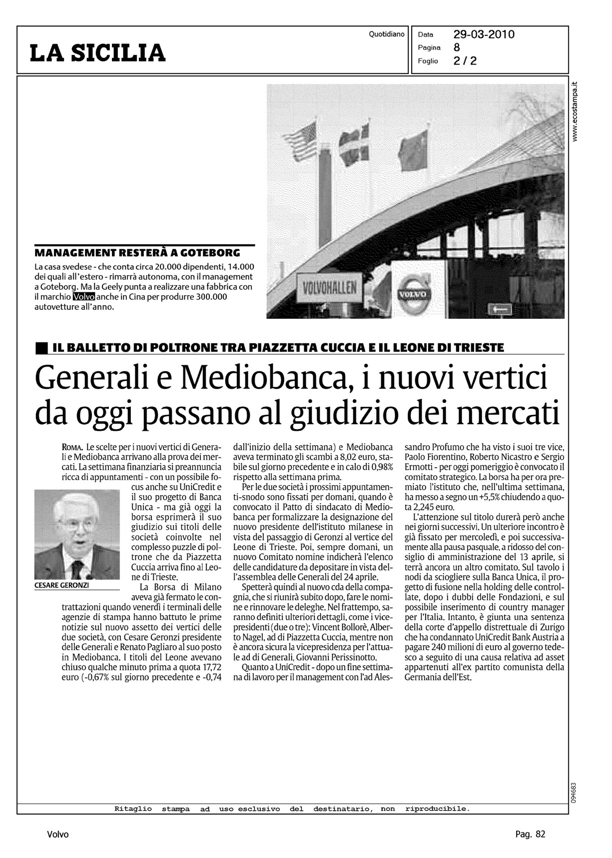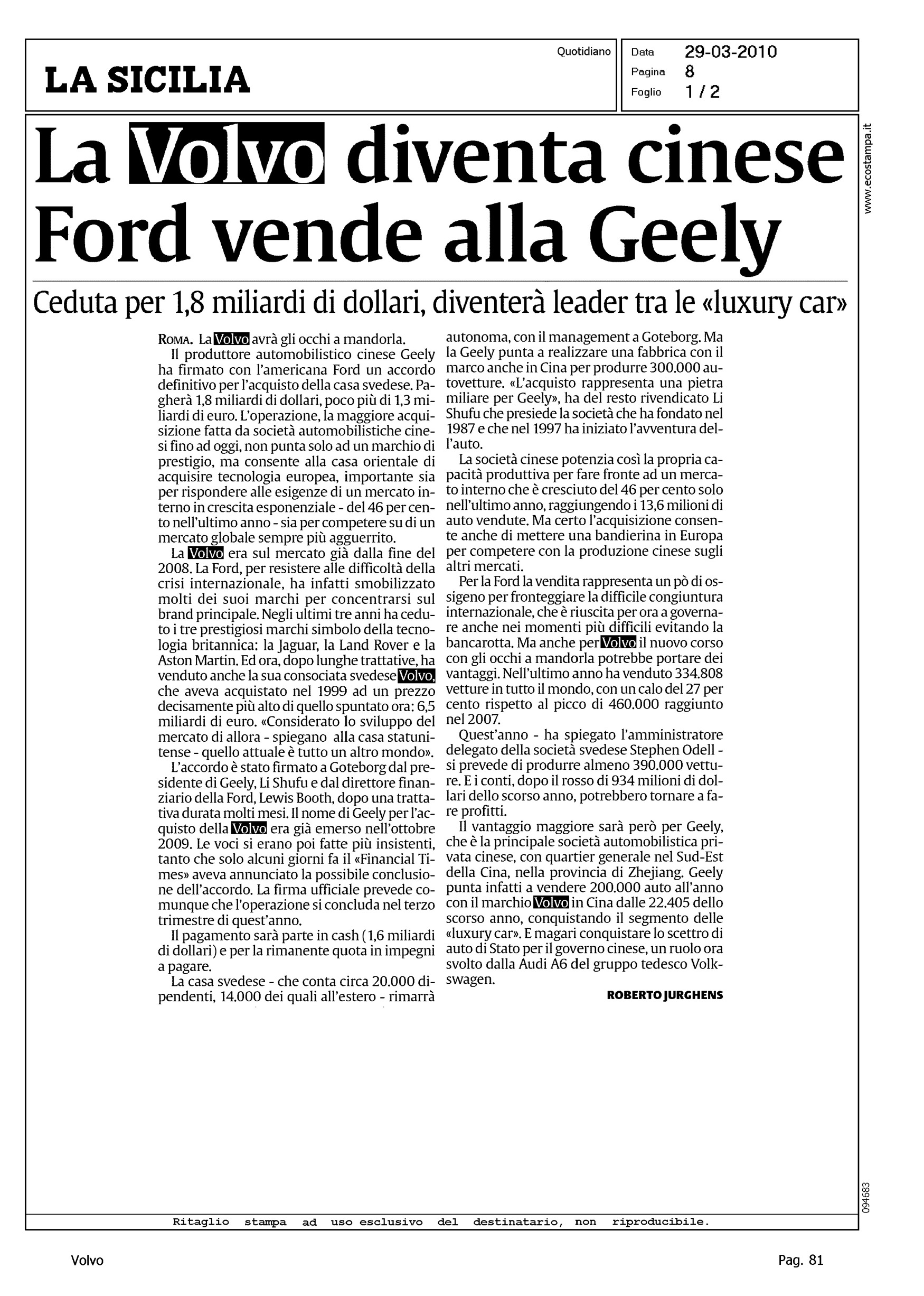 Author: JURGHENS, ROBERTOLine: Corporate Model: Corporate Subject: - Title: LA VOLVO DIVENTA CINESE - FORD VENDE ALLA GEELYHighlight: ANNUNCIO VENDITA VOLVO A GEELY