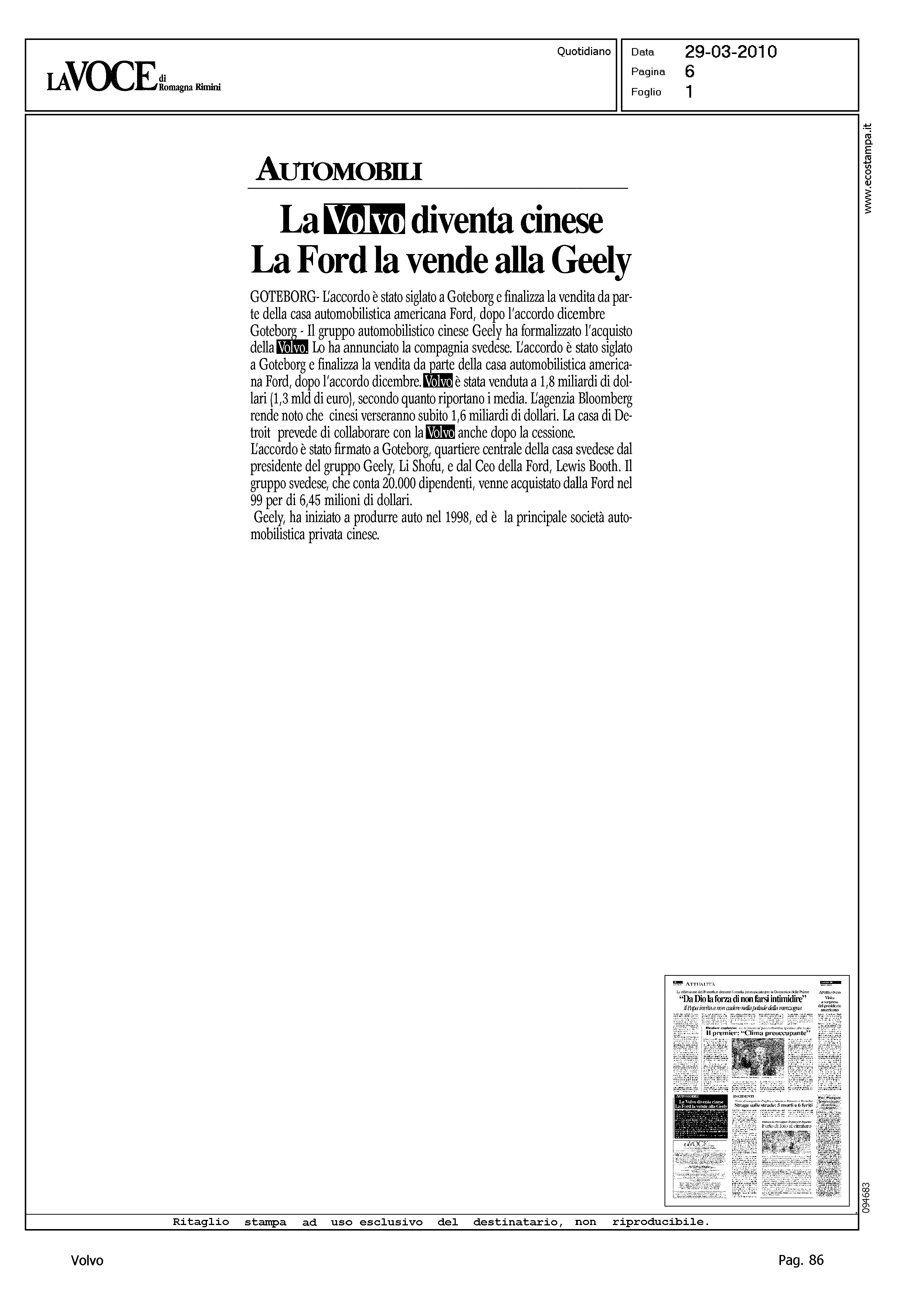 Title: LA VOLVO DIVENTA CINESE - LA FORD VENDE ALLA GEELY