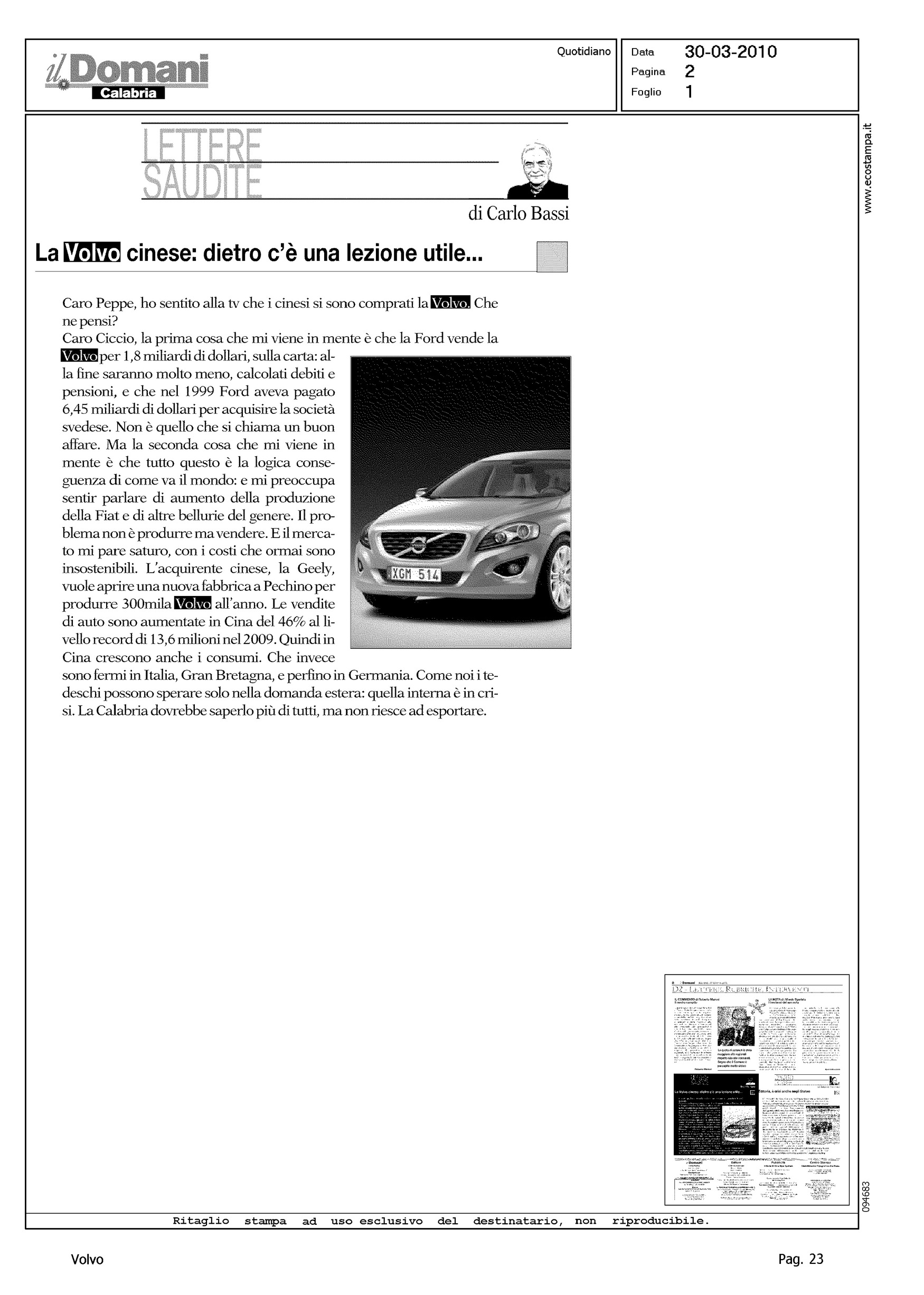 Author: BASSI, CARLOLine: Corporate Model: Corporate Subject: - Title: LA VOLVO CINESE: DIETRO C'E' UNA LEZIONE UTILE...Highlight: (EDIZIONE CALABRIA) - VENDITA VOLVO A GEELY