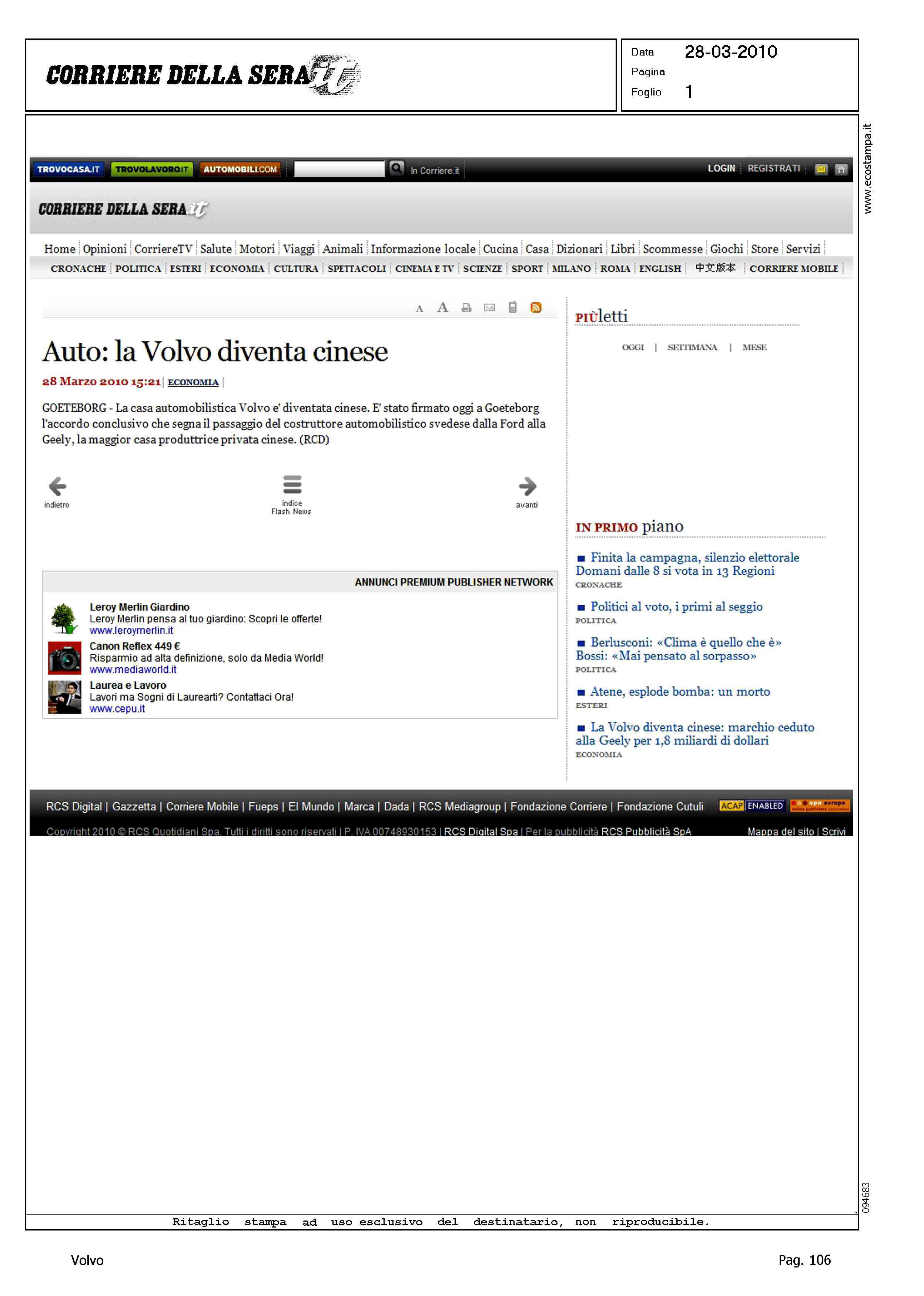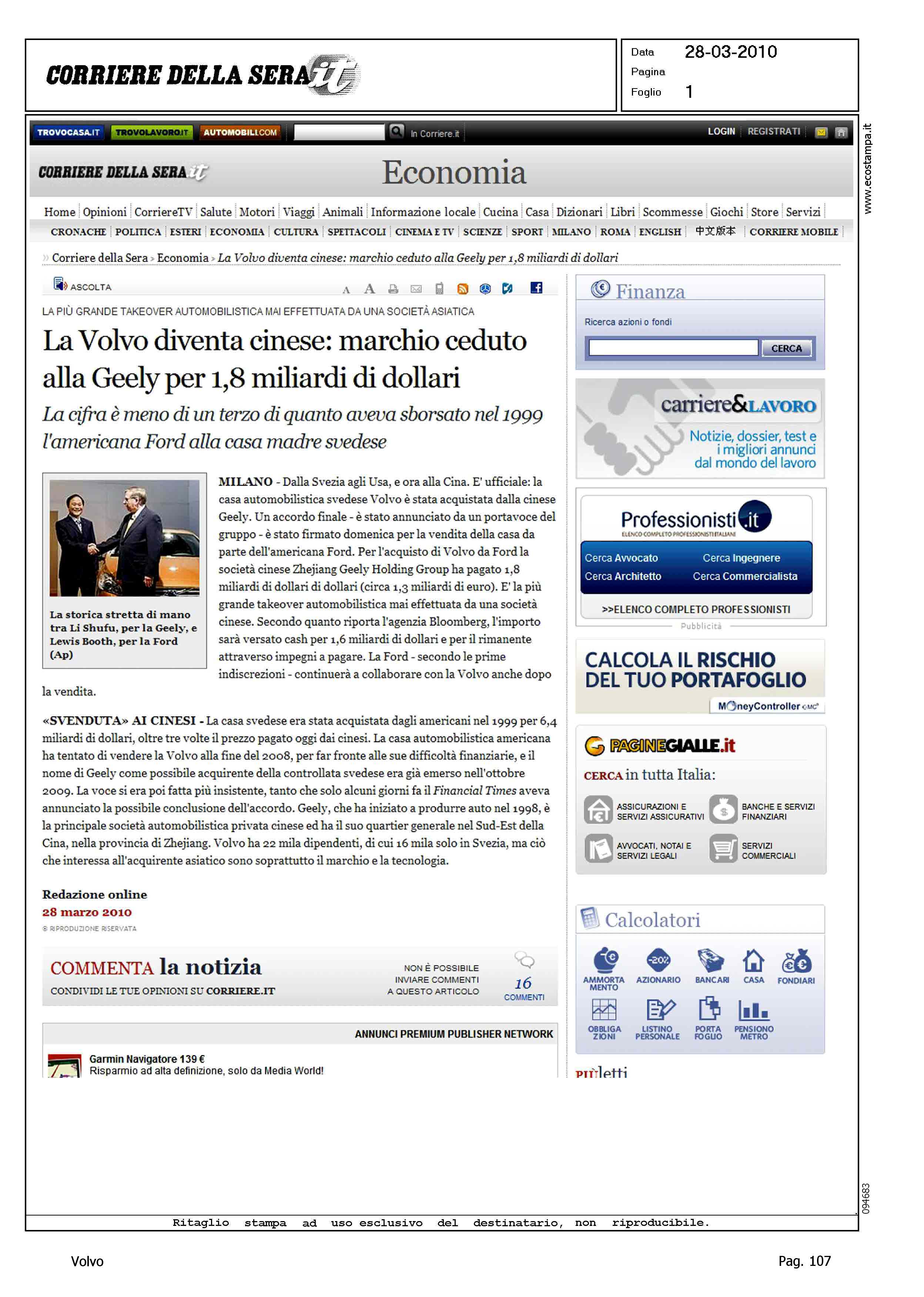 Title: TITOLI VARI - AUTO: LA VOLVO DIVENTA CINESE - LA VOLVO DIVENTA CINESE: MARCHIO CEDUTO ALLA GEELY PER 1,8 MILIARDI DI DOLLARI