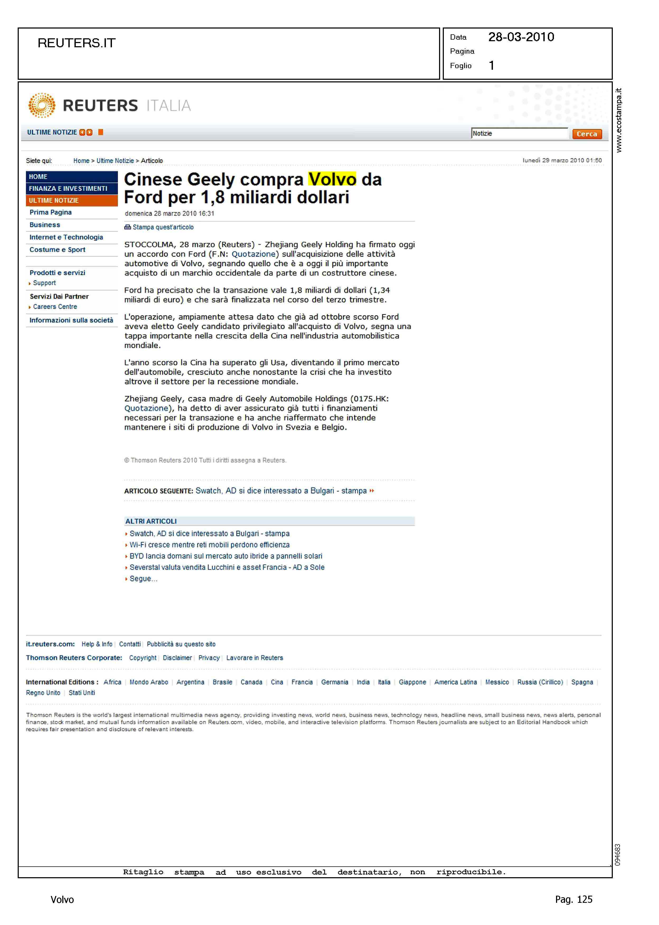 Title: CINESE GEELY COMPRA VOLVO DA FORD PER 1,8 MILIARDI DI DOLLARI