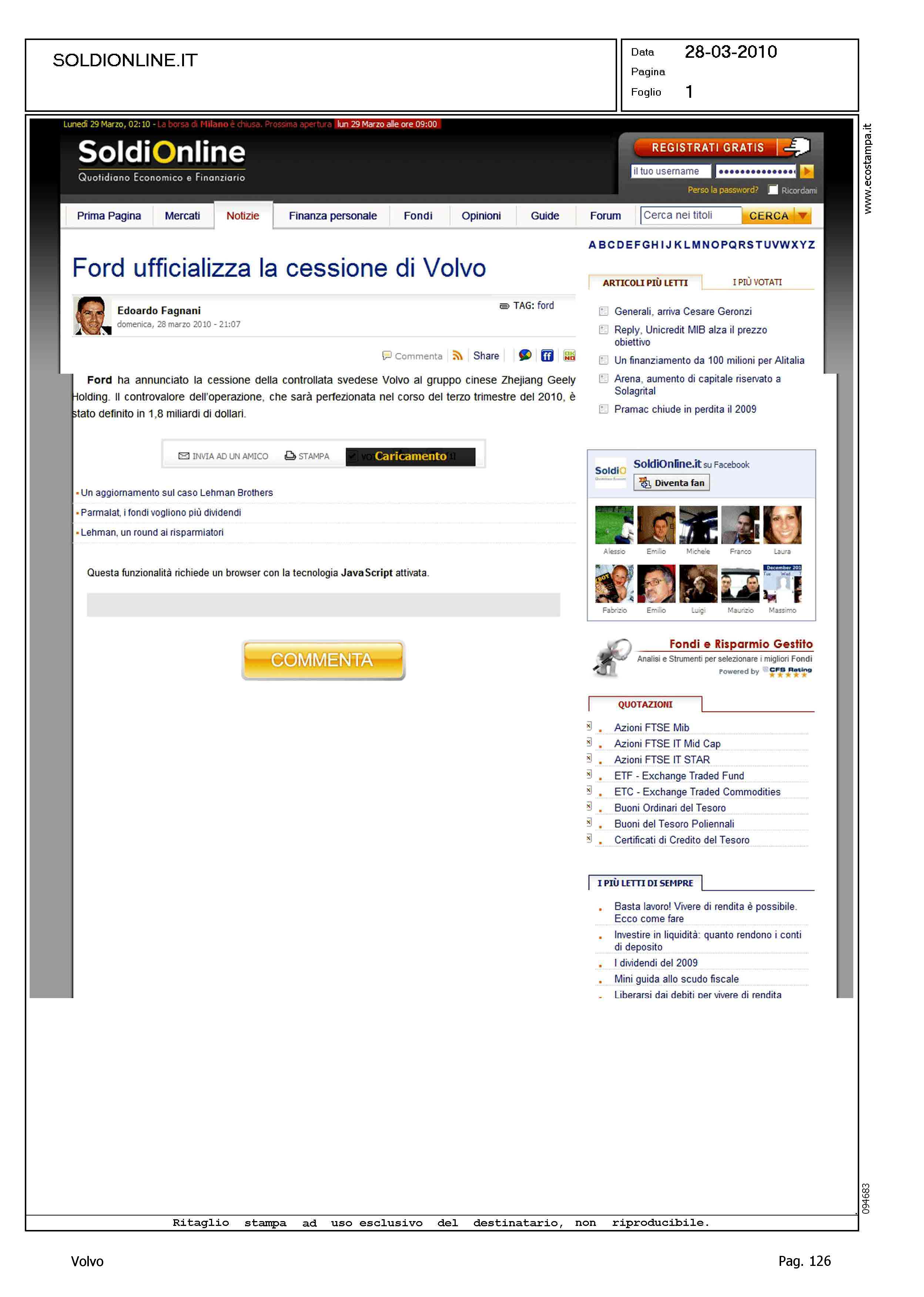 Author: FAGNANI, EDOARDOLine: Corporate Model: Corporate Subject: - Title: FORD UFFICIALIZZA LA CESSIONE DI VOLVOHighlight: VENDITA VOLVO A GEELY