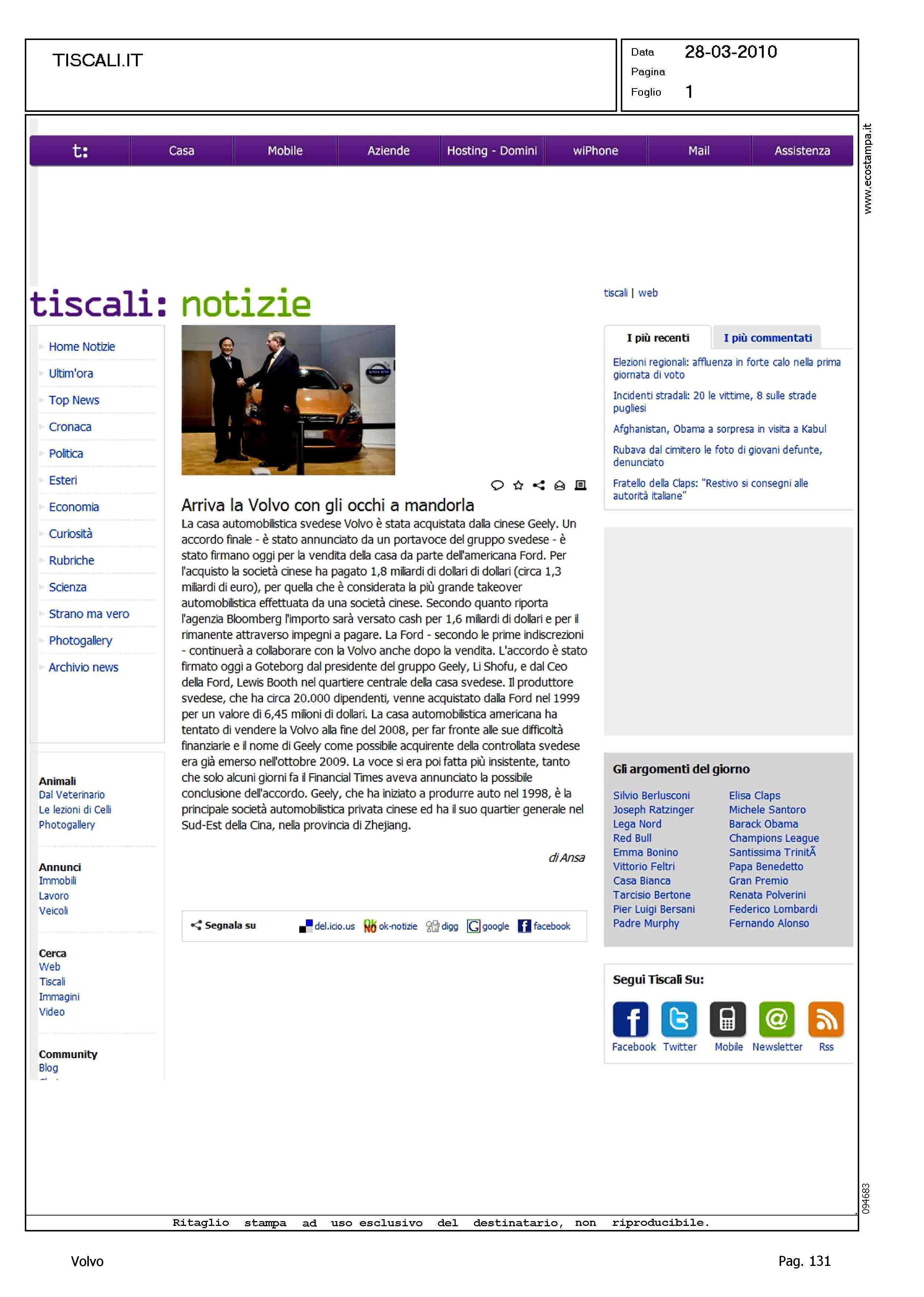 Title: TITOLI VARI - LA VOLVO DIVENTA CINESE, FIRMATA VENDITA DA FORD A GEELY - LA VOLVO E' DIVENTATA CINESE, FORD L'HA CEDUTA ALLA GEELY - ARRIVA LA VOLVO CON GLI OCCHI A MANDORLA