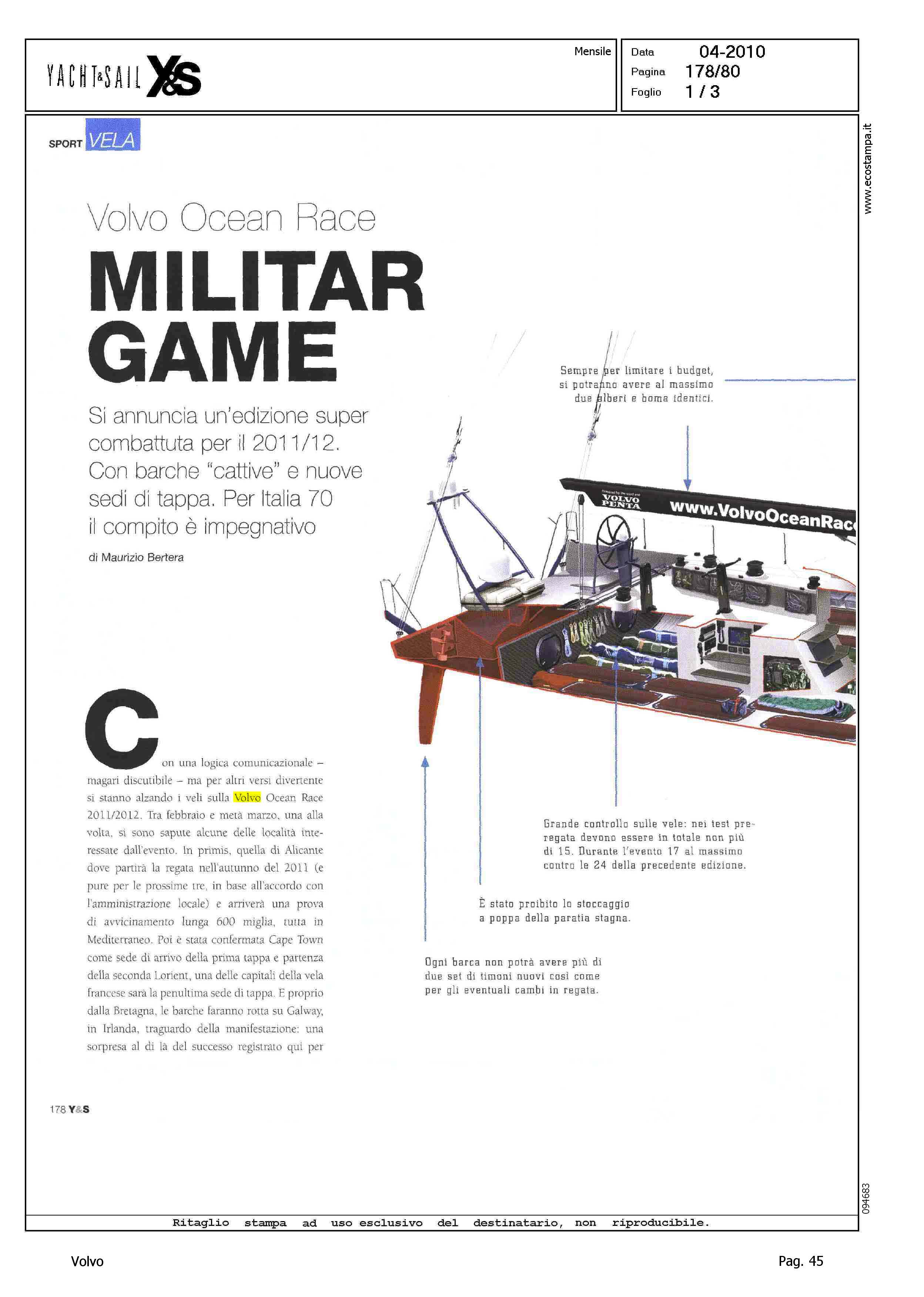 Author: BERTERA, MAURIZIOLine: Corporate Model: Corporate Subject: Volvo Ocean Race Title: VOLVO OCEAN RACE - MILITAR GAMEHighlight: TECNICA EDIZIONE VOR 2011