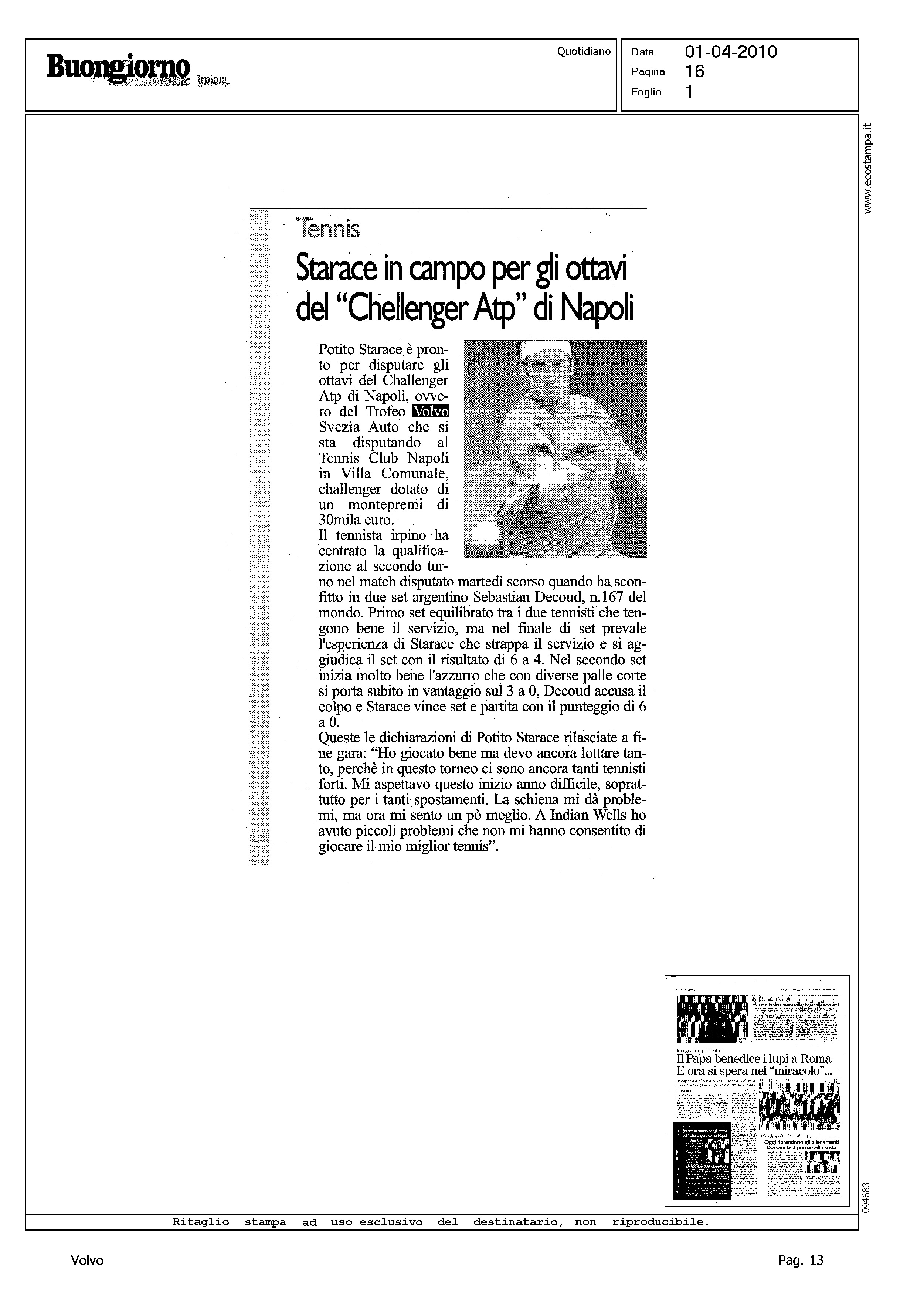 Author: Line: Corporate Model: Corporate Subject: - Title: STARACE IN CAMPO PER GLI OTTAVI DEL "CHELLENGER ATP (!) DI NAPOLIHighlight: TROFEO SVEZIA AUTO