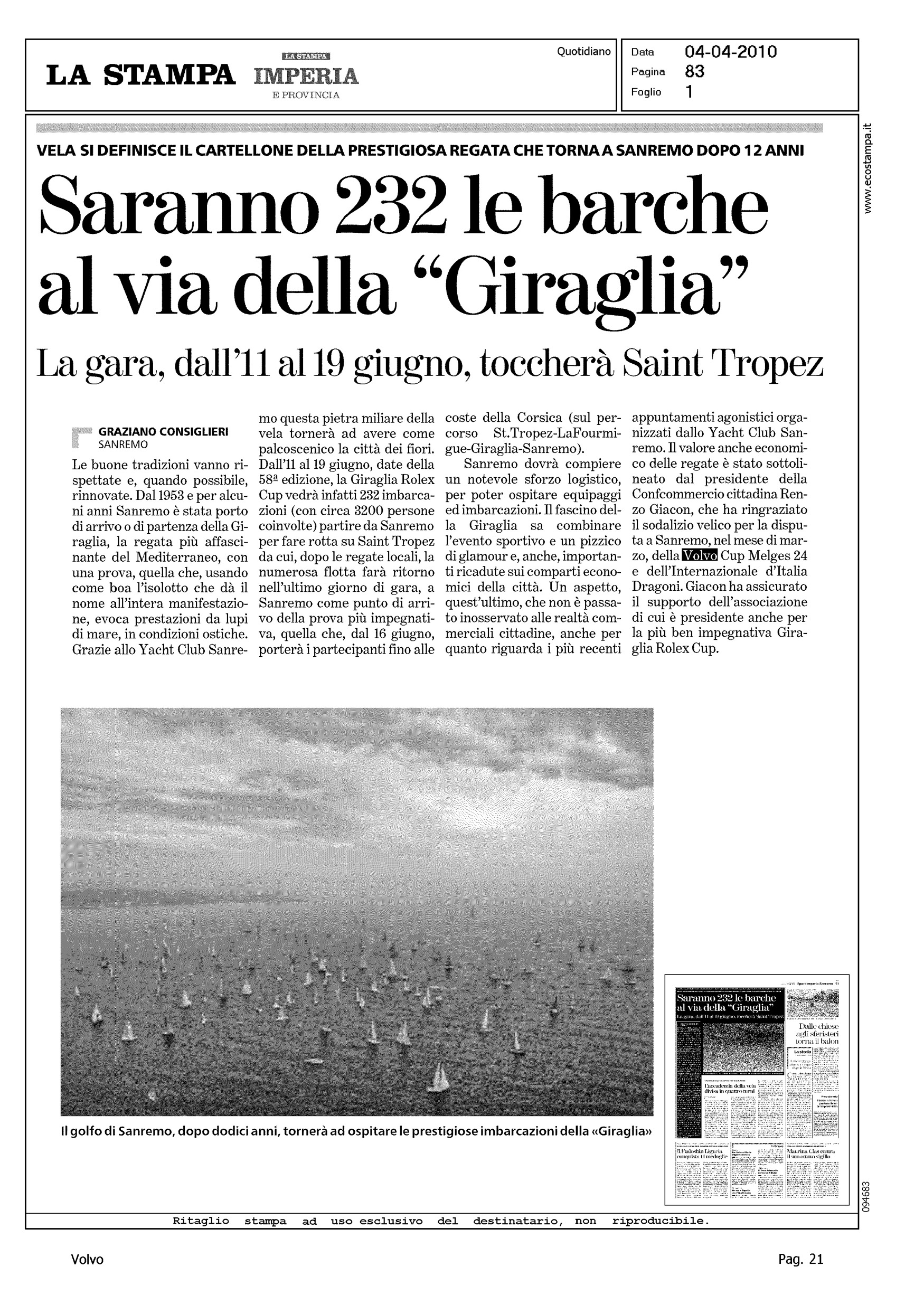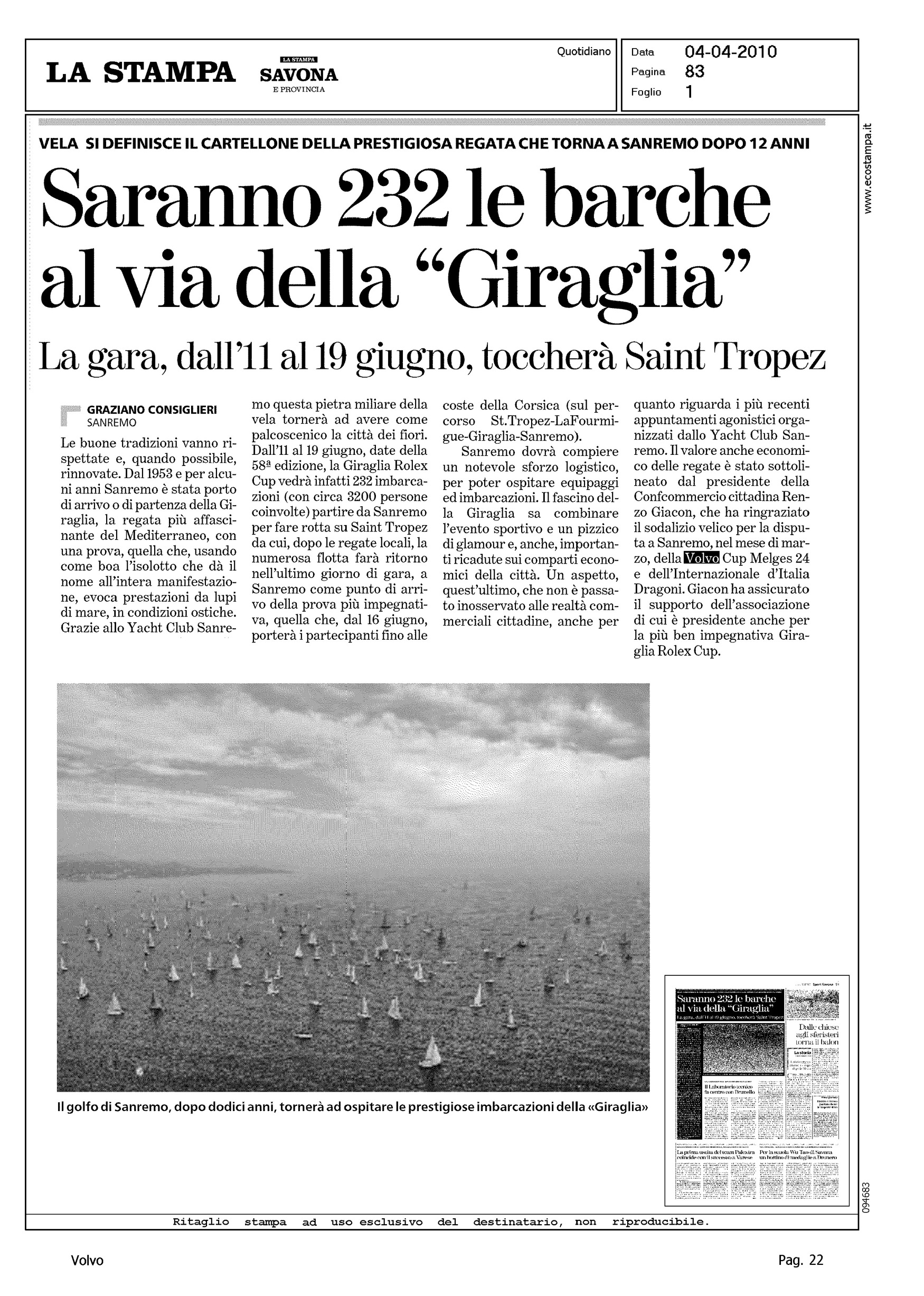 Author: CONSIGLIERI, GRAZIANOLine: Corporate Model: Corporate Subject: Volvo Cup Title: SARANNO 232 LE BARCHE AL VIA DELLA "GIRAGLIA"Highlight: (EDIZIONE IMPERIA, EDIZIONE SAVONA) - GIRAGLIA