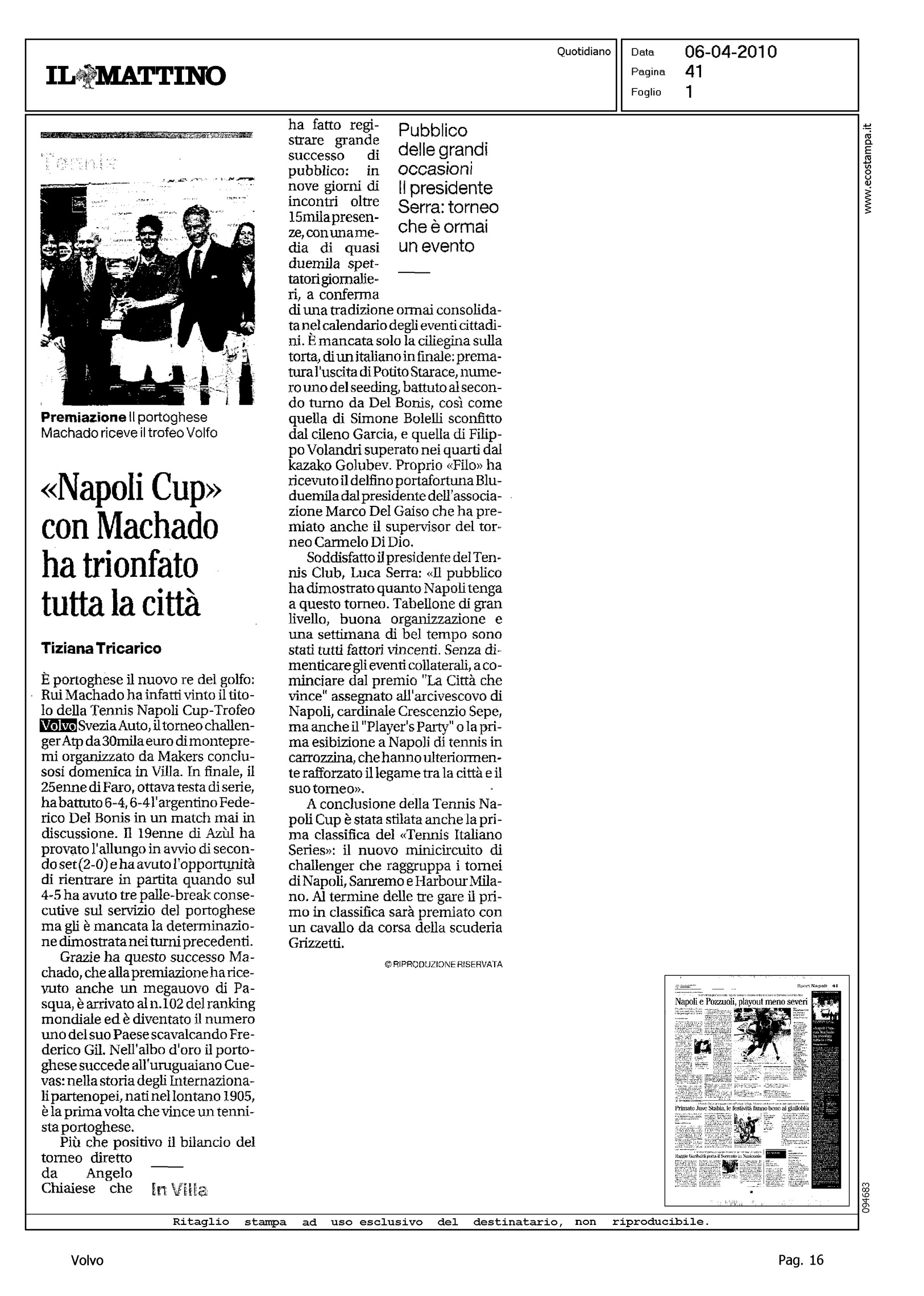Author: TRICARICO, TIZIANALine: Corporate Model: Corporate Subject: - Title: "NAPOLI CUP" CON MACHADO HA TRIONFATO TUTTA LA CITTA'Highlight: TROFEO SVEZIA AUTO