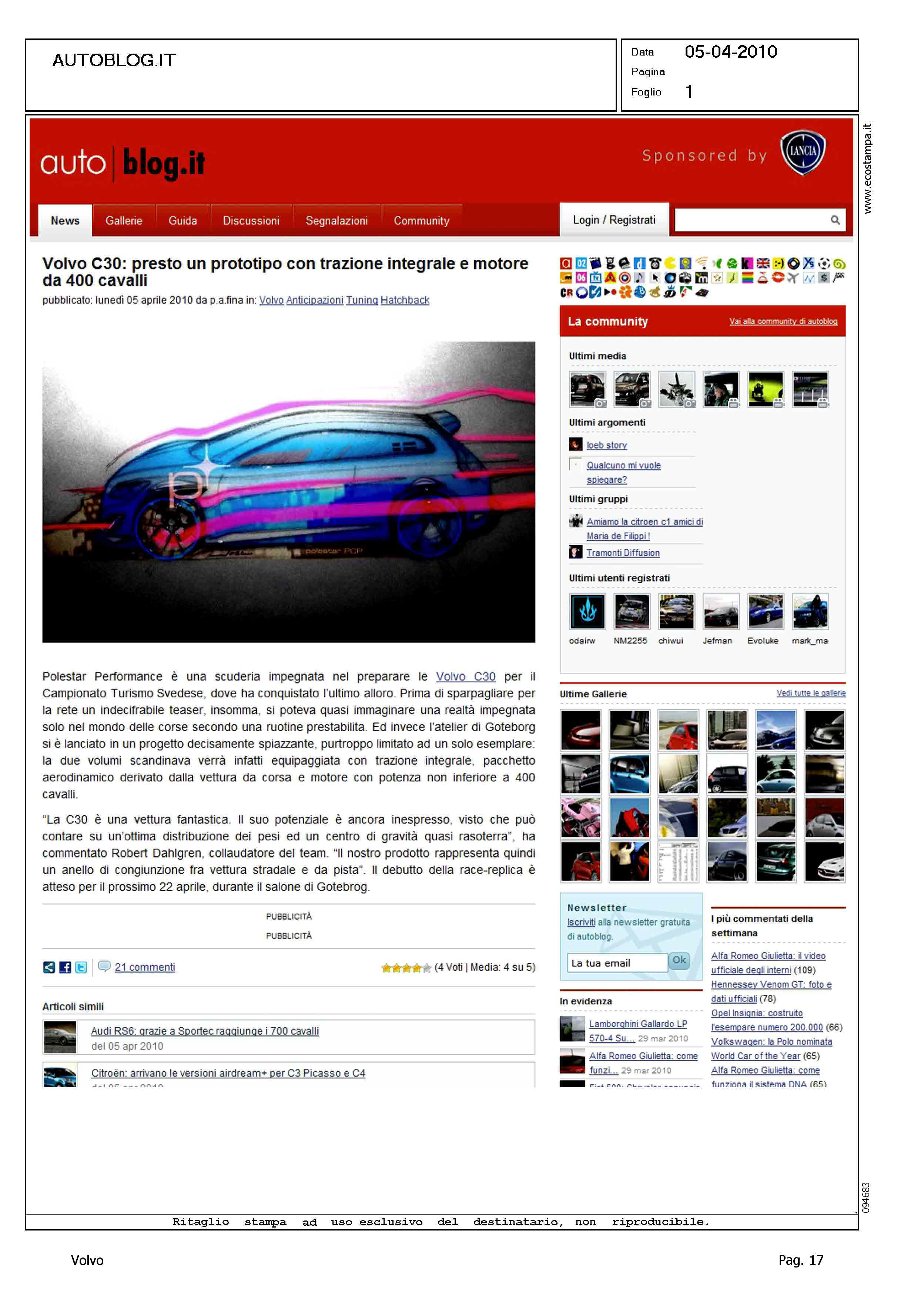 Author: Line: Corporate Model: Volvo C30 Subject: - Title: VOLVO C30: PRESTO UN PROTOTIPO CON TRAZIONE INTEGRALE E MOTORE DA 400 CAVALLIHighlight: CAMPIONATO TURISMO SVEDESE - TRAZIONE INTEGRALE SU C30