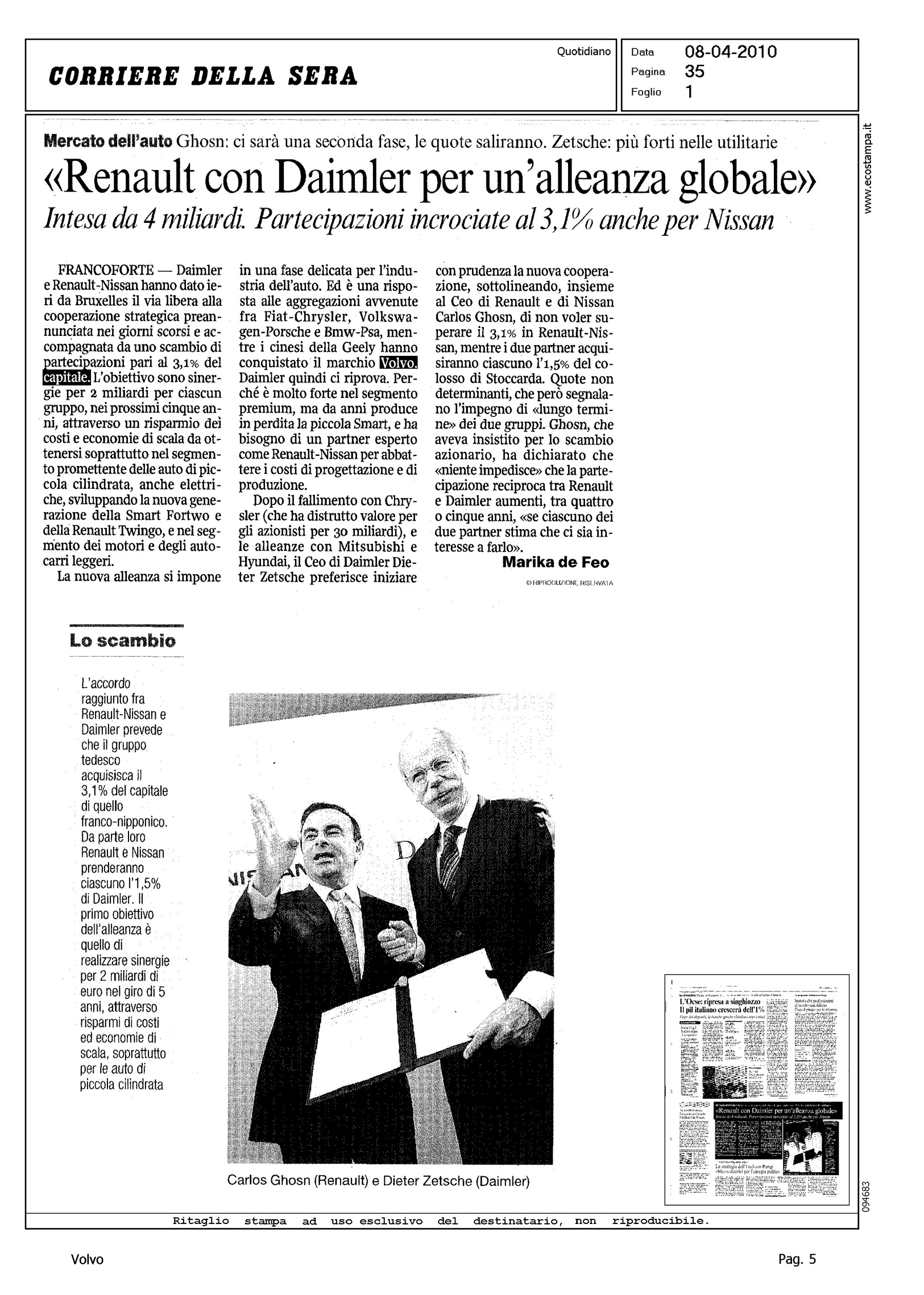 Author: DE FEO, MARIKALine: Corporate Model: Corporate Subject: - Title: "RENAULT CON DAIMLER PER UN'ALLEANZA GLOBALE"Highlight: CITAZIONE IN ARTICOLO A COMMENTO ALLEANZA DAIMLER-RENAULT SU NUOVI ASSETTI INDUSTRIA AUTO NEL MONDO
