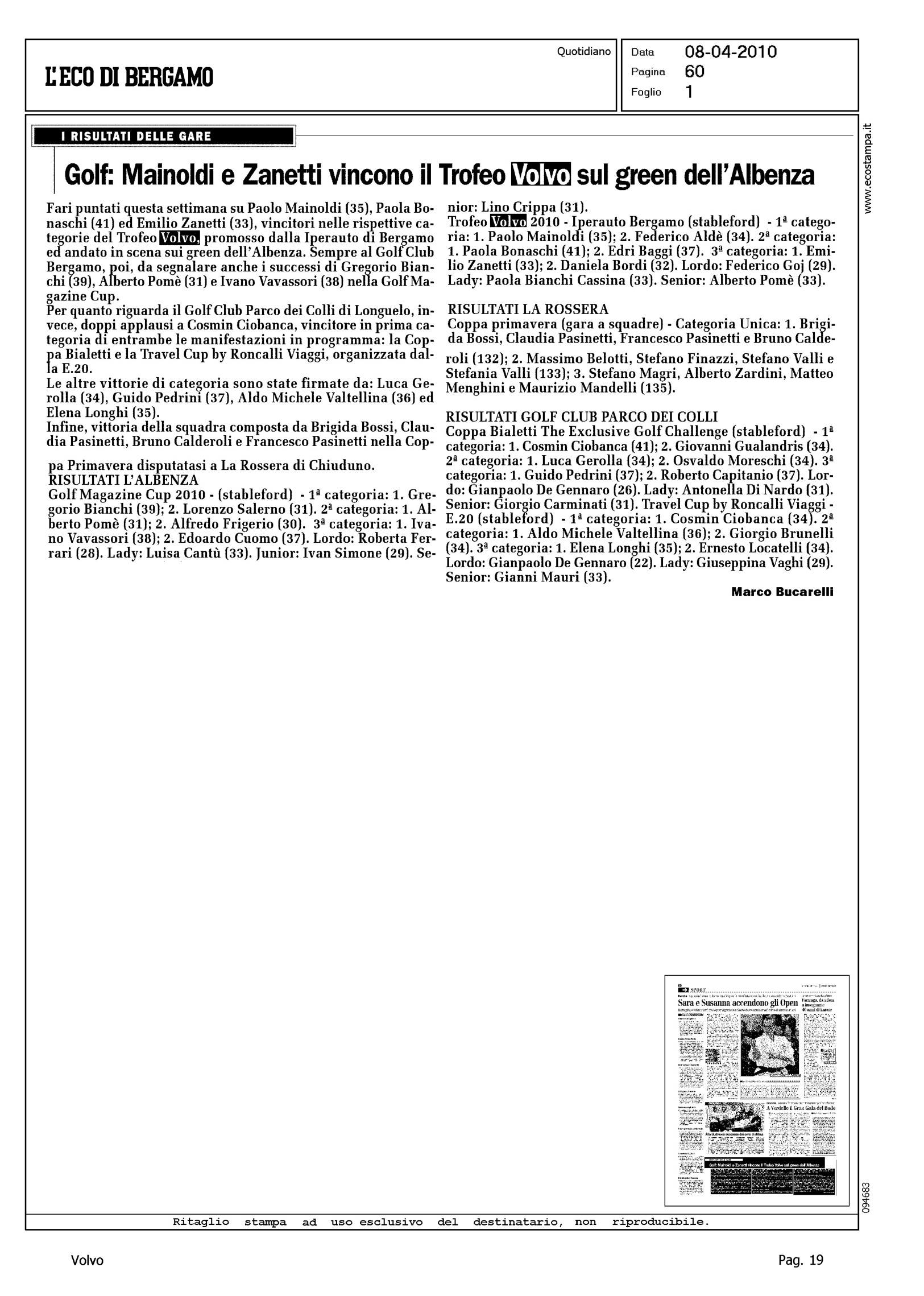 Author: BUCARELLI, MARCOLine: Corporate Model: Corporate Subject: Volvo Master Title: GOLF: MAINOLDI E ZANETTI VINCONO IL TROFEO VOLVO SUL GREEN DELL'ALBENZAHighlight: CLASSIFICA