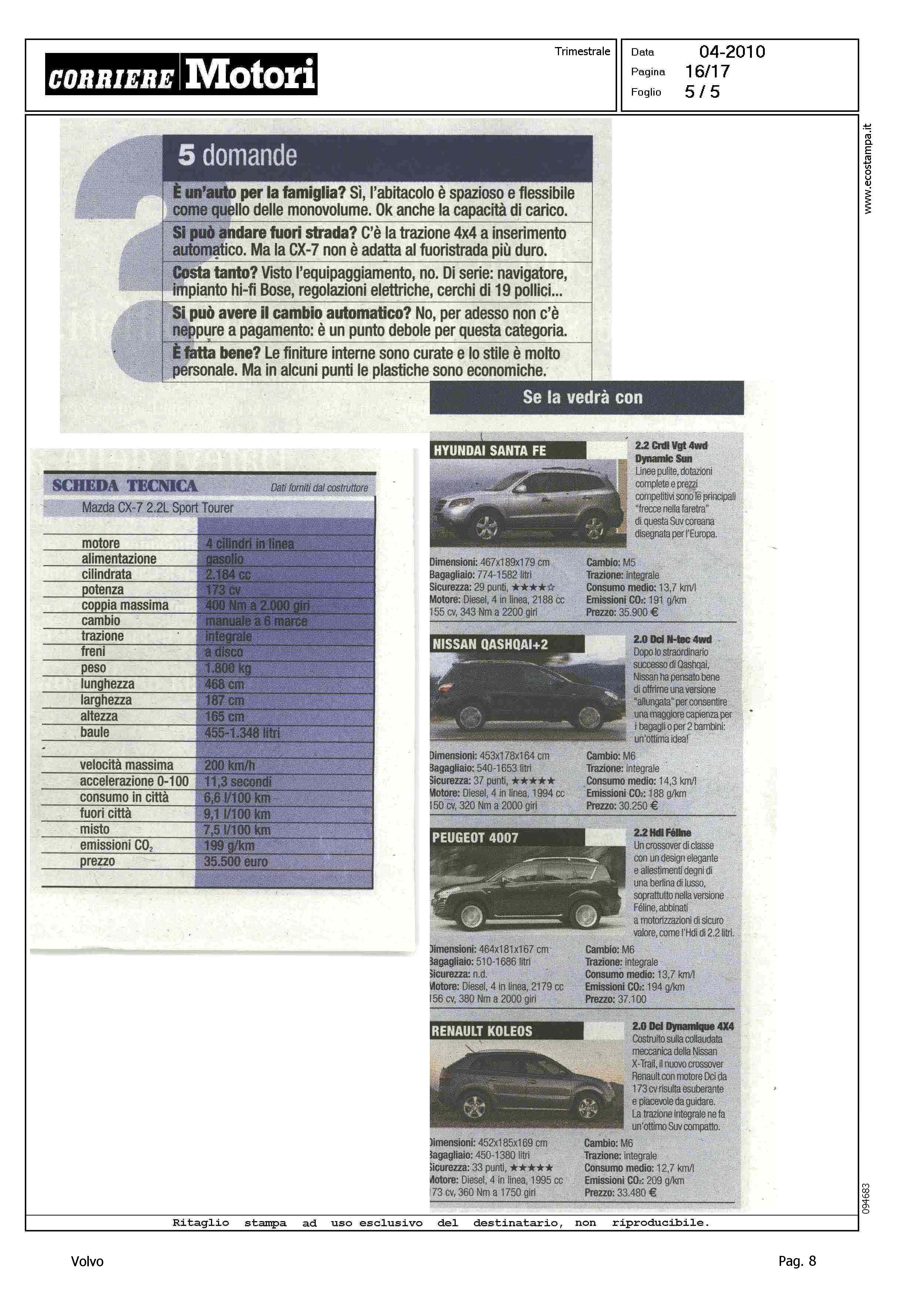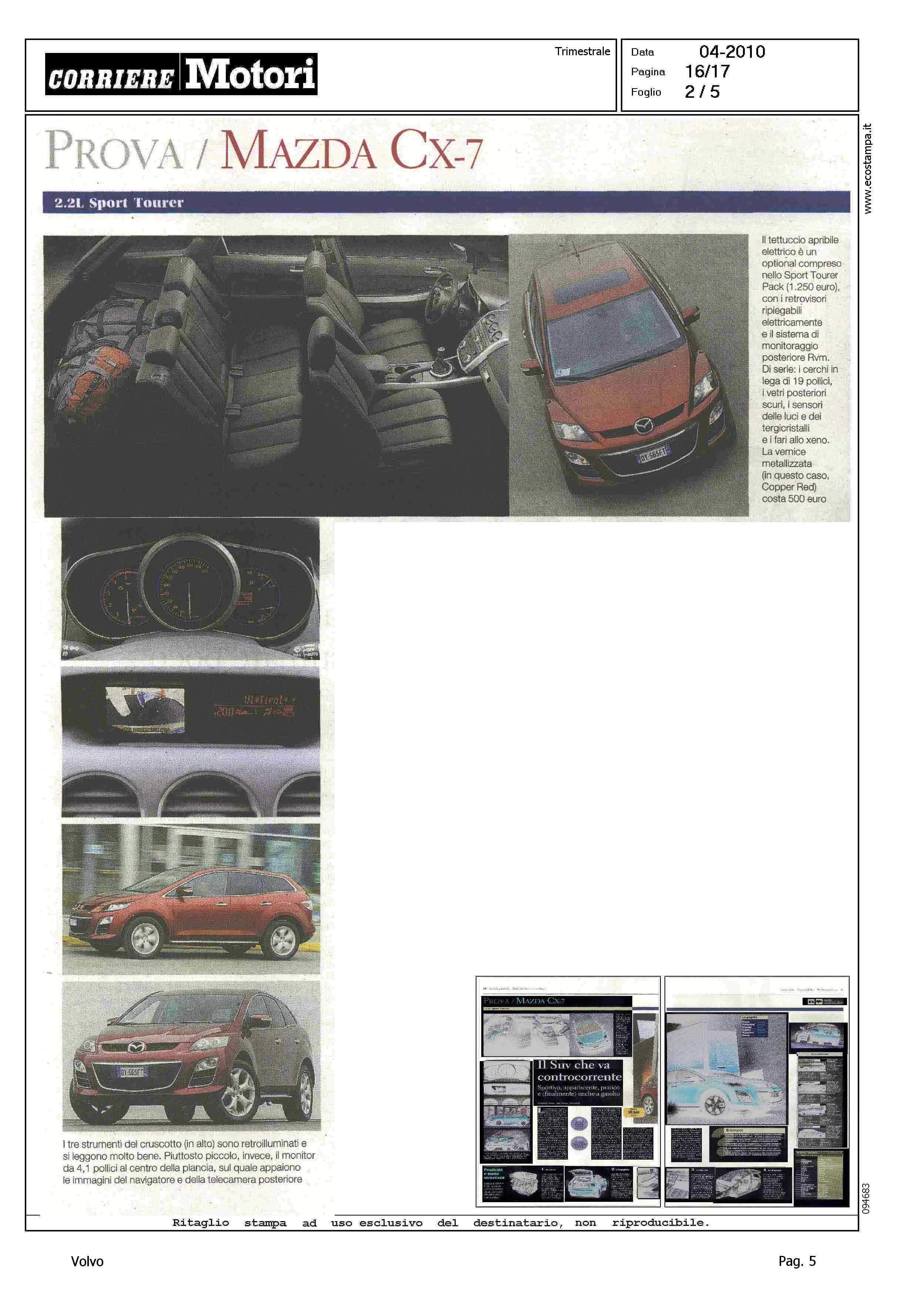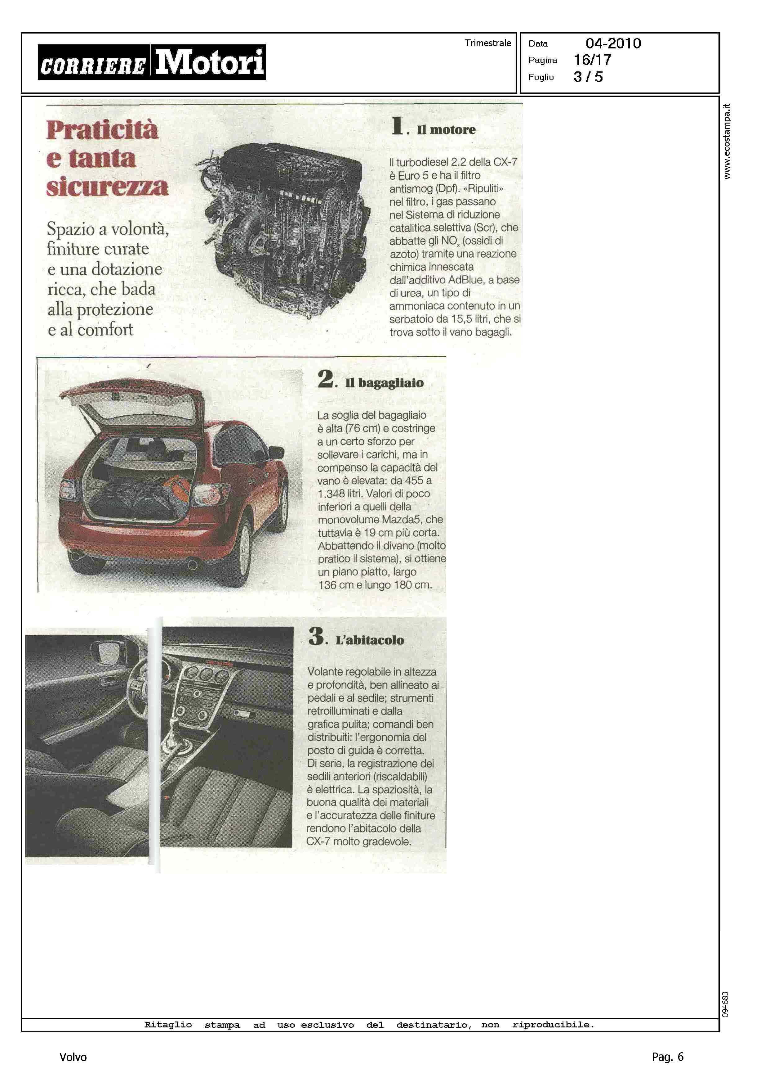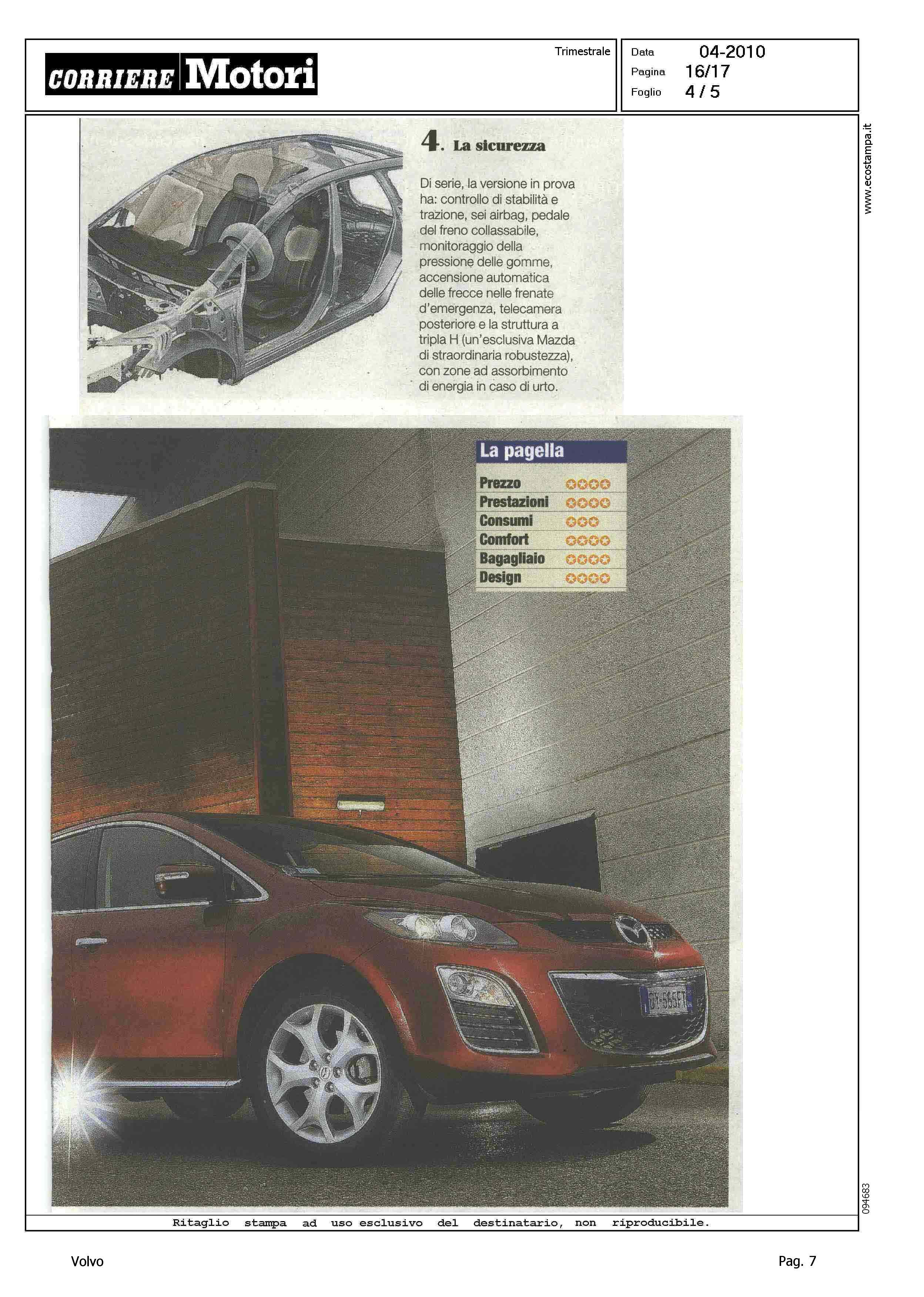 Author: IASONI, ROBERTOLine: Corporate Model: Volvo XC70 Subject: - Title: IL SUV CHE VA CONTROCORRENTE (titolo per Mazda CX-7)Highlight: CITAZIONE IN ARTICOLO SU CX-7 MAZDA