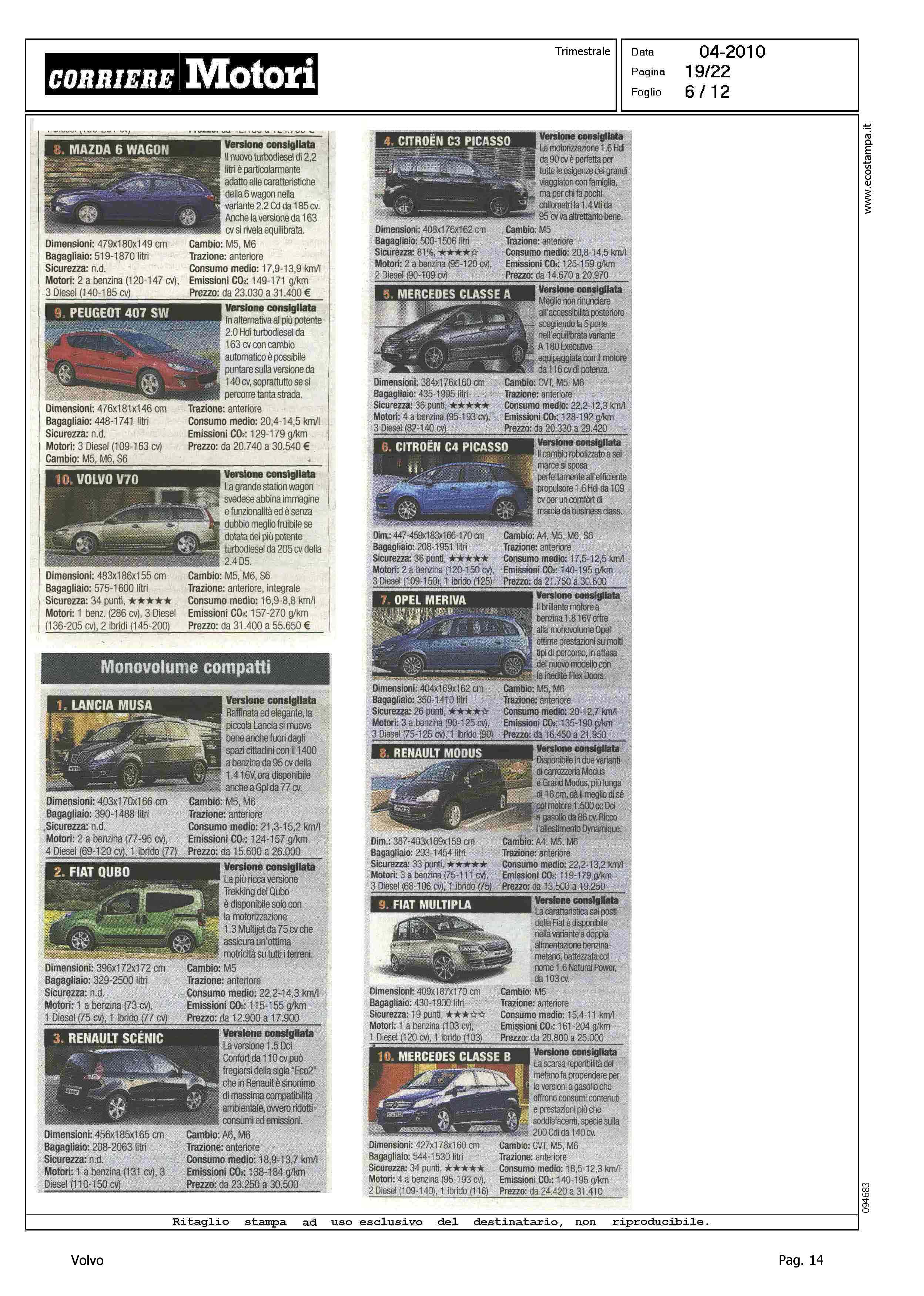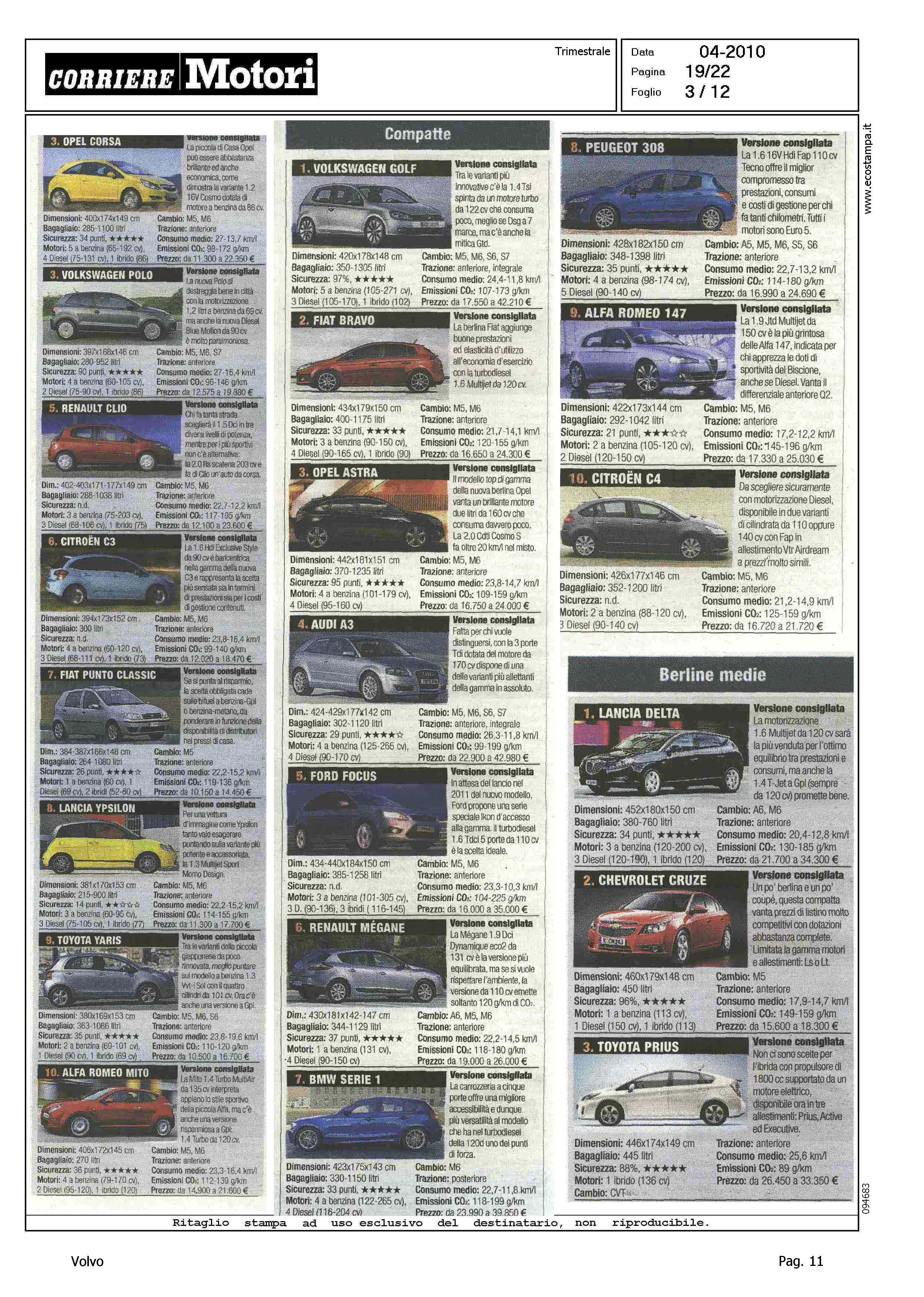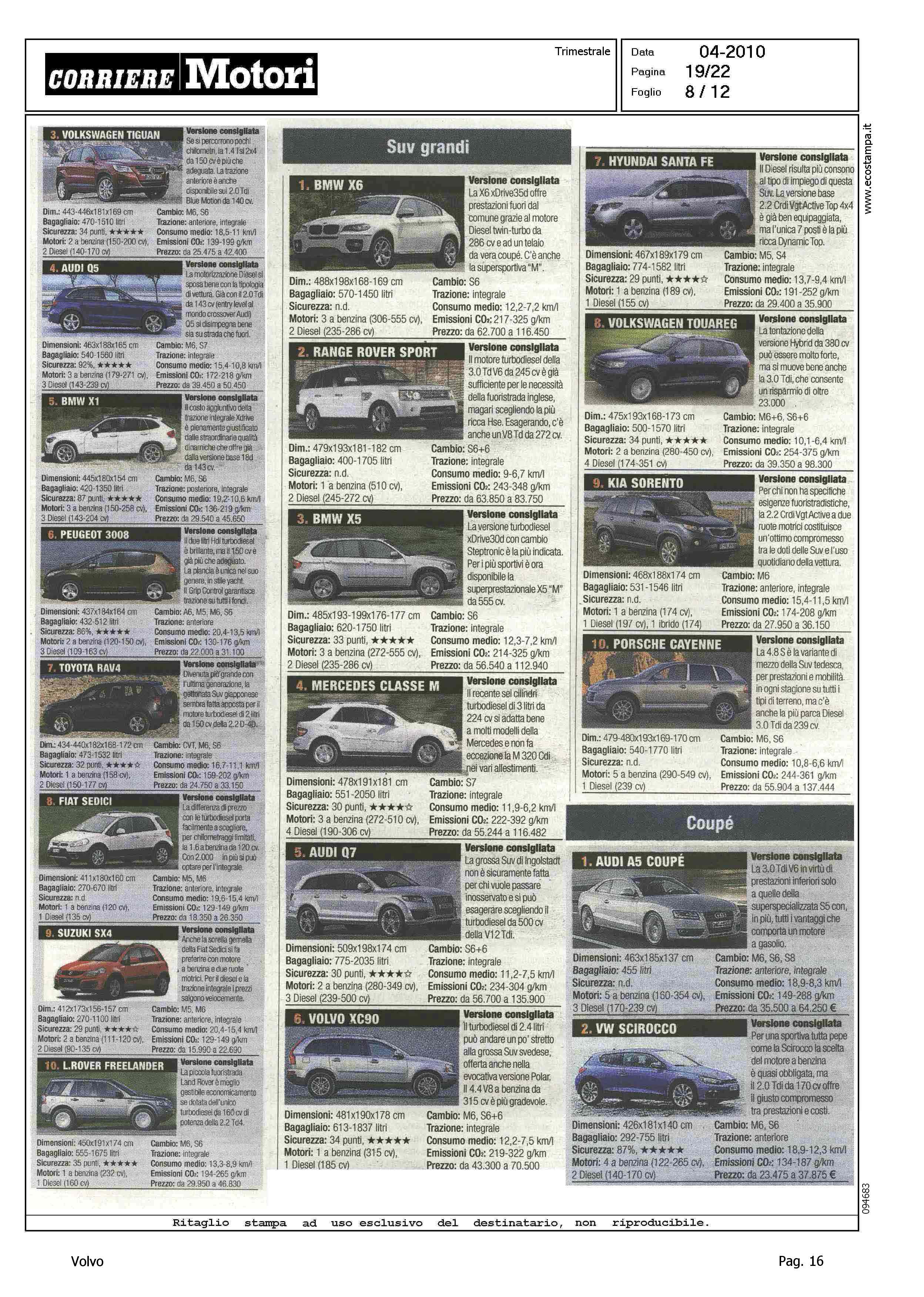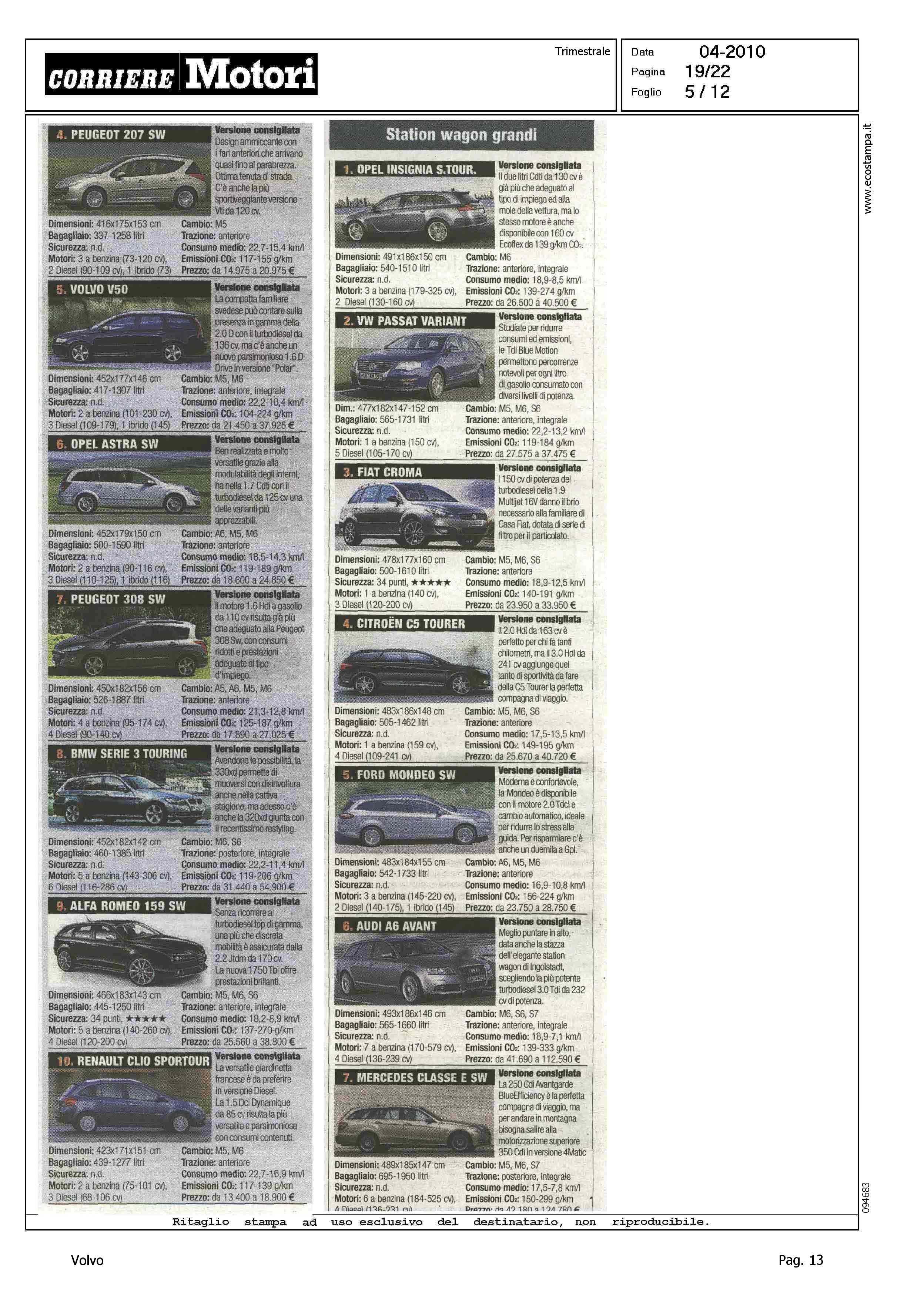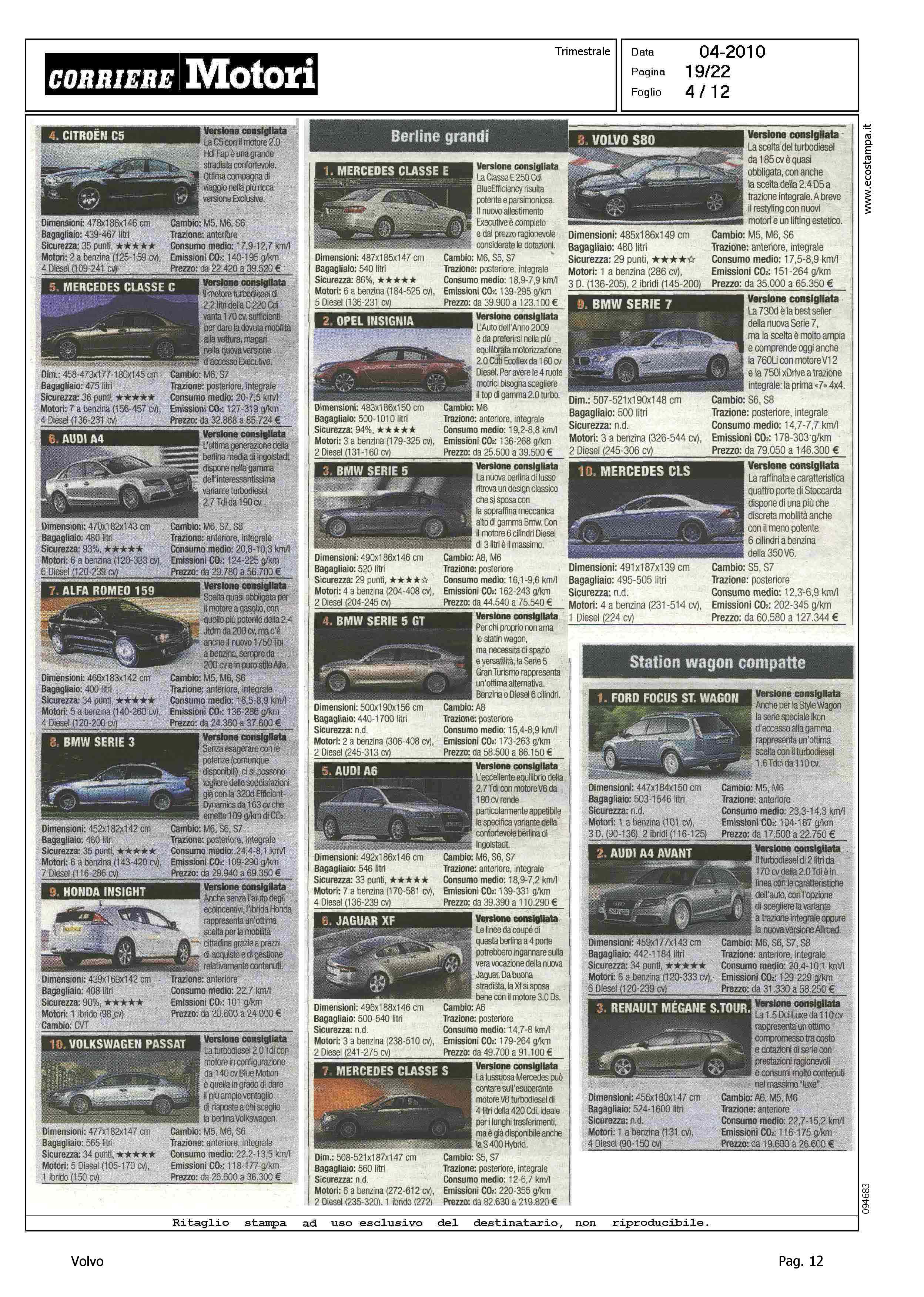 Highlight: TABELLE CON FOTO - RIPARTIZIONE PER CATEGORIA - SINTETICA SCHEDA TECNICA PRODOTTO - BERLINE GRANDI, VOLVO S80, 8° - STATION WAGON COMPATTE, VOLVO V50, 5° - STATION WAGON GRANDI, VOLVO V70, 10° - SUV GRANDI, VOLVO XC90, 6°