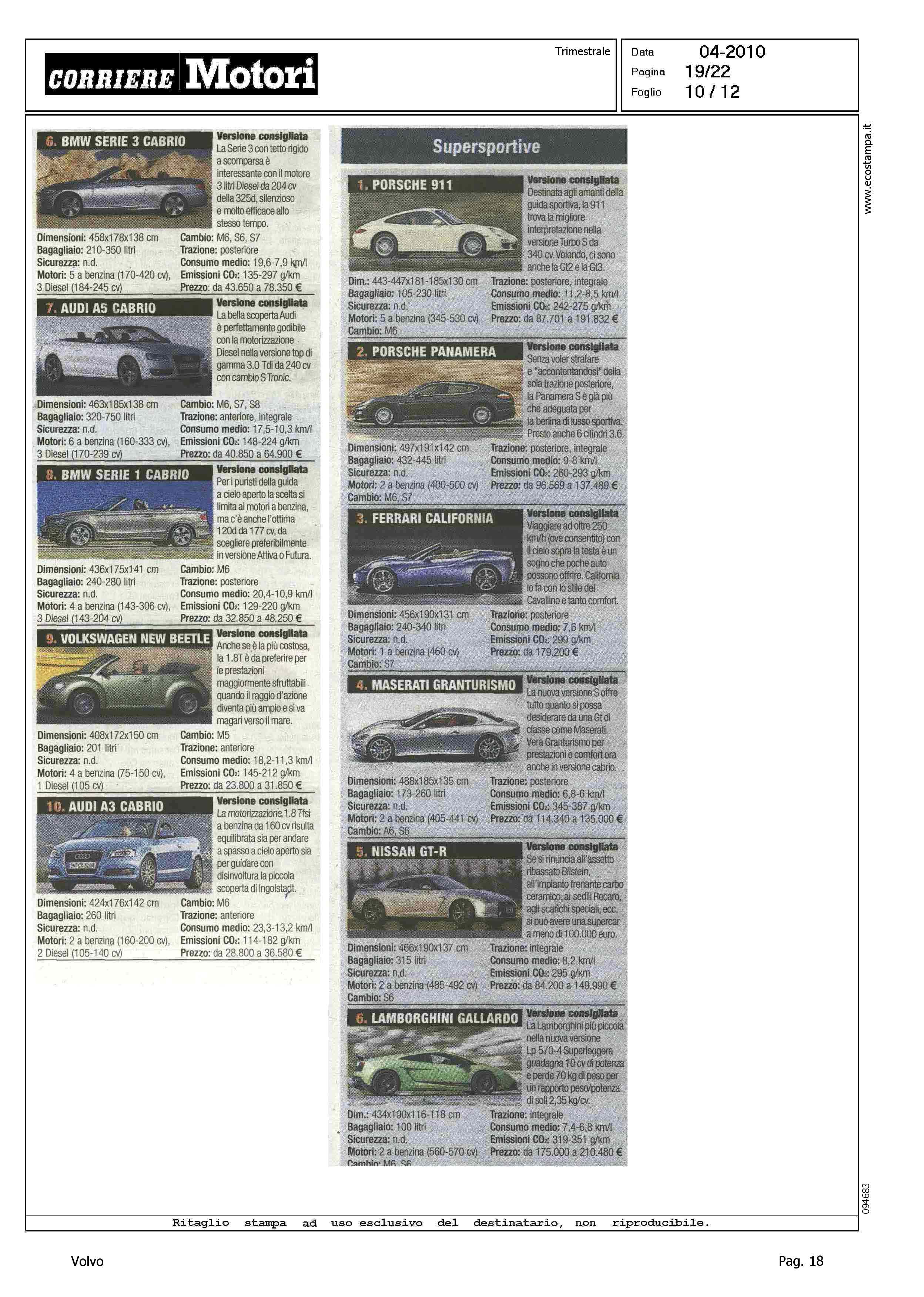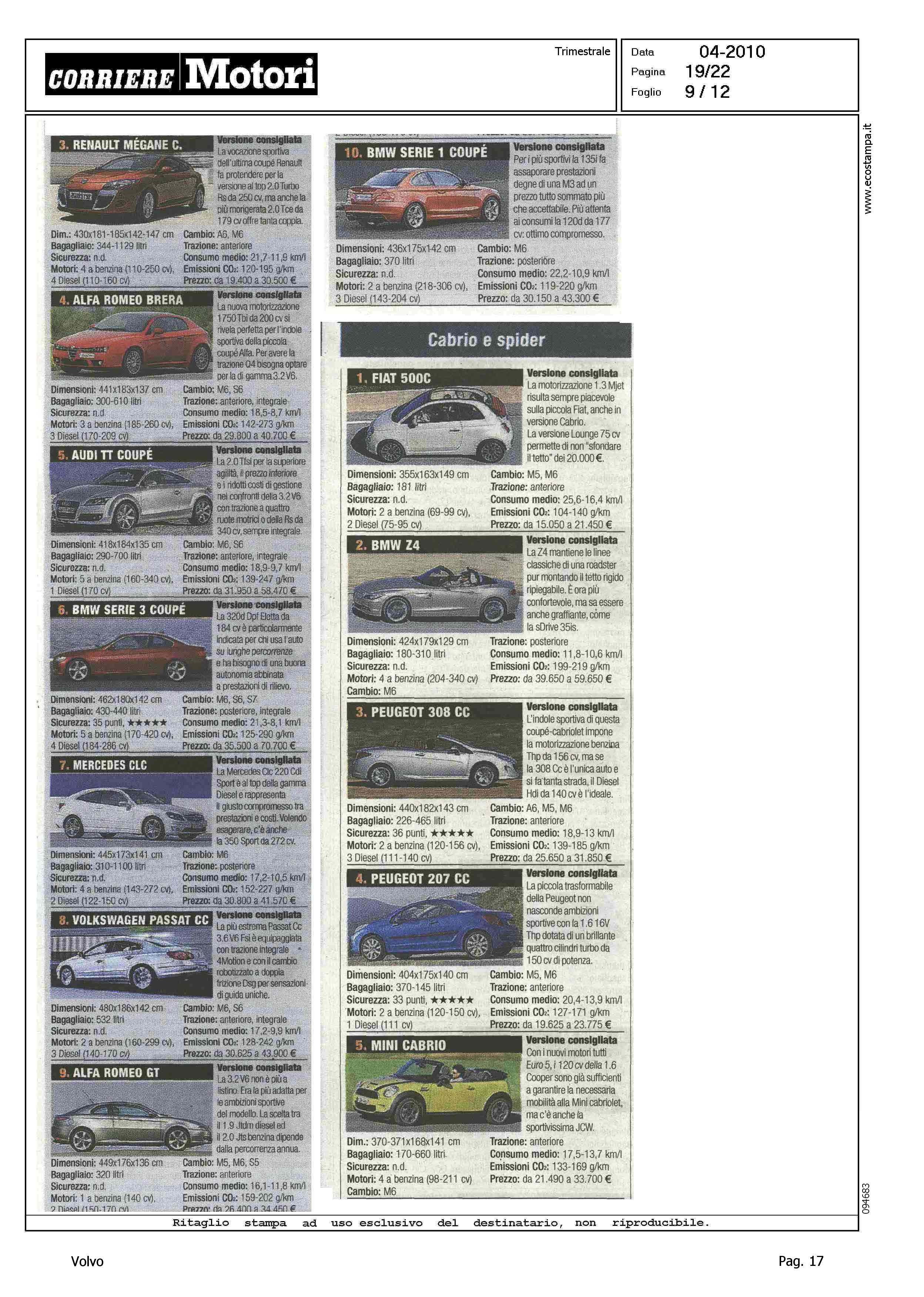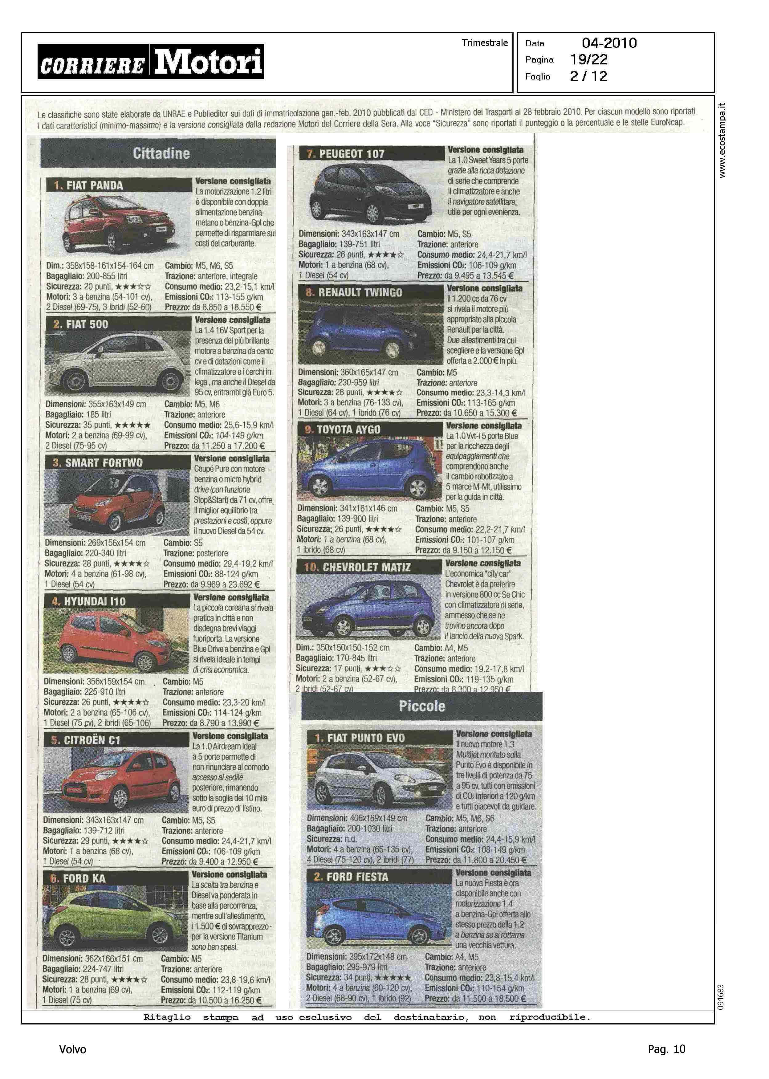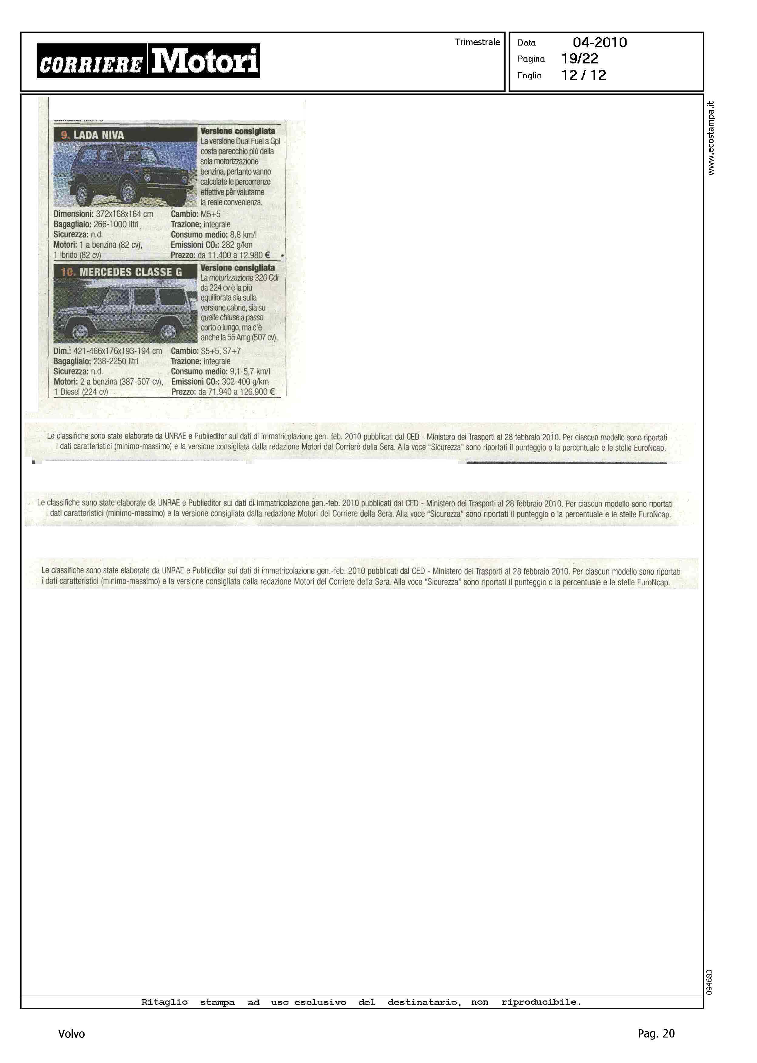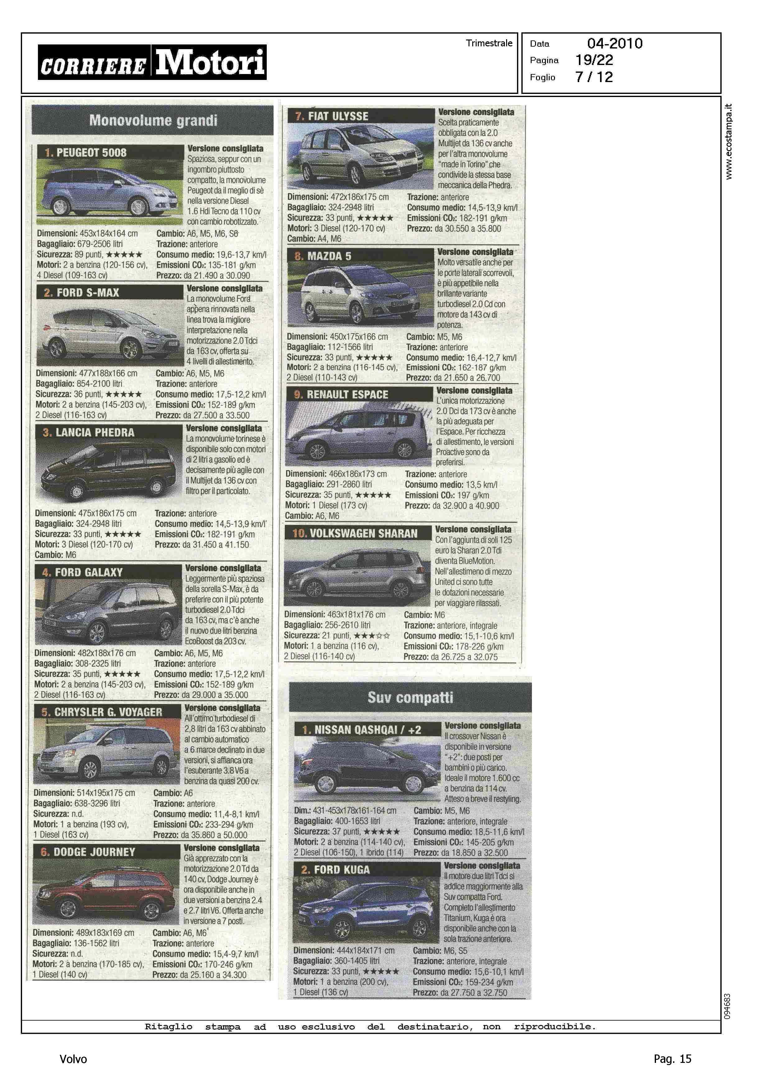 Highlight: TABELLE CON FOTO - RIPARTIZIONE PER CATEGORIA - SINTETICA SCHEDA TECNICA PRODOTTO - BERLINE GRANDI, VOLVO S80, 8° - STATION WAGON COMPATTE, VOLVO V50, 5° - STATION WAGON GRANDI, VOLVO V70, 10° - SUV GRANDI, VOLVO XC90, 6°