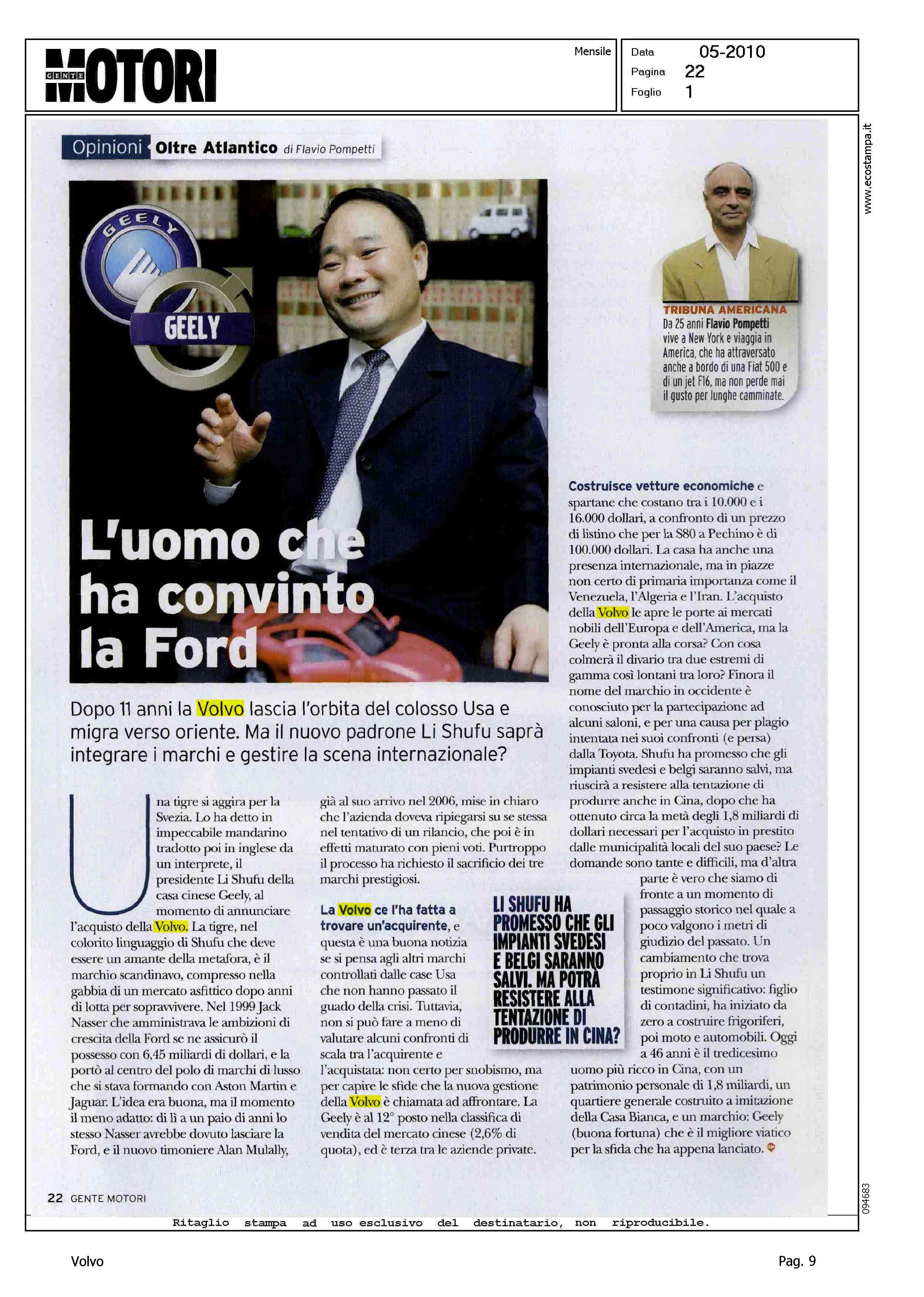 Author: POMPETTI, FLAVIOLine: Corporate Model: Corporate Subject: - Title: L'UOMO CHE HA CONVINTO FORDHighlight: SCENARI DOPO ACQUISIZIONE VOLVO