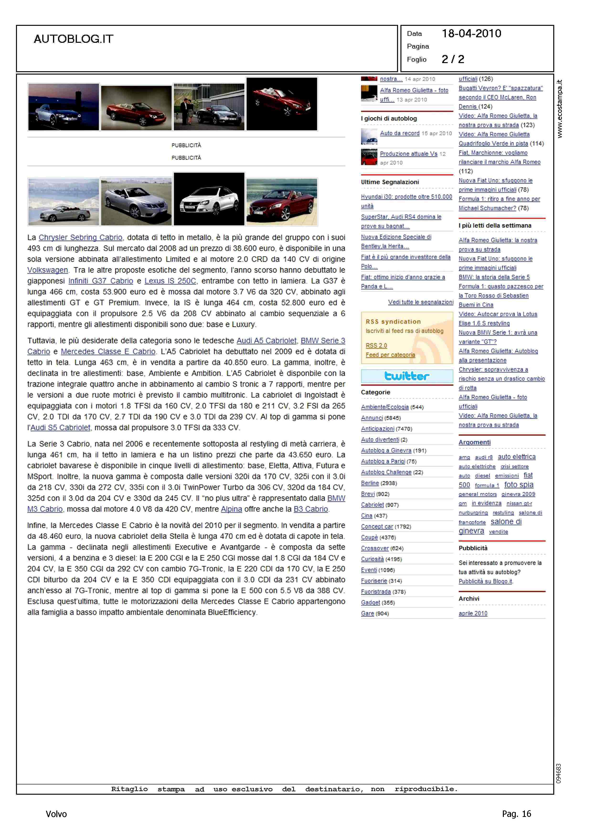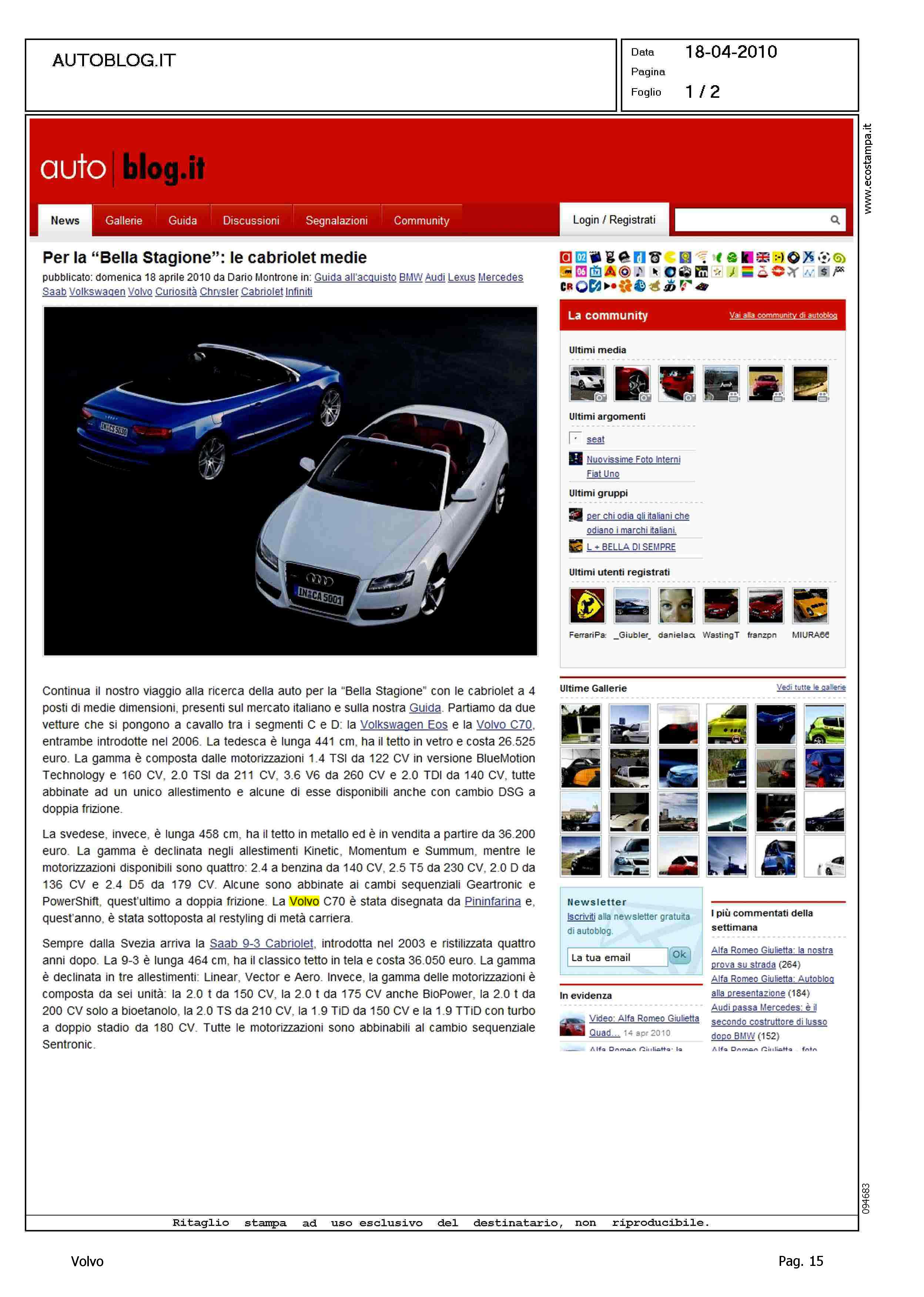 Author: Line: Corporate Model: Volvo C70 Convertible Subject: - Title: PER LA "BELLA STAGIONE": LE CABRIOLET MEDIEHighlight: MOTORI - PREZZI - DESIGN - PININFARINA
