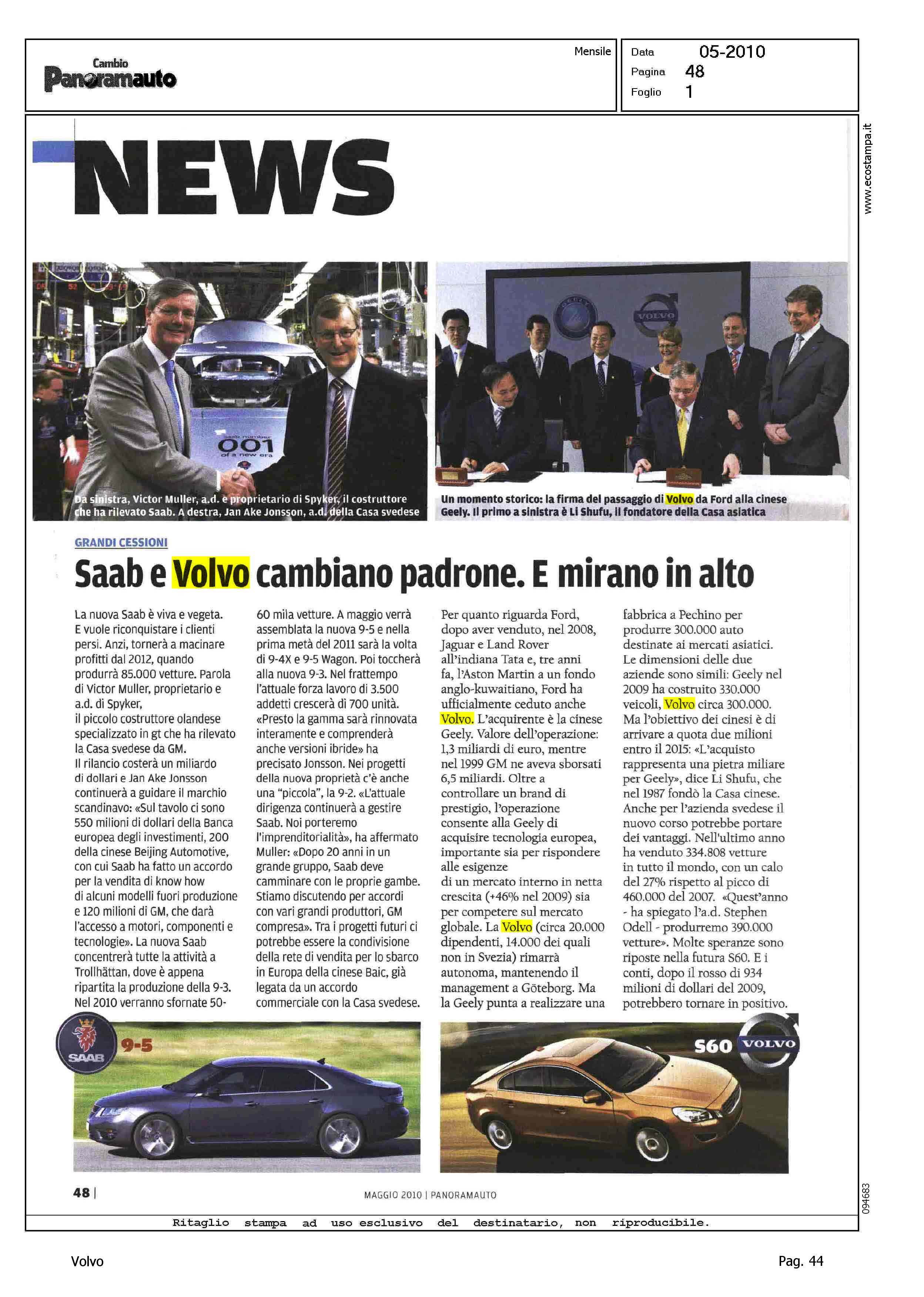 Author: Line: Corporate Model: Corporate Subject: - Title: SAAB E VOLVO CAMBIANO PADRONE. E MIRANO IN ALTOHighlight: VENDITA VOLVO ALLA GEELY