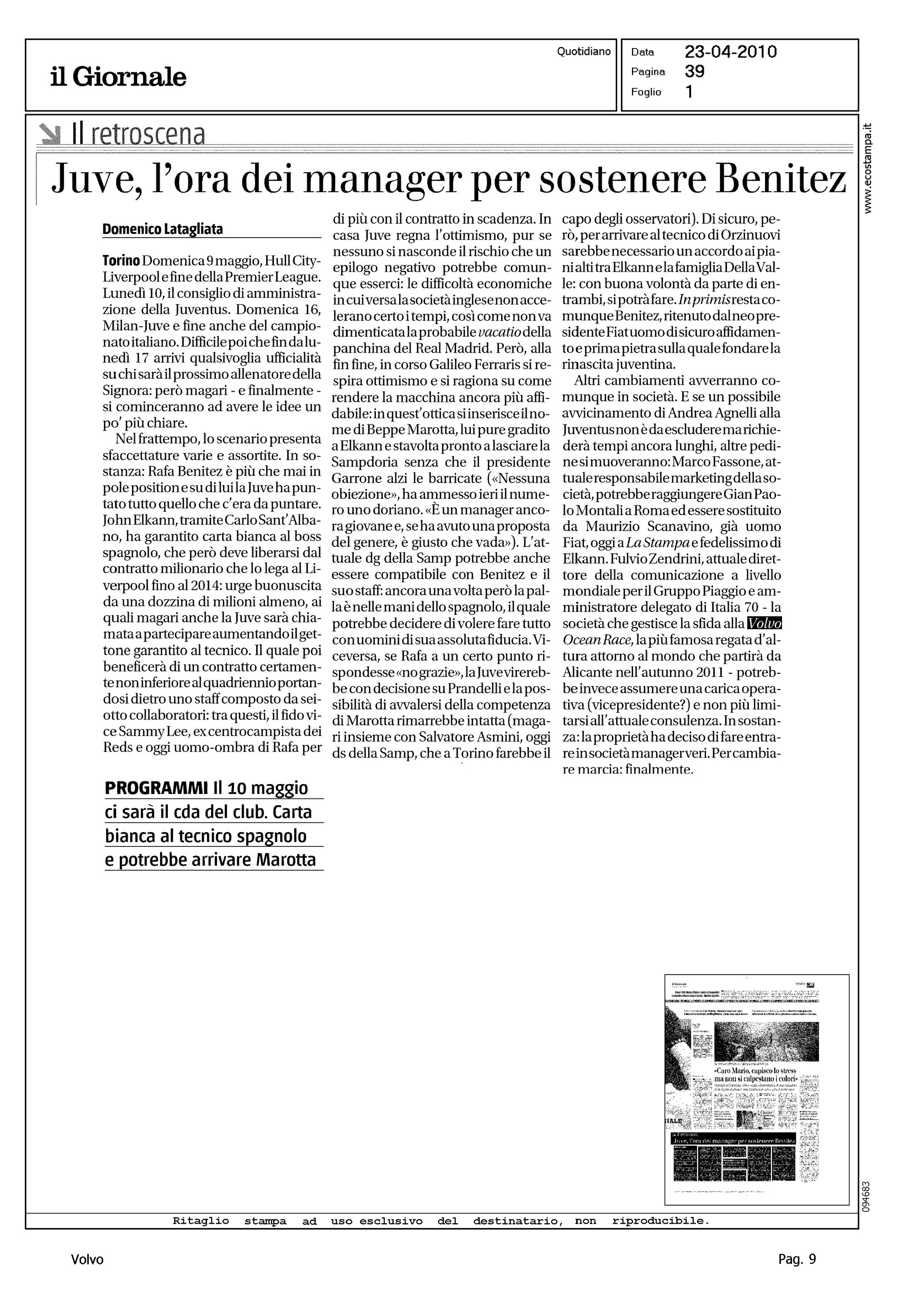 Author: LATAGLIATA, DOMENICOLine: Corporate Model: Corporate Subject: Volvo Ocean Race Title: JUVE, L'ORA DEI MANAGER PER SOSTENERE BENITEZHighlight: CITAZIONE - PARTECIPAZIONE ITALIANA REGATA 2011 - ZENDRINI - ITALIA 70