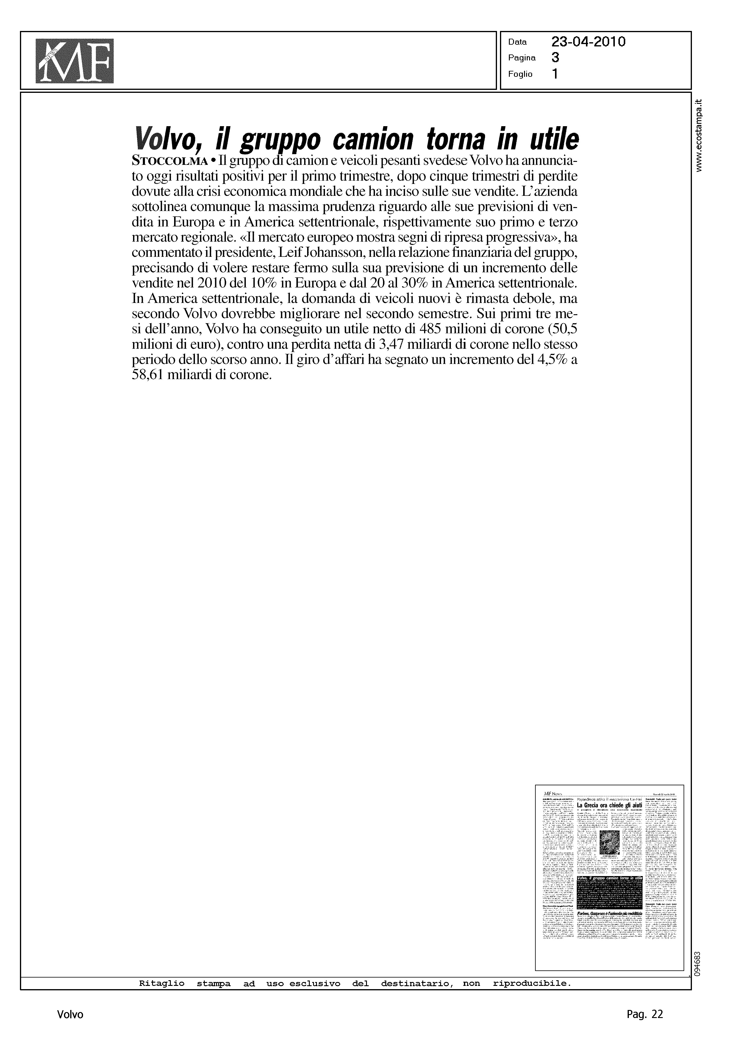 Author: Line: Corporate Model: Corporate Subject: - Title: VOLVO, IL GRUPPO CAMION TORNA IN UTILEHighlight: TRUCK, UTILI PRIMO TRIMESTRE