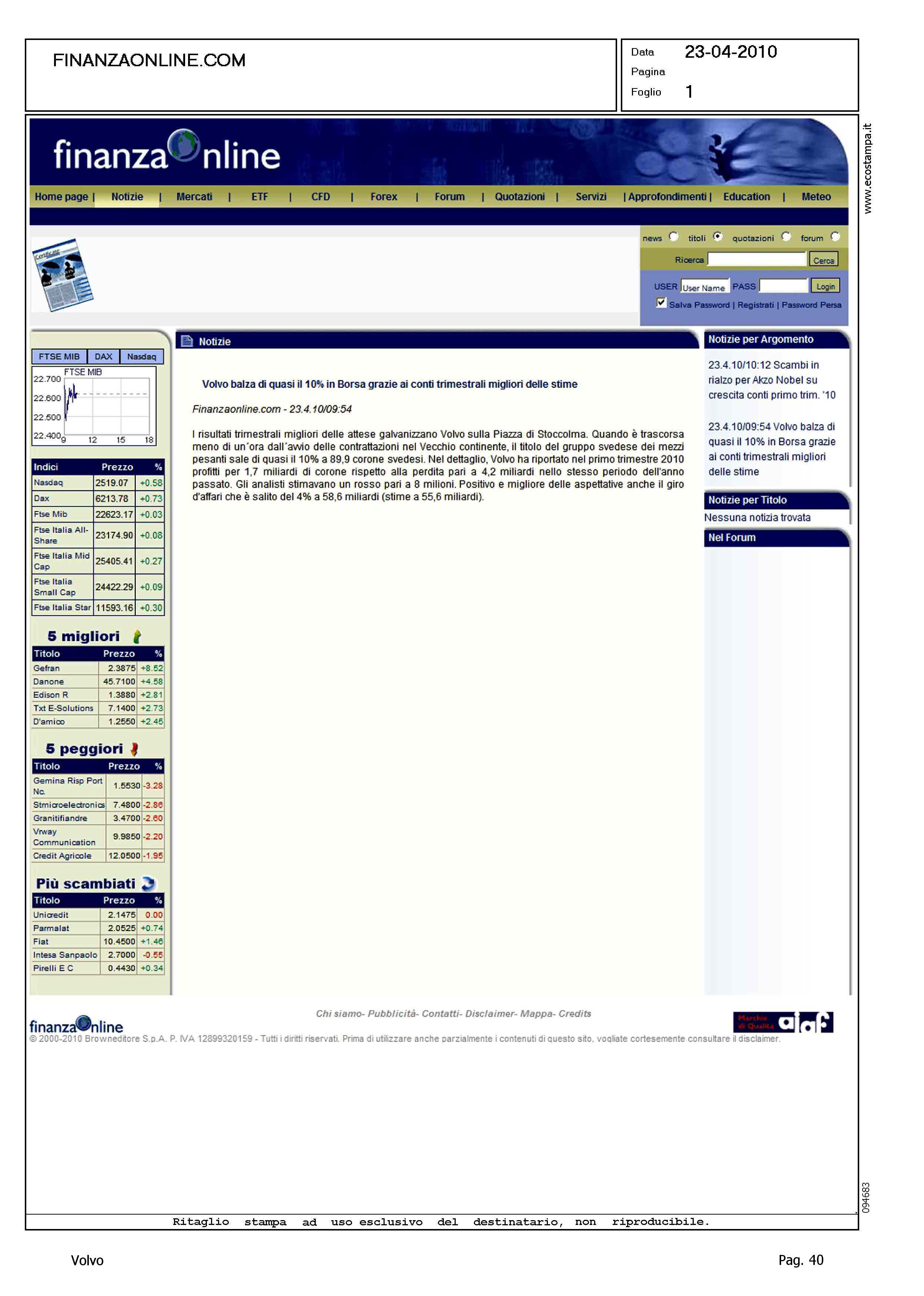 Author: Line: Corporate Model: Corporate Subject: - Title: VOLVO BALZA DI QUASI IL 10% IN BORSA GRAZIE AI CONTI TRIMESTRALI MIGLIORI DELLE STIMEHighlight: QUOTAZIONE AZIONI VOLVO IN BORSA