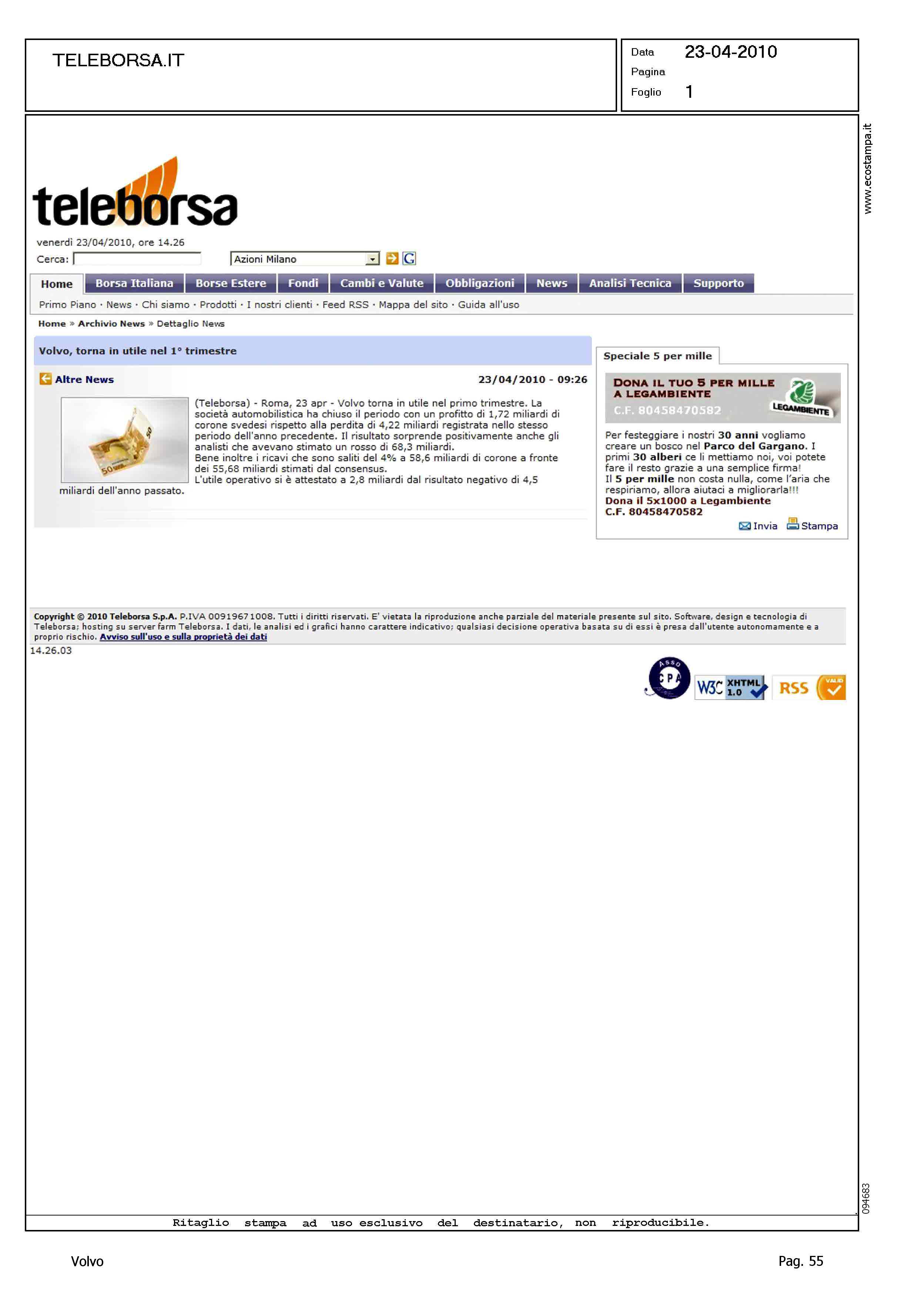 Author: Line: Corporate Model: Corporate Subject: - Title: VOLVO, TORNA IN UTILE NEL 1° TRIMESTREHighlight: UTILI PRIMO TRIMESTRE