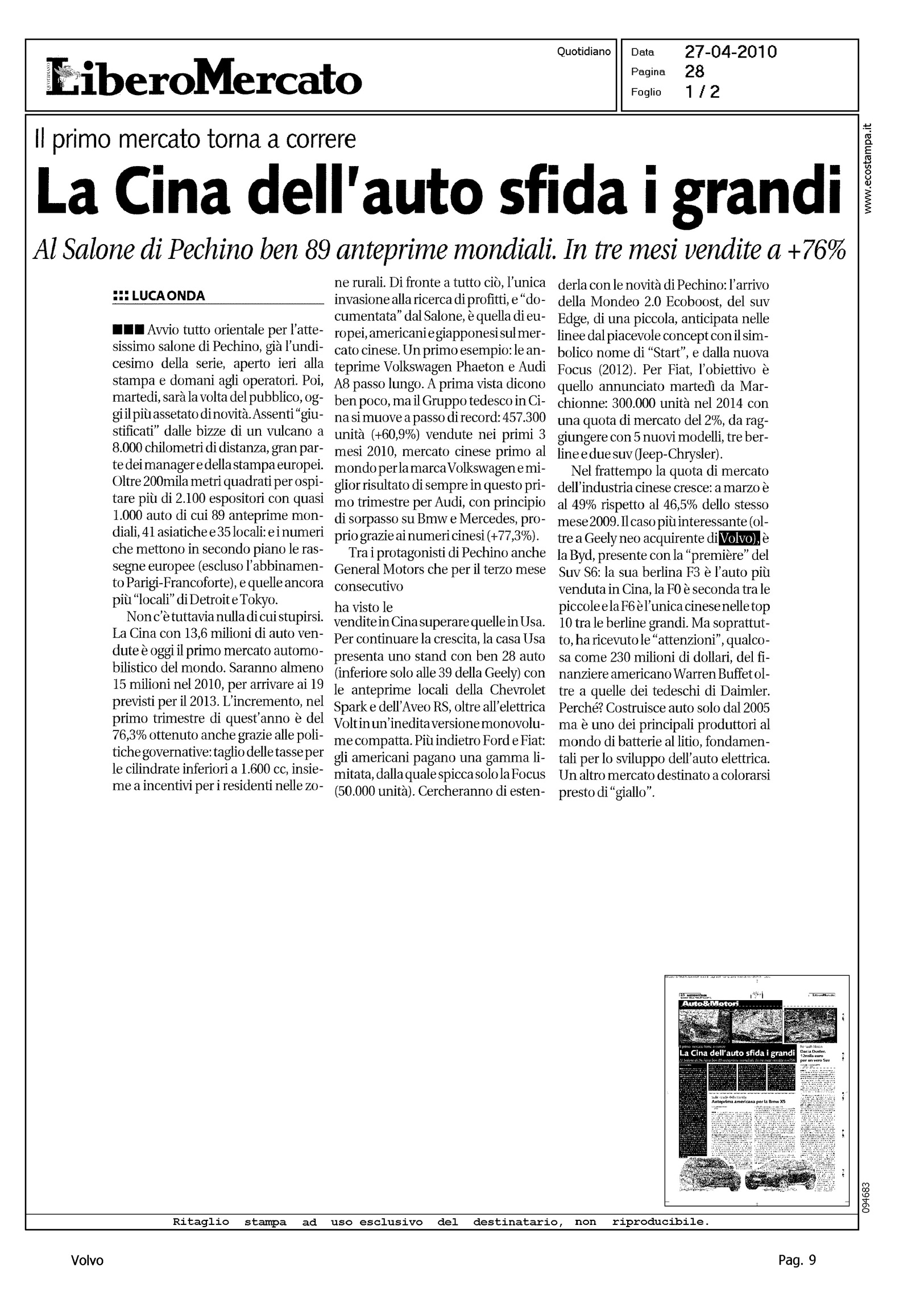 Author: ONDA, LUCALine: Corporate Model: Corporate Subject: - Title: LA CINA DELL'AUTO SFIDA I GRANDIHighlight: (SALONE DI PECHINO) - CITAZIONE ACQUISTO VOLVO