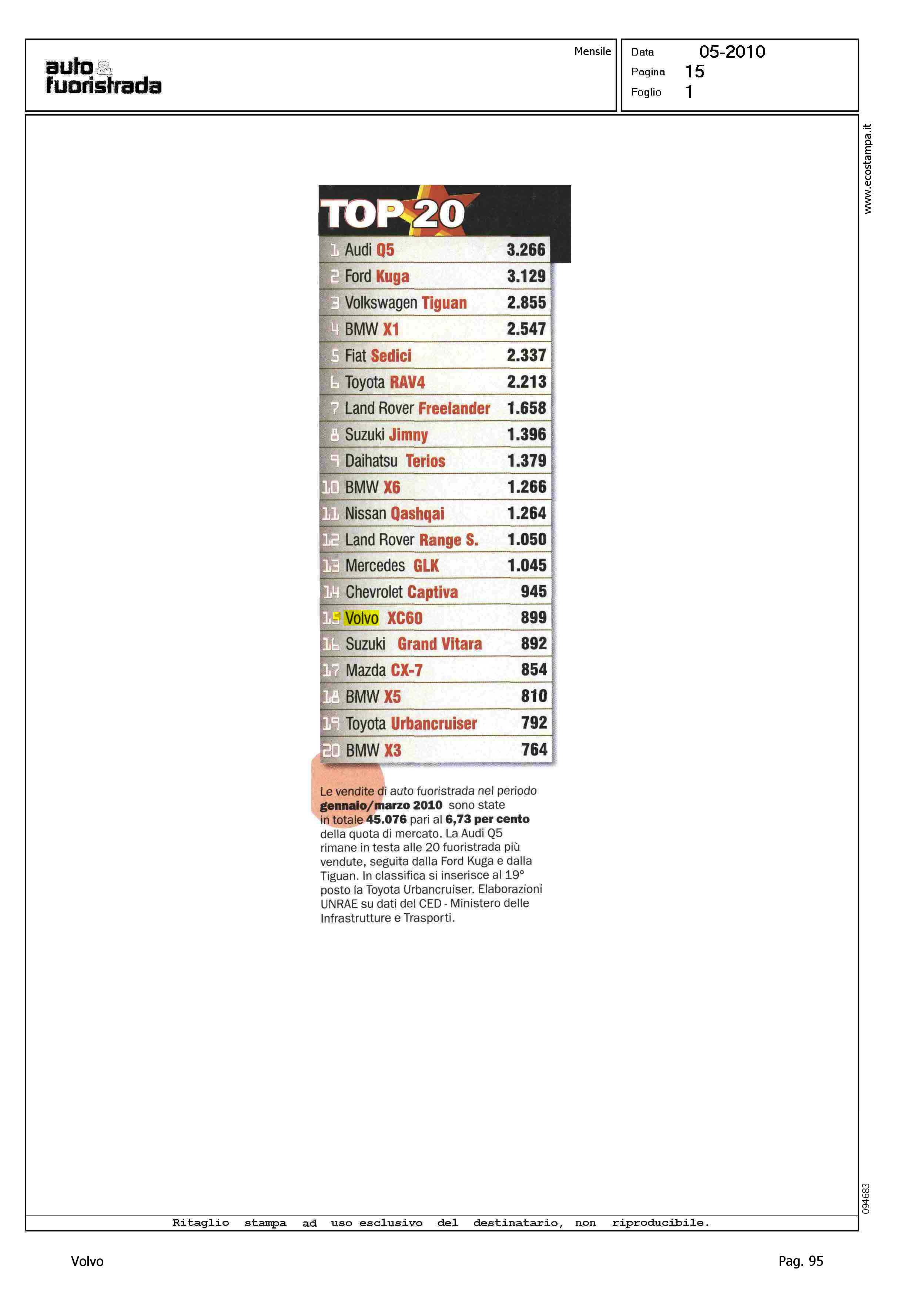 Author: Line: Corporate Model: Corporate Subject: - Title: TOP 20Highlight: TABELLA MERCATO SUV GENNAIO - MARZO, VOLVO XC60: 15ma POSIZIONE, 899 UNITA'