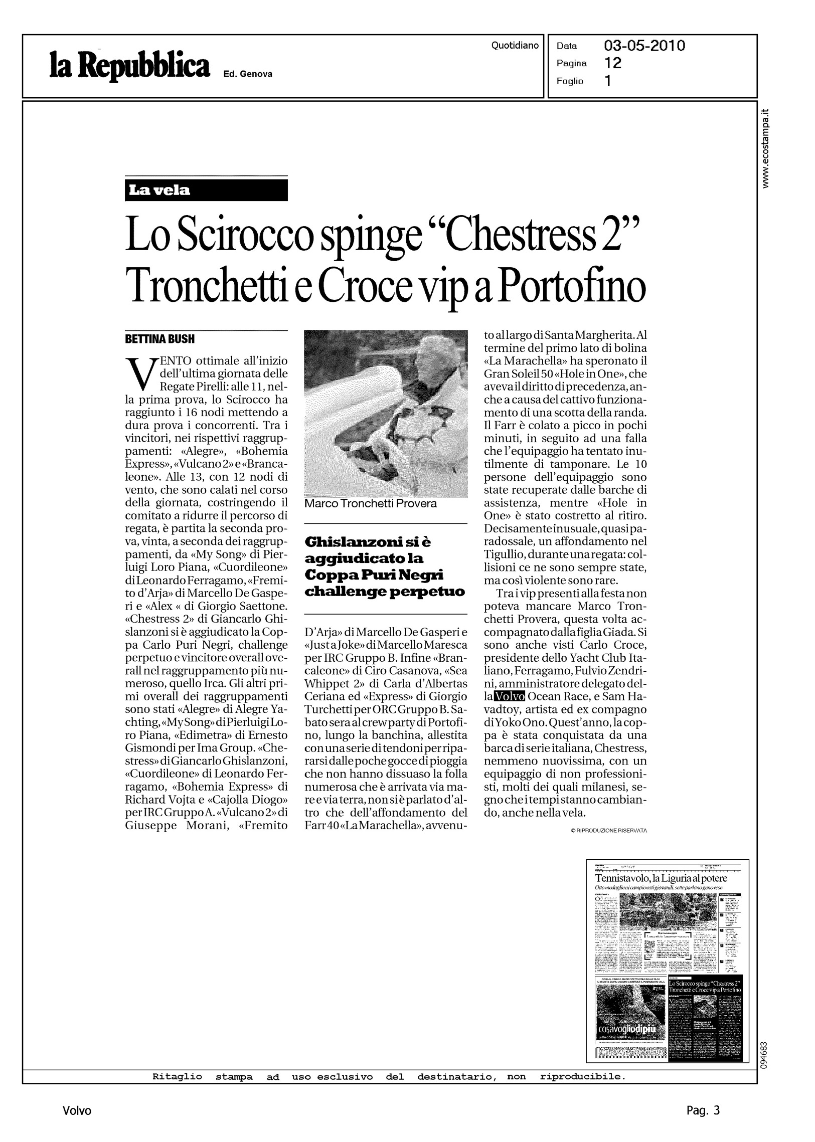 Author: BUSH, BETTINALine: Corporate Model: Corporate Subject: Volvo Ocean Race Title: LA VELAHighlight: (EDIZIONE GENOVA) - ZENDRINI - REGATA PORTOFINO