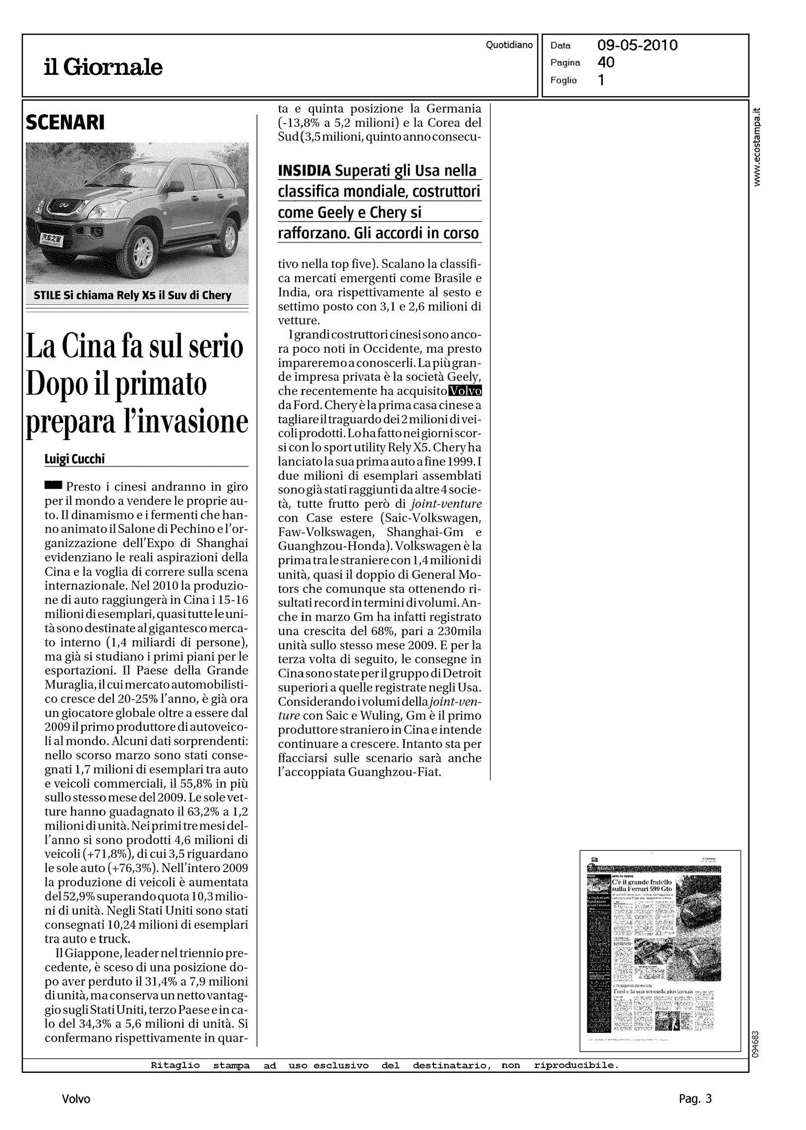 Author: CUCCHI, LUIGILine: Corporate Model: Corporate Subject: - Title: SCENARI - LA CINA FA SUL SERIO - DOPO IL PRIMATO PREPARA L'INVASIONEHighlight: CITAZIONE - SCENARI PRODUZIONE AUTO