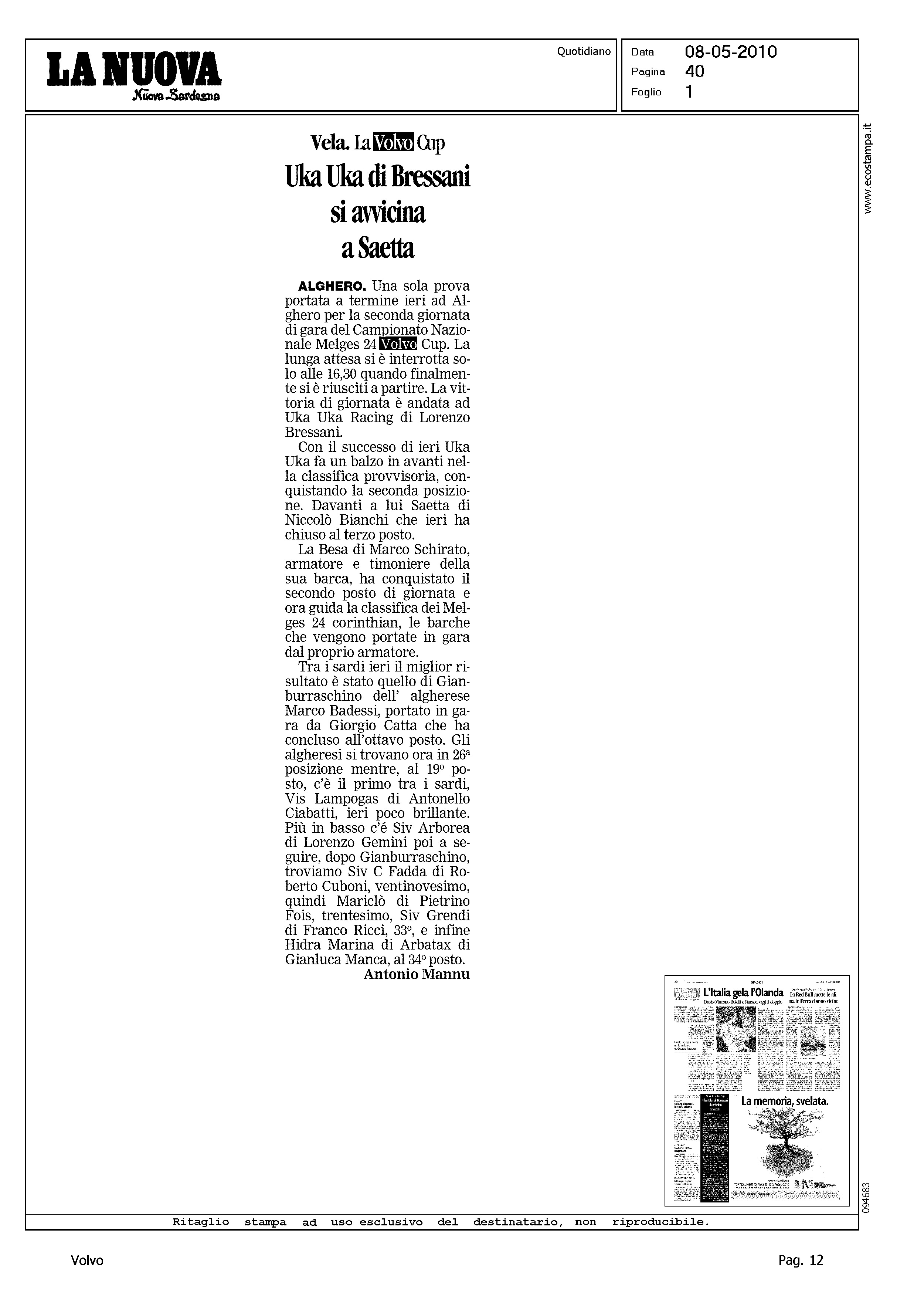Author: MANNU, ANTONIOLine: Corporate Model: Corporate Subject: Volvo Cup Title: VELA. LA VOLVO CUP - UKA UKA DI BRESSANI SI AVVICINA A SAETTAHighlight: REGATA DI ALGHERO
