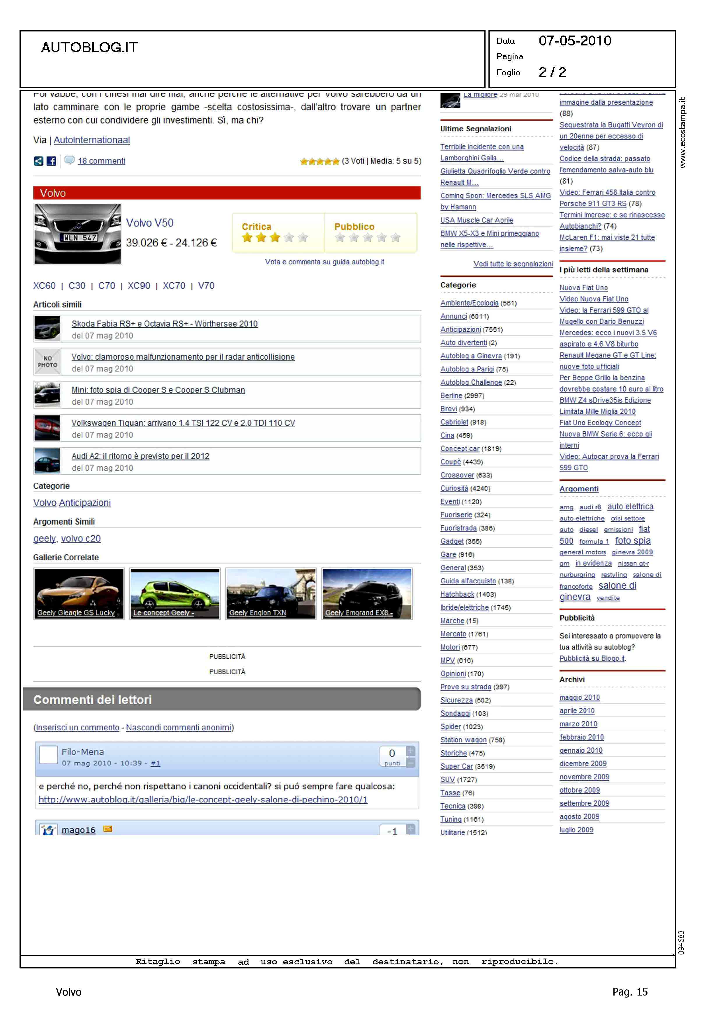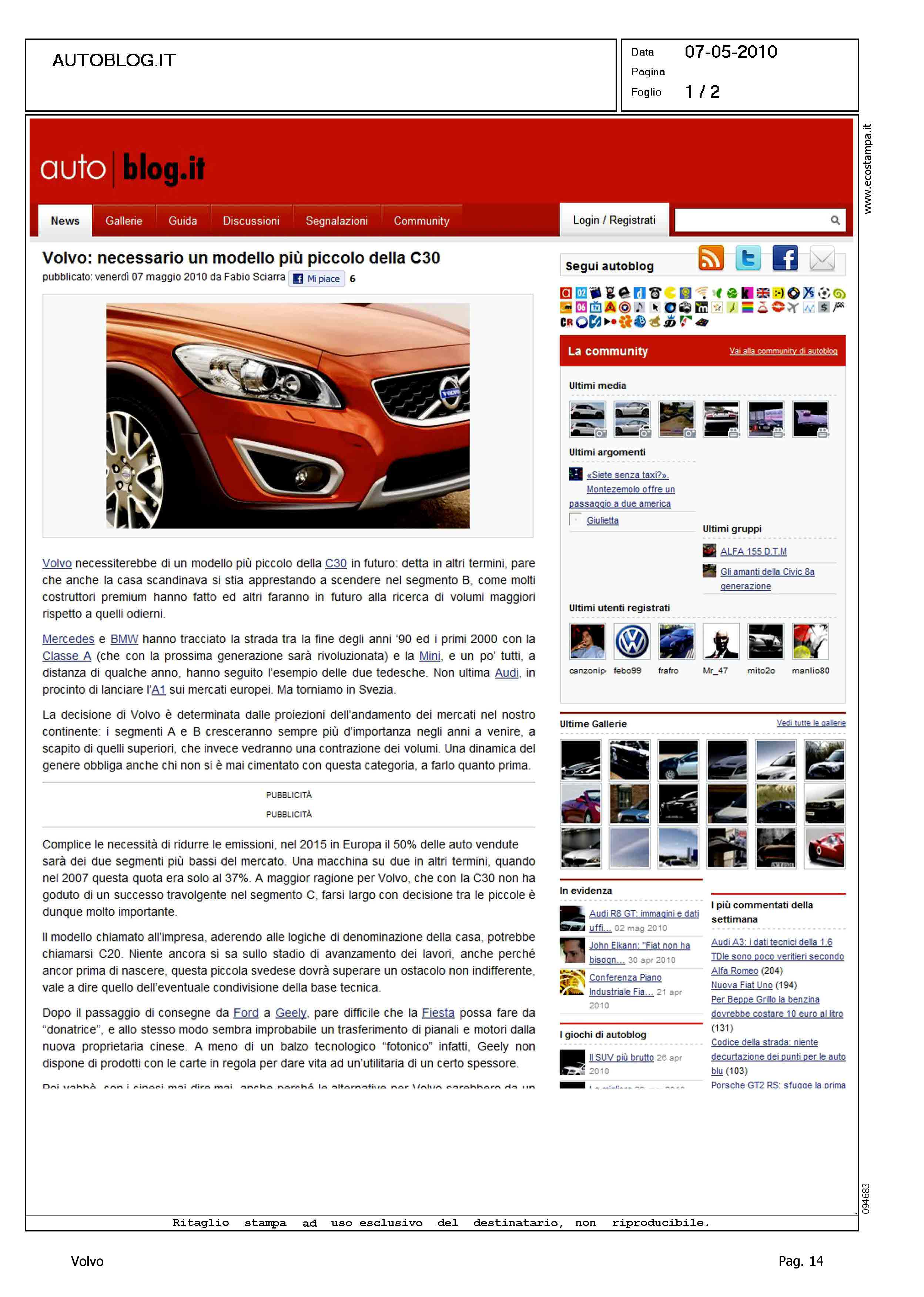 Author: Line: Corporate Model: Corporate Subject: - Title: VOLVO: NECESSARIO UN MODELLO PIU' PICCOLO DELLA C30Highlight: ANTICIPAZIONI SU NUOVO MODELLO PER SEGMENTO B