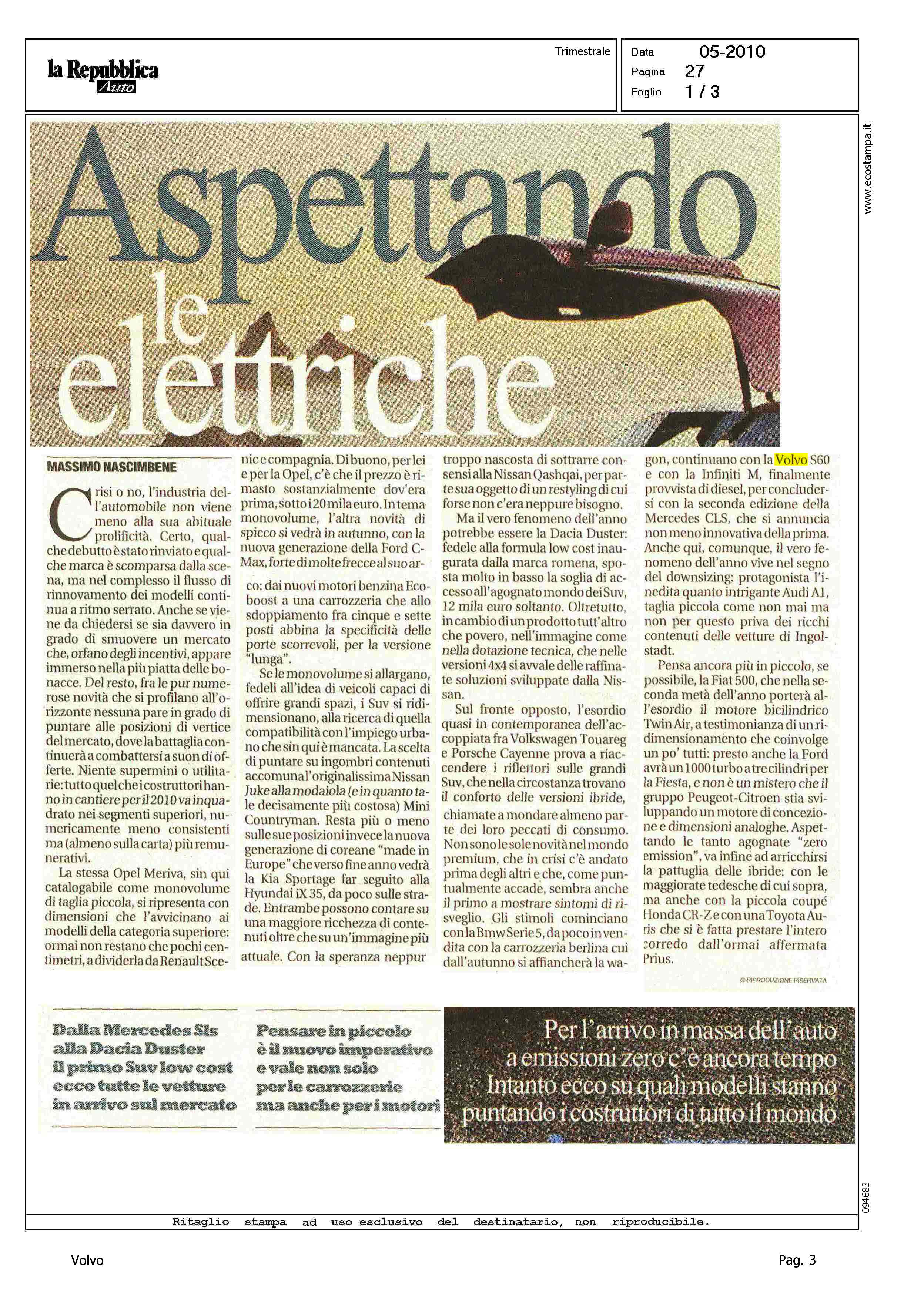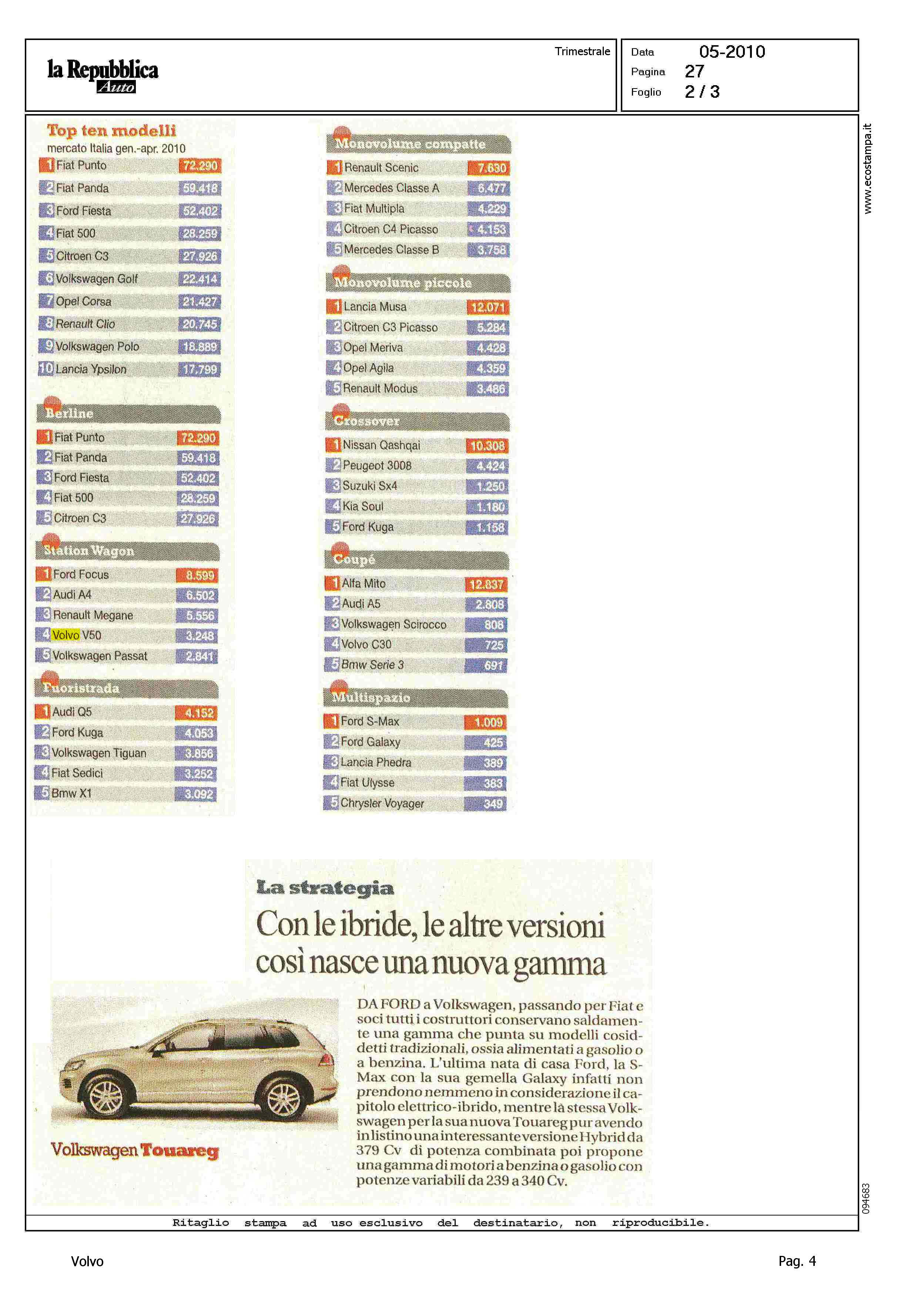 Author: NASCIMBENE, MASSIMOLine: S60 Model: Linea S60 Show Subject: - Title: ASPETTANDO LE ELETTRICHEHighlight: CITAZIONE IN ARTICOLO SU NOVITA' AUTO - TABELLA TOP TEN PER MODELLI - STATION WAGON, VOLVO V50 4°