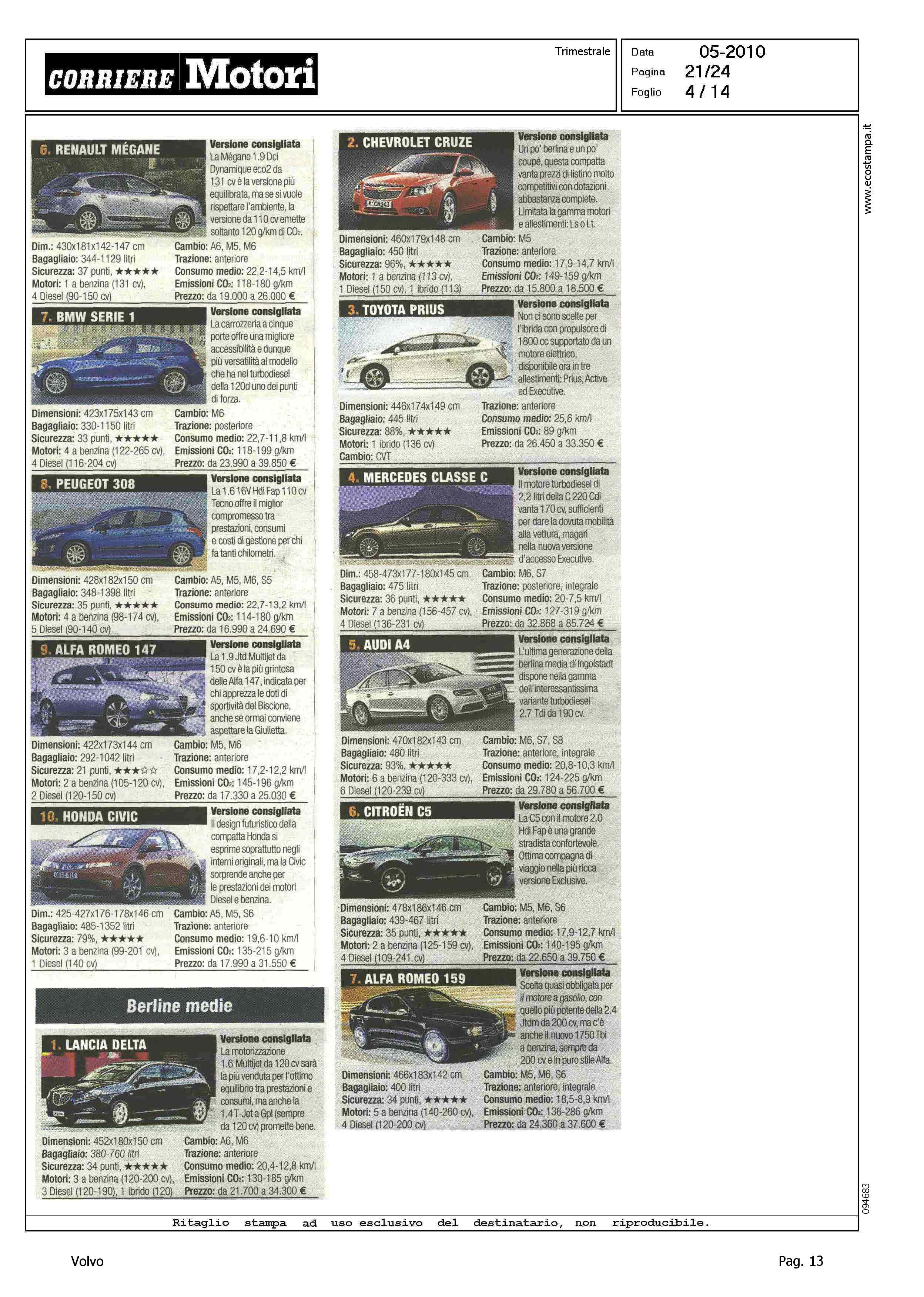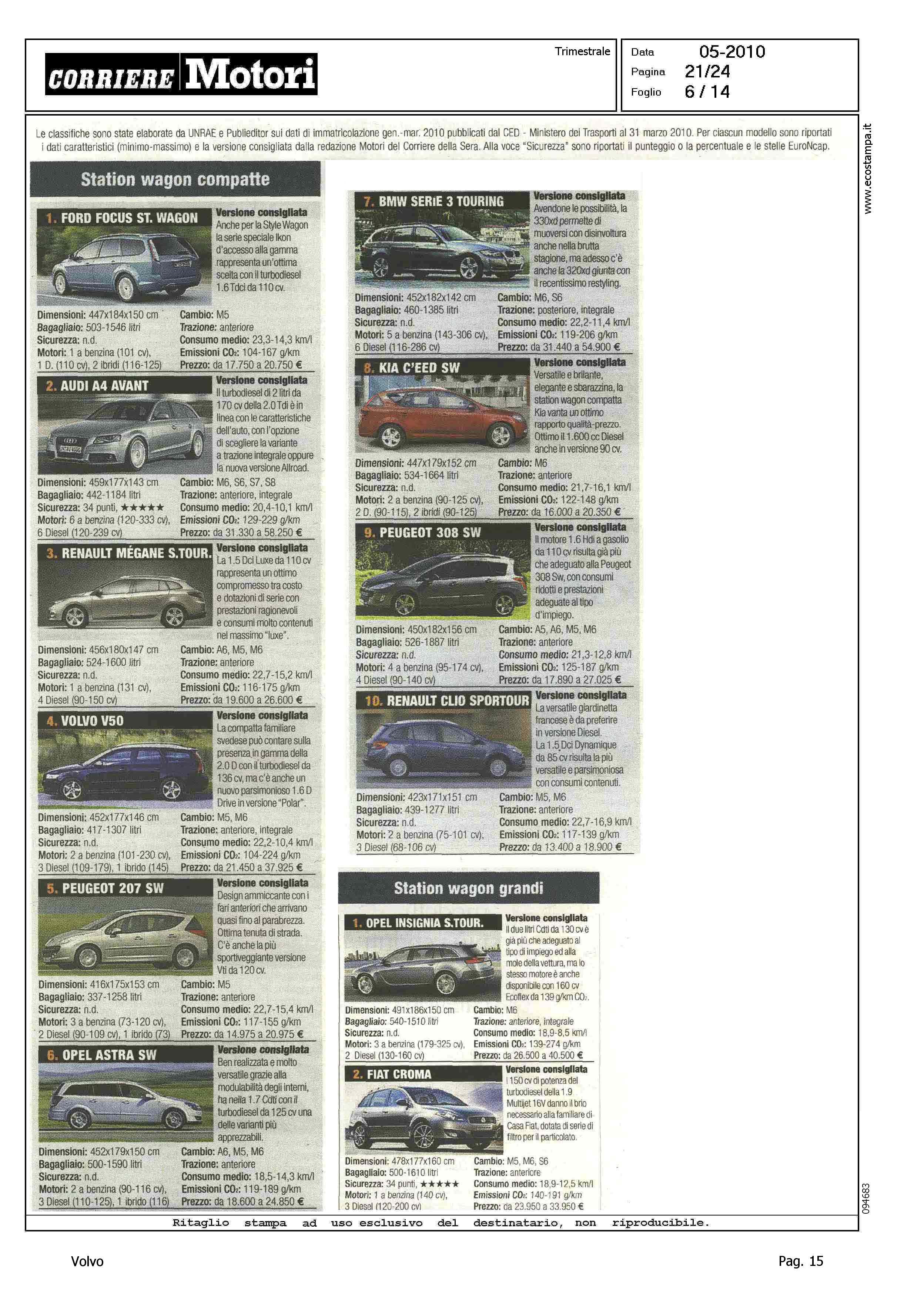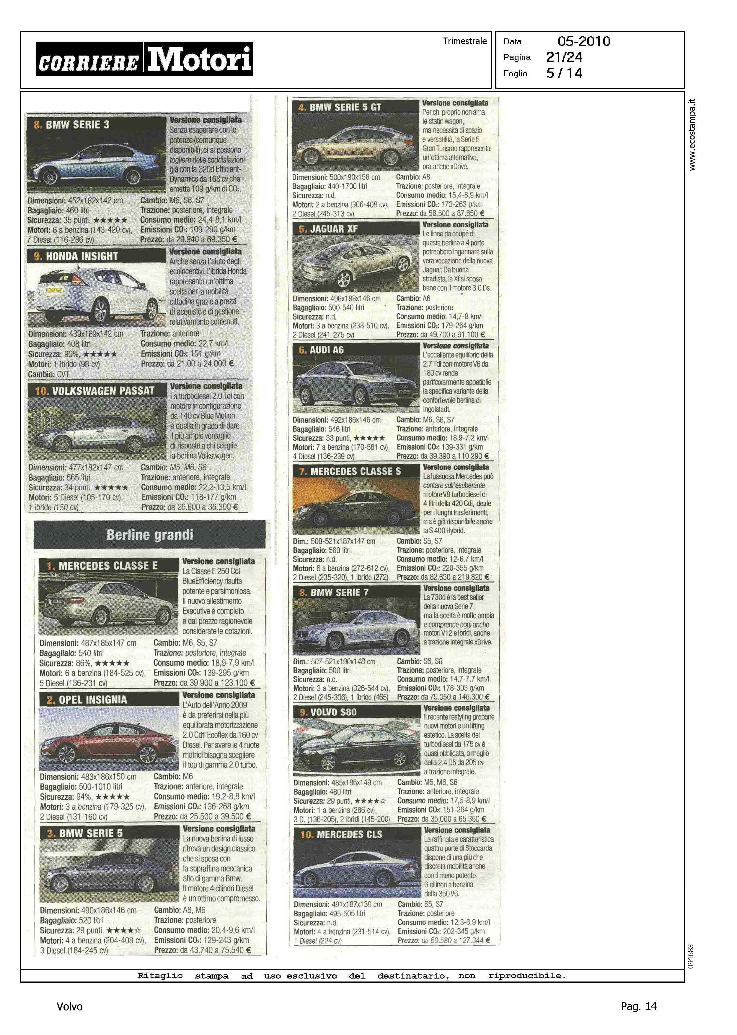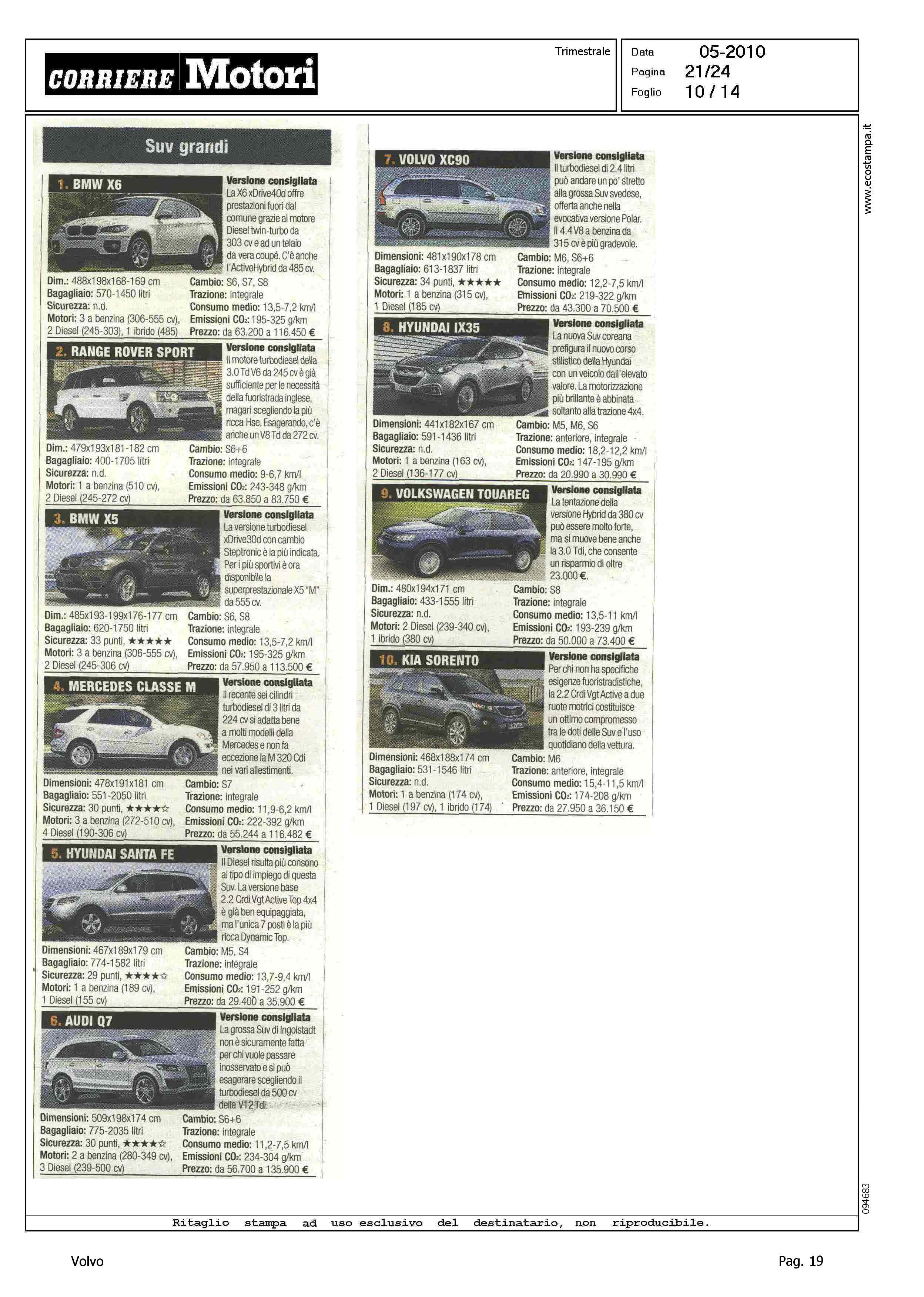 Highlight: CLASSIFICA MODELLI PIU' VENDUTI PER CATEGORIA - BERLINE GRANDI, VOLVO S80, 9° - STATION WAGON COMPATTE, VOLVO V50, 4° - STATION WAGON GRANDI, VOLVO V70, 9° - SUV GRANDI, VOLVO XC90, 7°