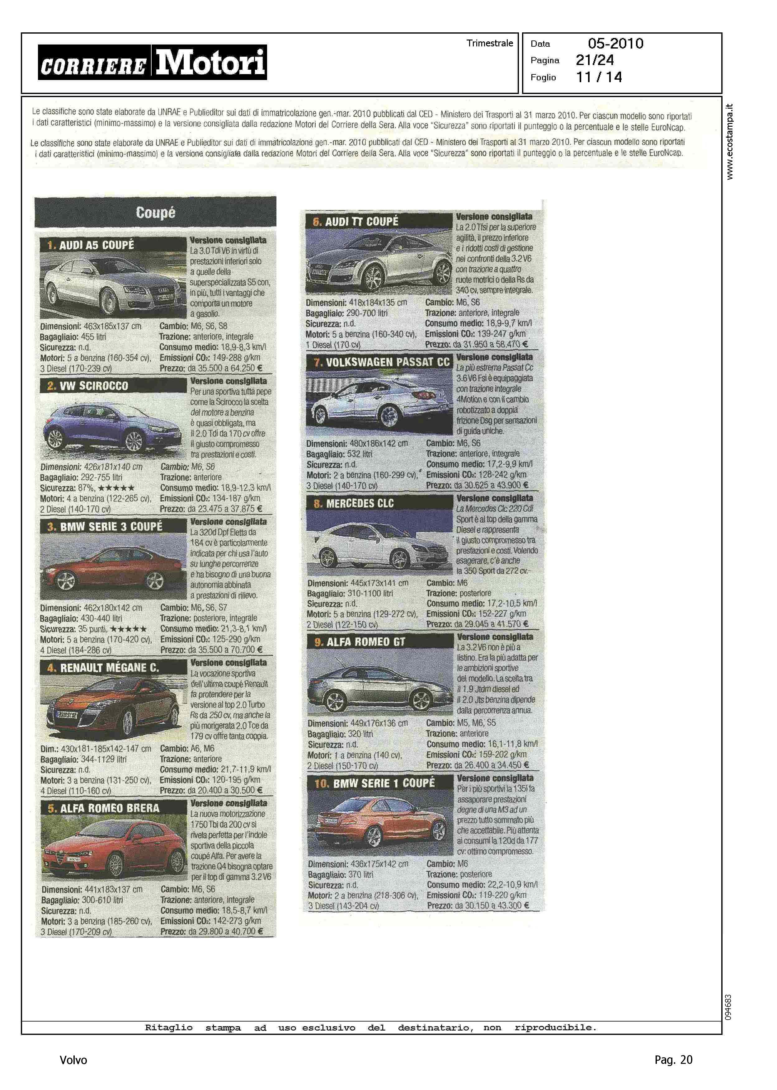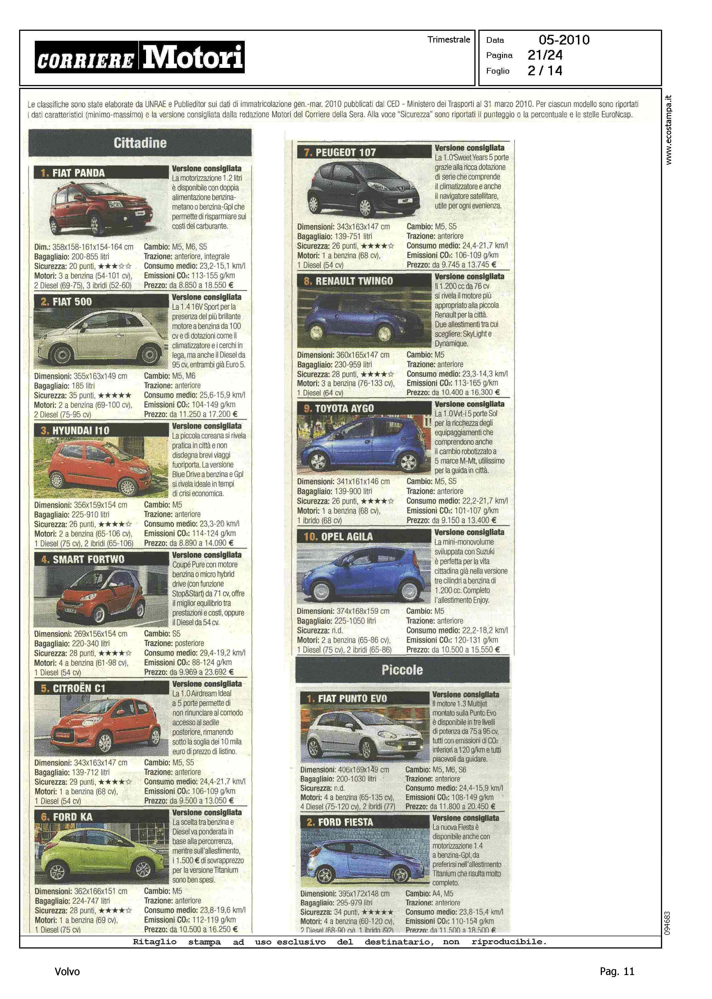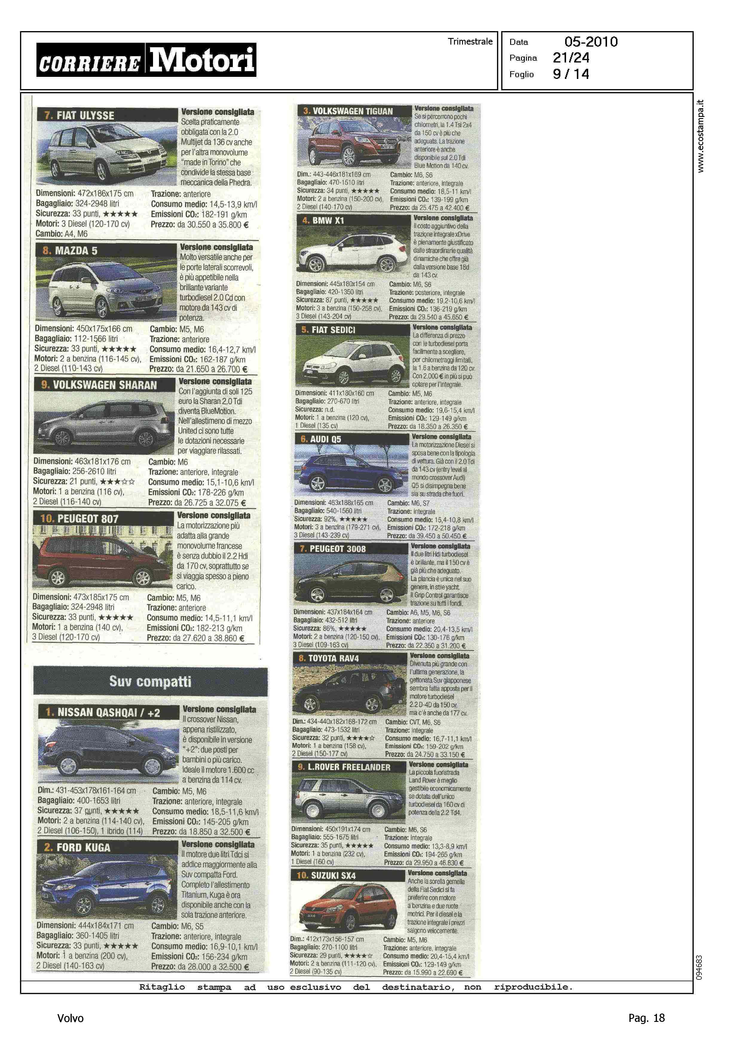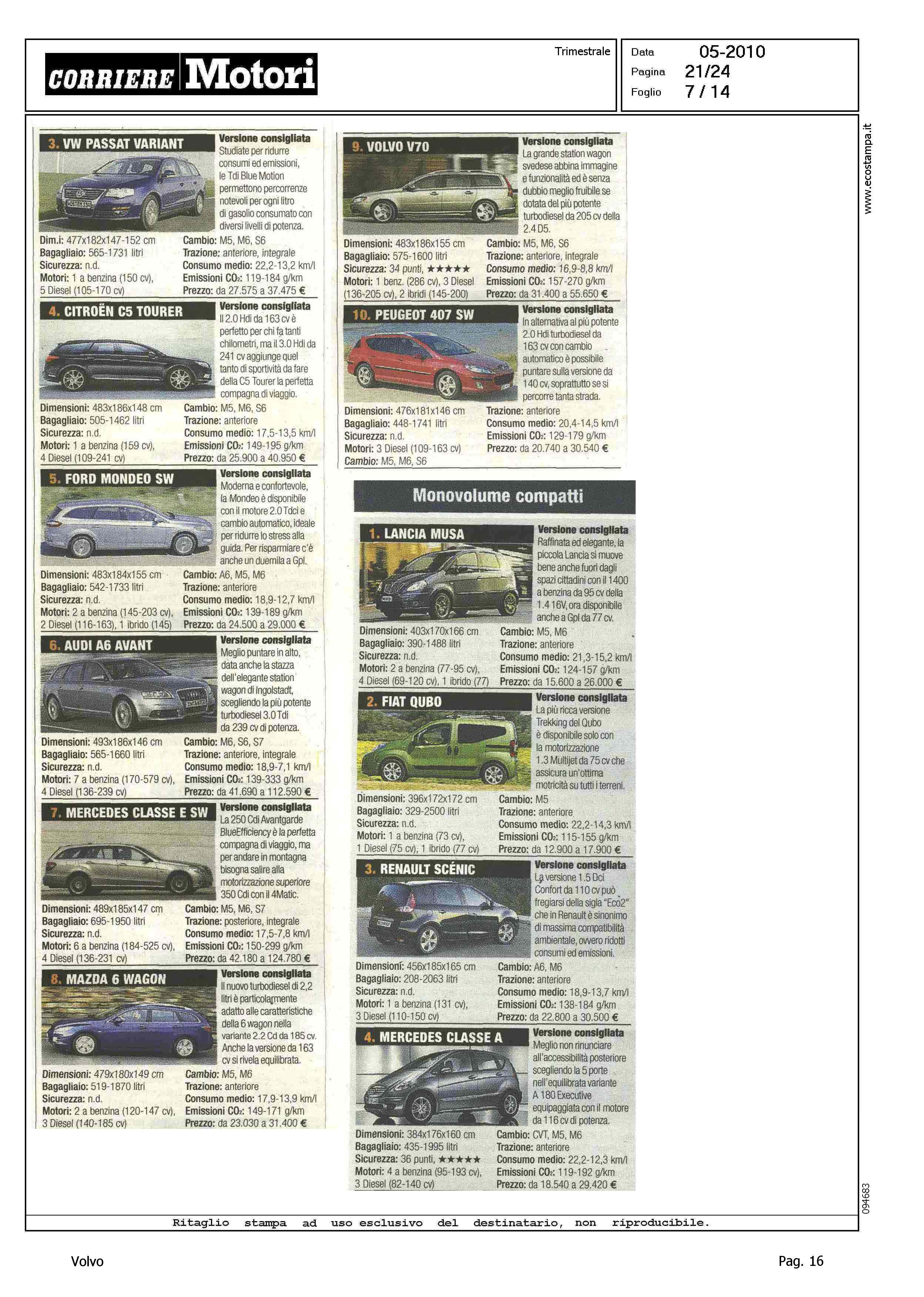 Highlight: CLASSIFICA MODELLI PIU' VENDUTI PER CATEGORIA - BERLINE GRANDI, VOLVO S80, 9° - STATION WAGON COMPATTE, VOLVO V50, 4° - STATION WAGON GRANDI, VOLVO V70, 9° - SUV GRANDI, VOLVO XC90, 7°