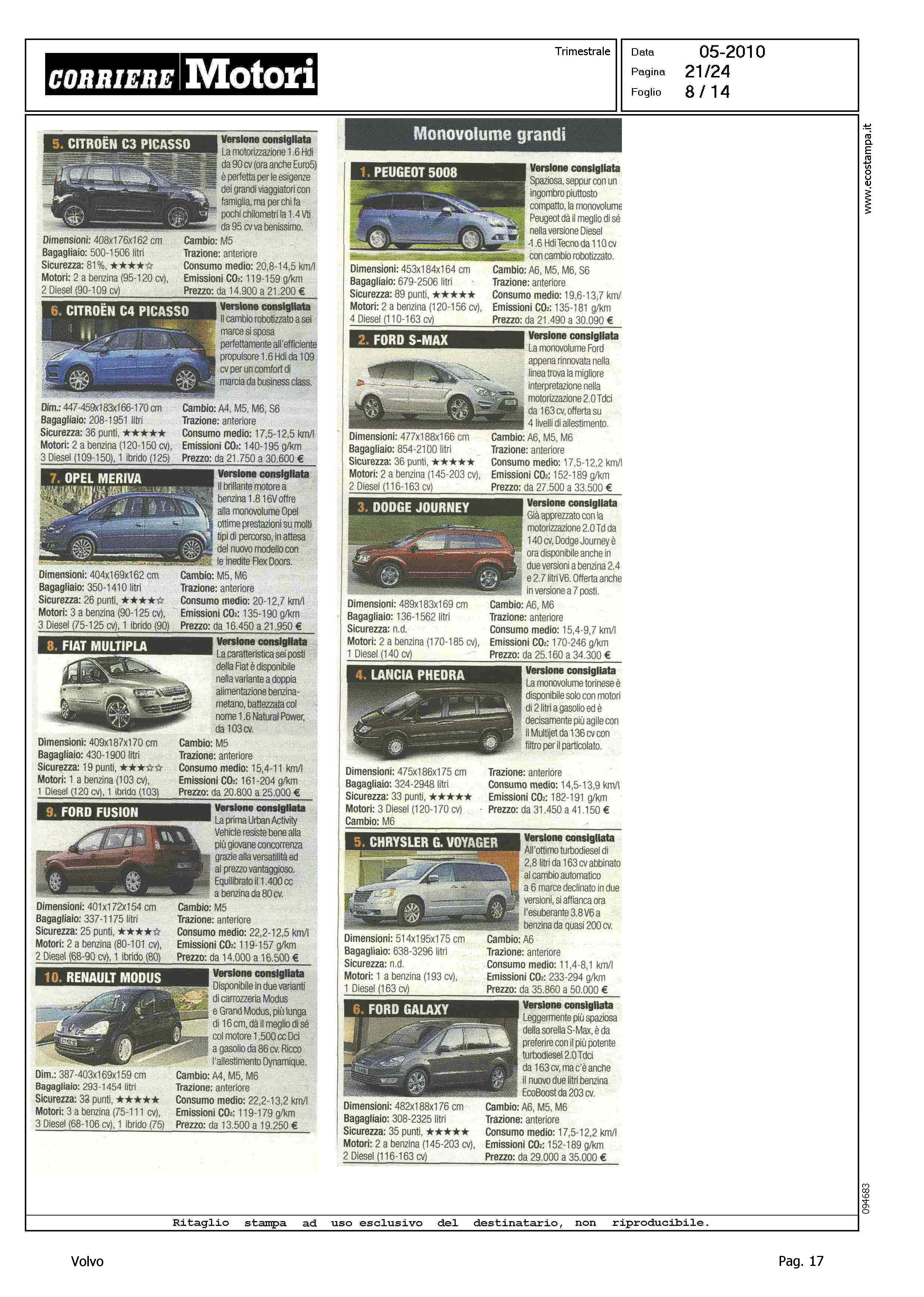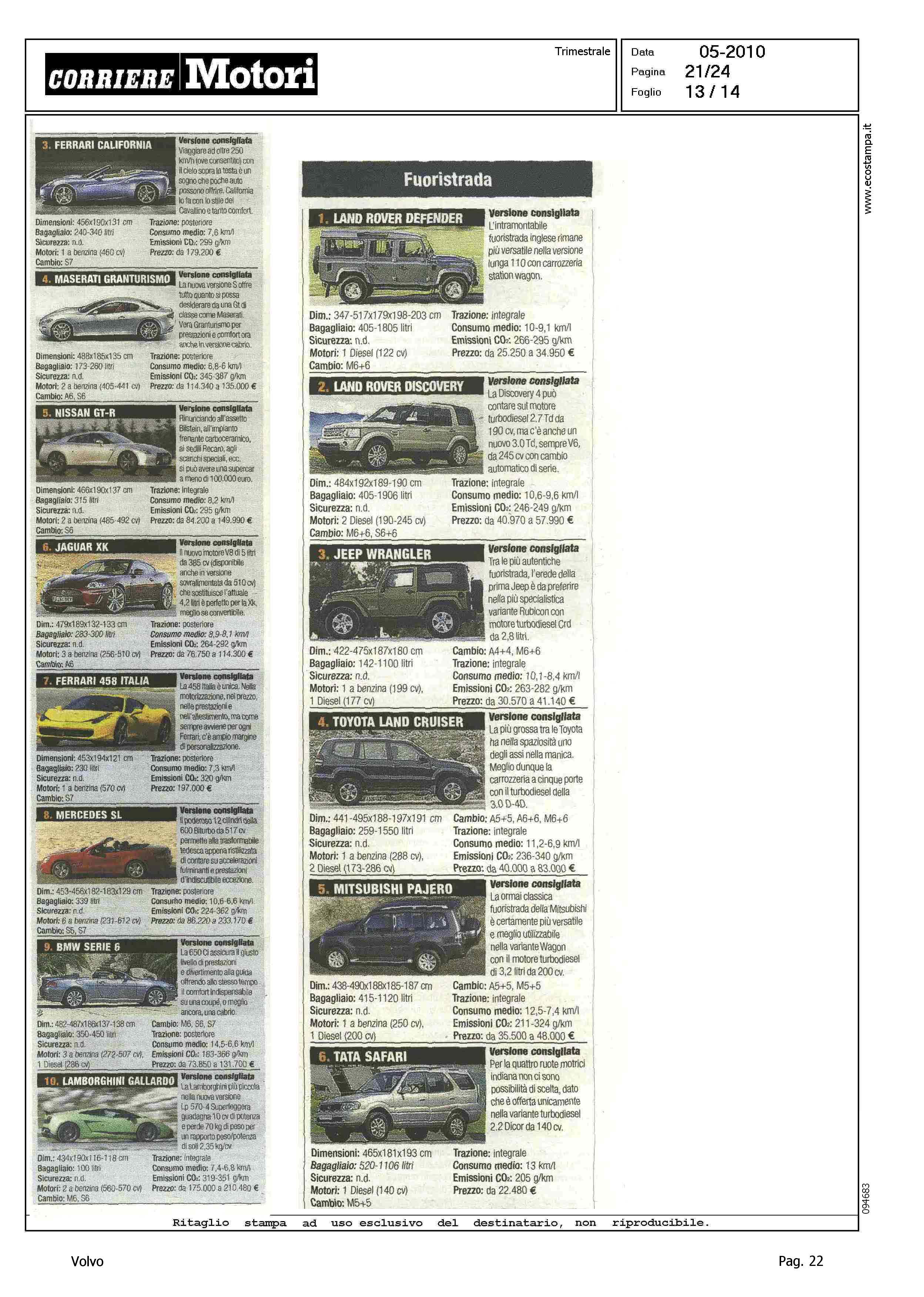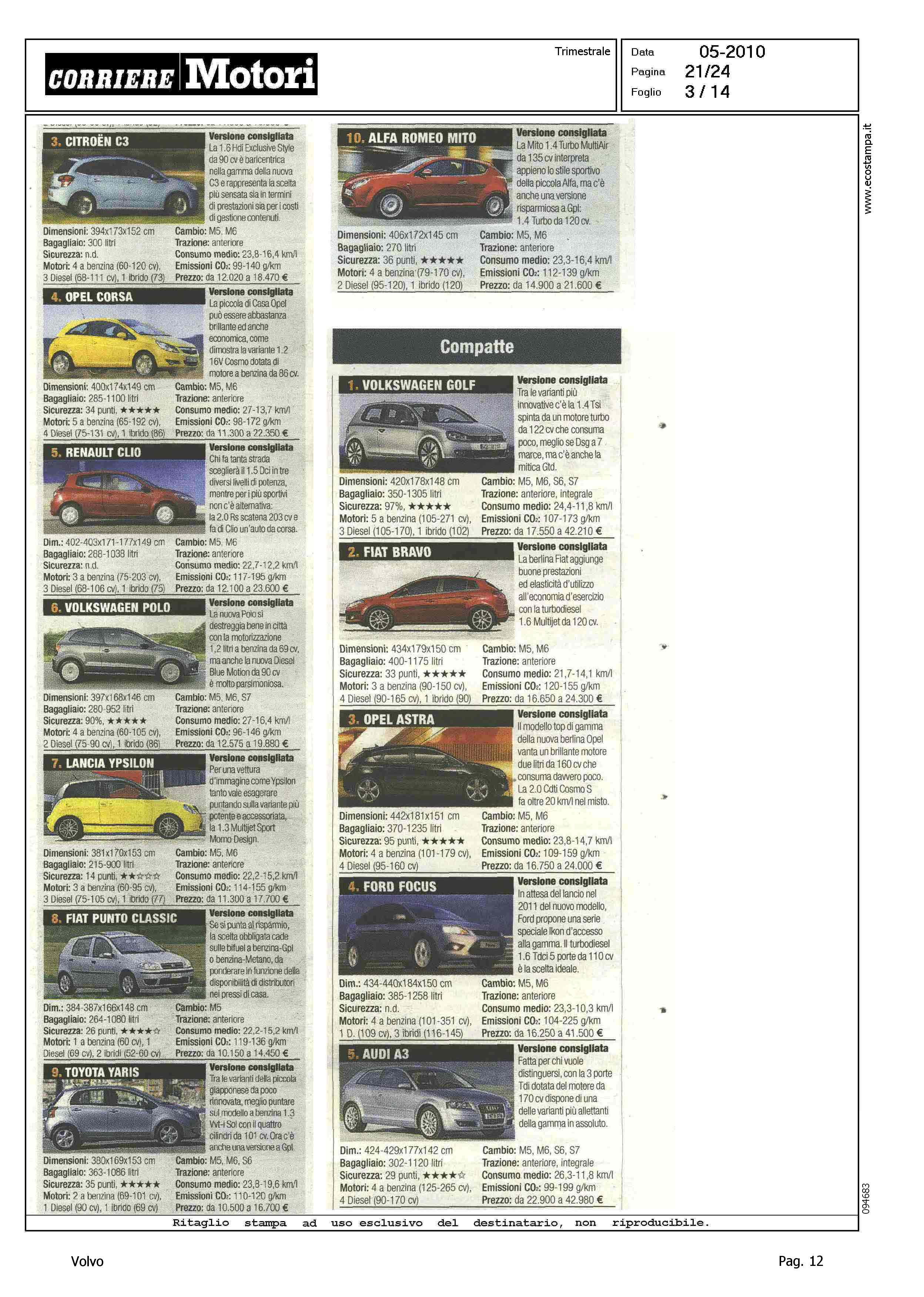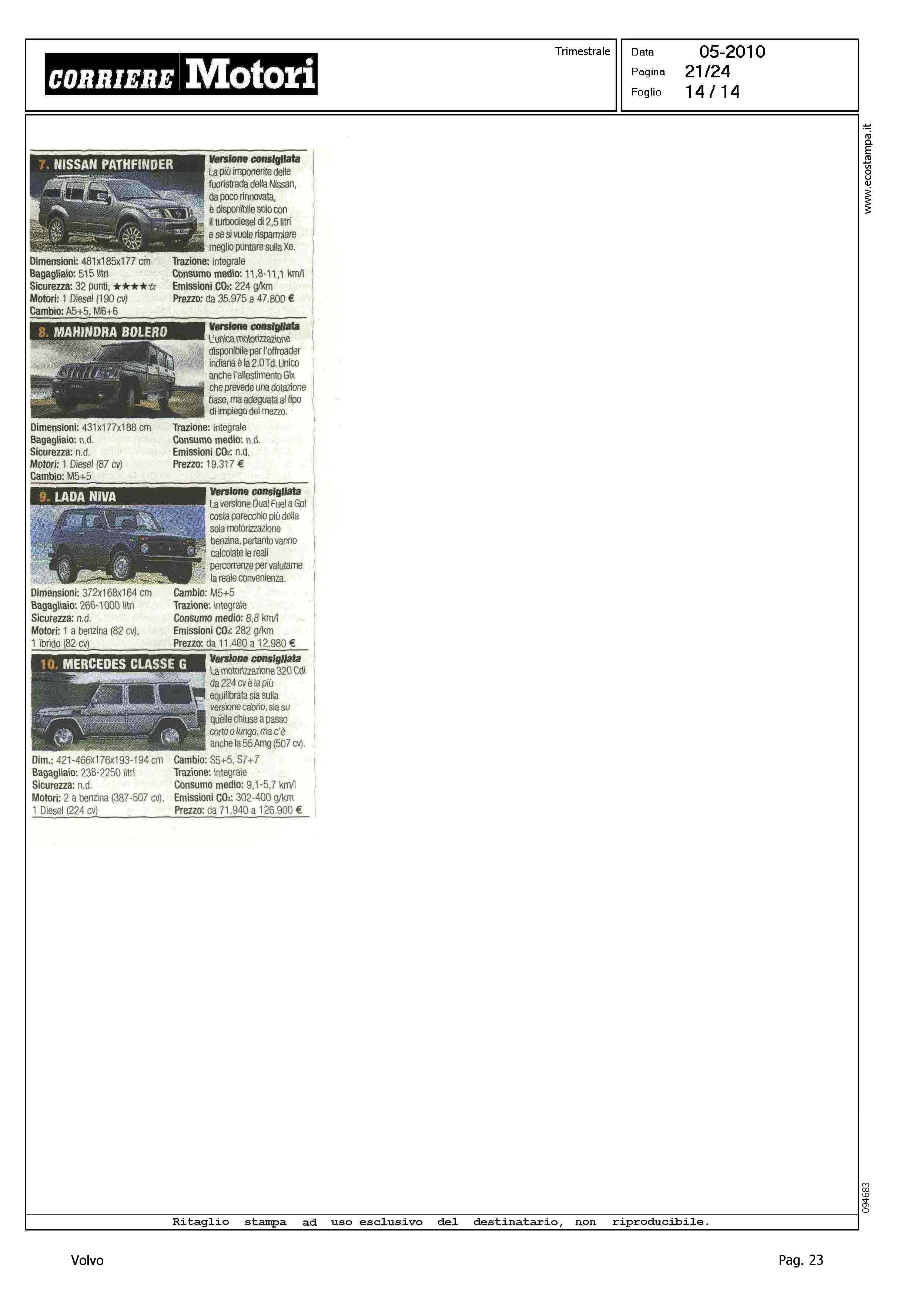 Highlight: CLASSIFICA MODELLI PIU' VENDUTI PER CATEGORIA - BERLINE GRANDI, VOLVO S80, 9° - STATION WAGON COMPATTE, VOLVO V50, 4° - STATION WAGON GRANDI, VOLVO V70, 9° - SUV GRANDI, VOLVO XC90, 7°