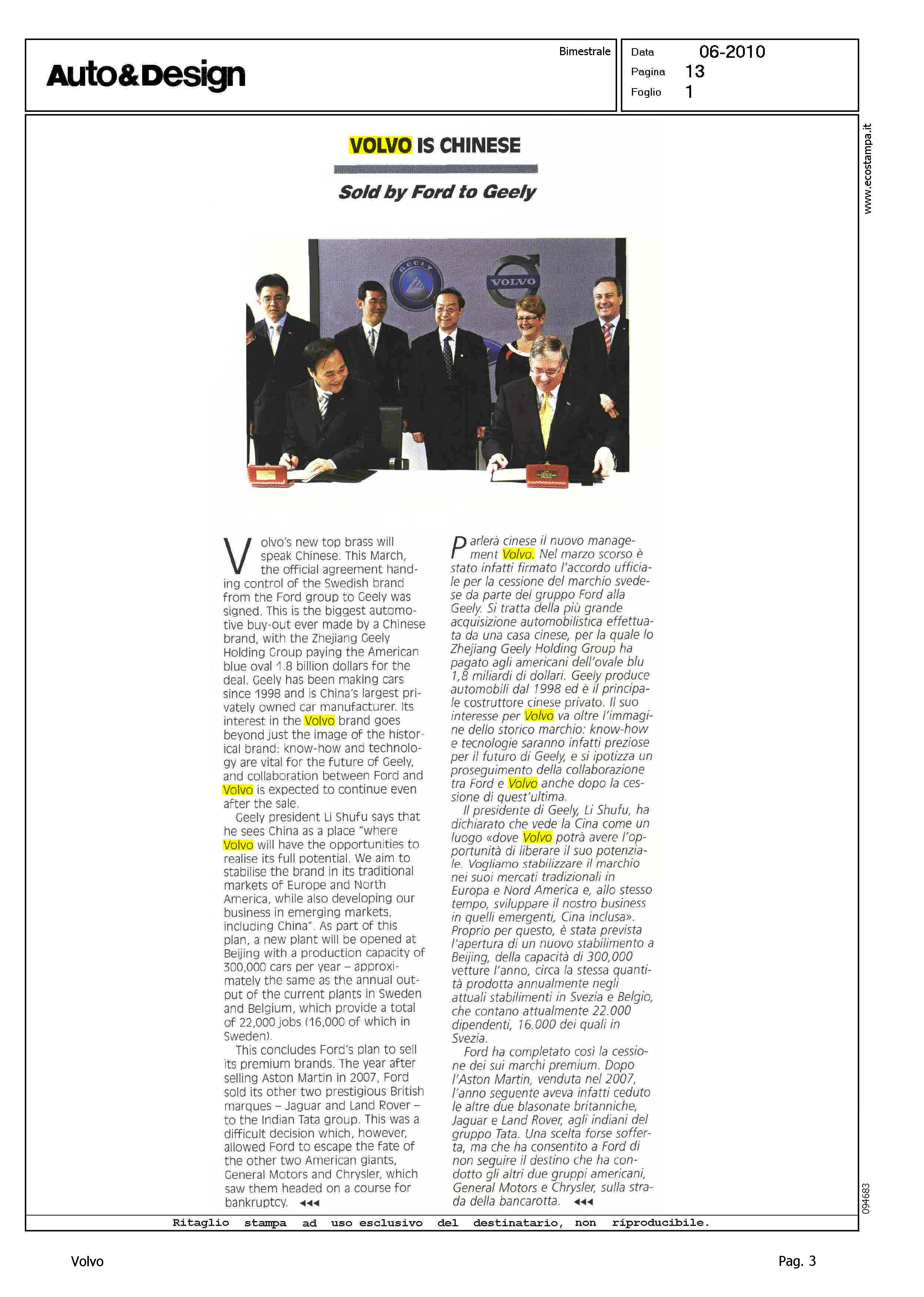 Author: Line: Corporate Model: Corporate Subject: - Title: VOLVO IS CHINESEHighlight: VENDITA VOLVO ALLA GEELY