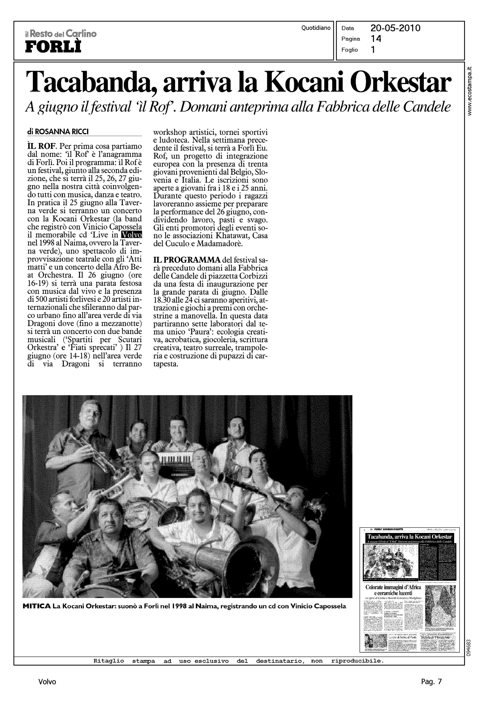 Author: RICCI, ROSANNALine: Corporate Model: Corporate Subject: - Title: TACABANDA, ARRIVA LA KOCANI ORKESTARHighlight: (EDIZIONE FORLI') - CITAZIONE - KOCANI ORKESTAR - LIVE IN VOLVO, CAPOSSELA