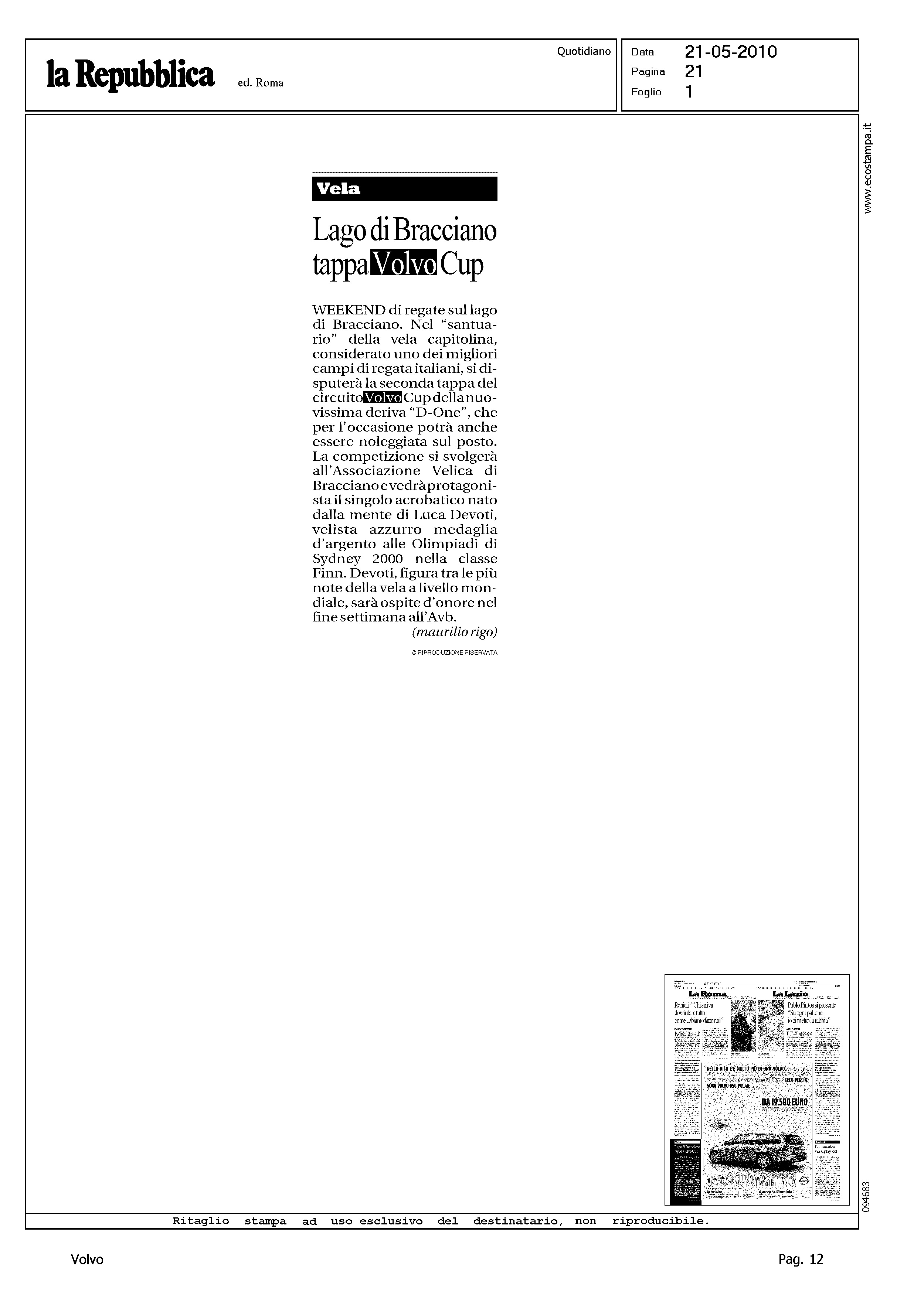 Author: RIGO, MAURILIOLine: Corporate Model: Corporate Subject: Volvo Cup Title: VELA - LAGO DI BRACCIANO TAPPA VOLVO CUPHighlight: (EDIZIONE ROMA) - REGATA DI BRACCIANO