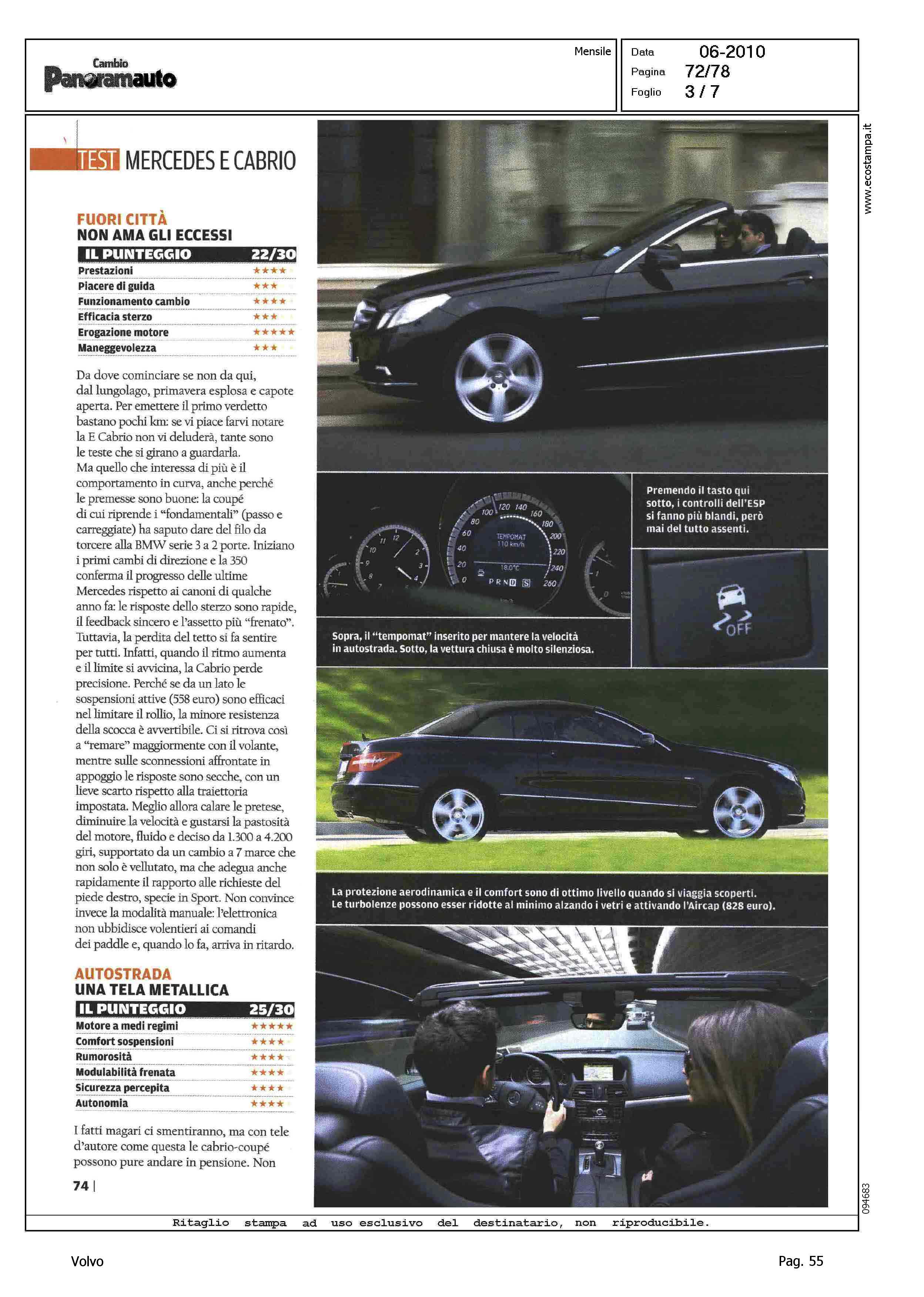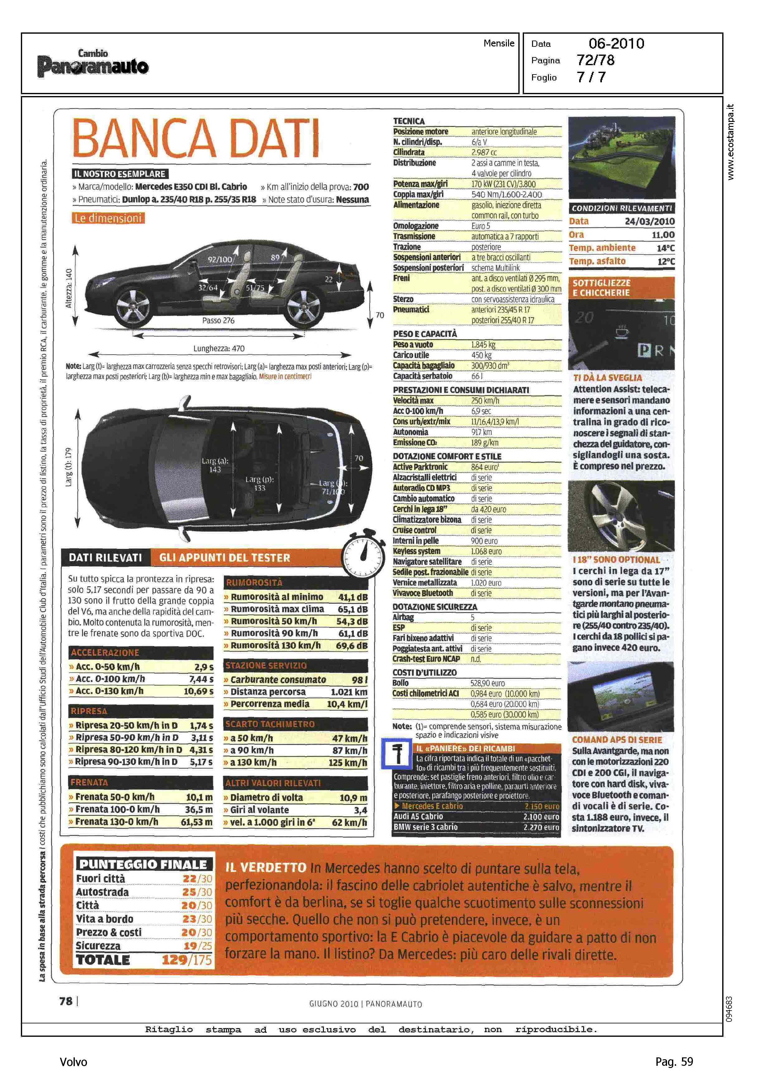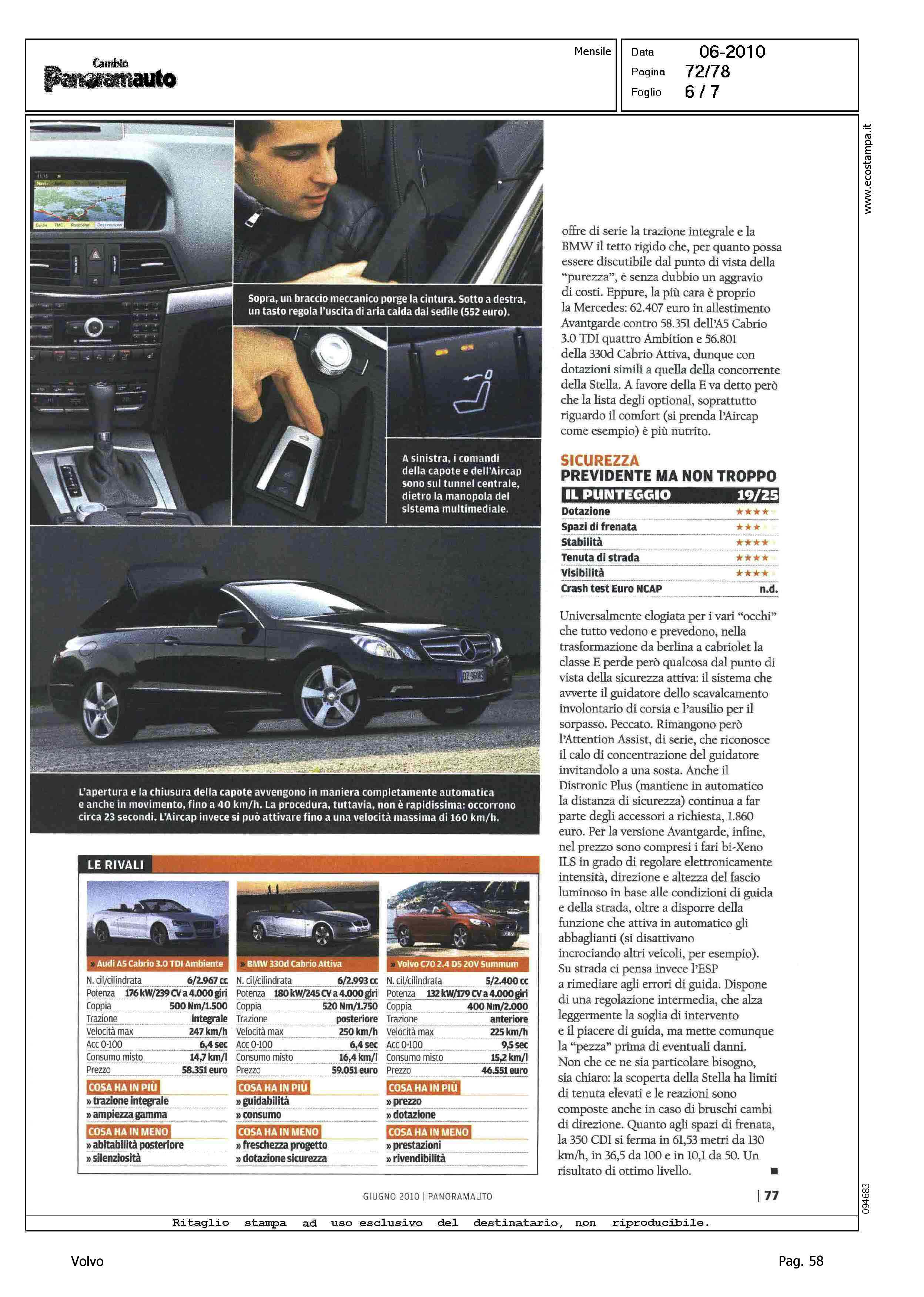 Highlight: VOLVO C70 CONVERTIBLE 2.4 D5 20V SUMMUM - SCHEDA TECNICA - TABELLA "IN PIU', IN MENO" - COMPETITOR VS CLASSE E CABRIO 350 CDI BLUEFFICIENCY AVANTGARDE